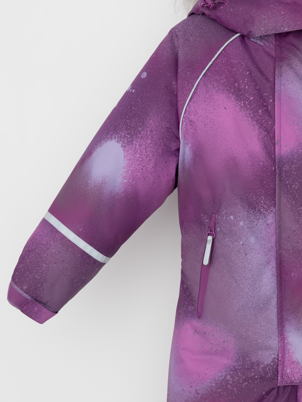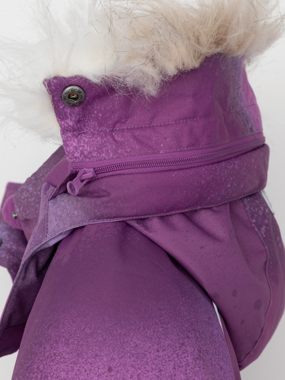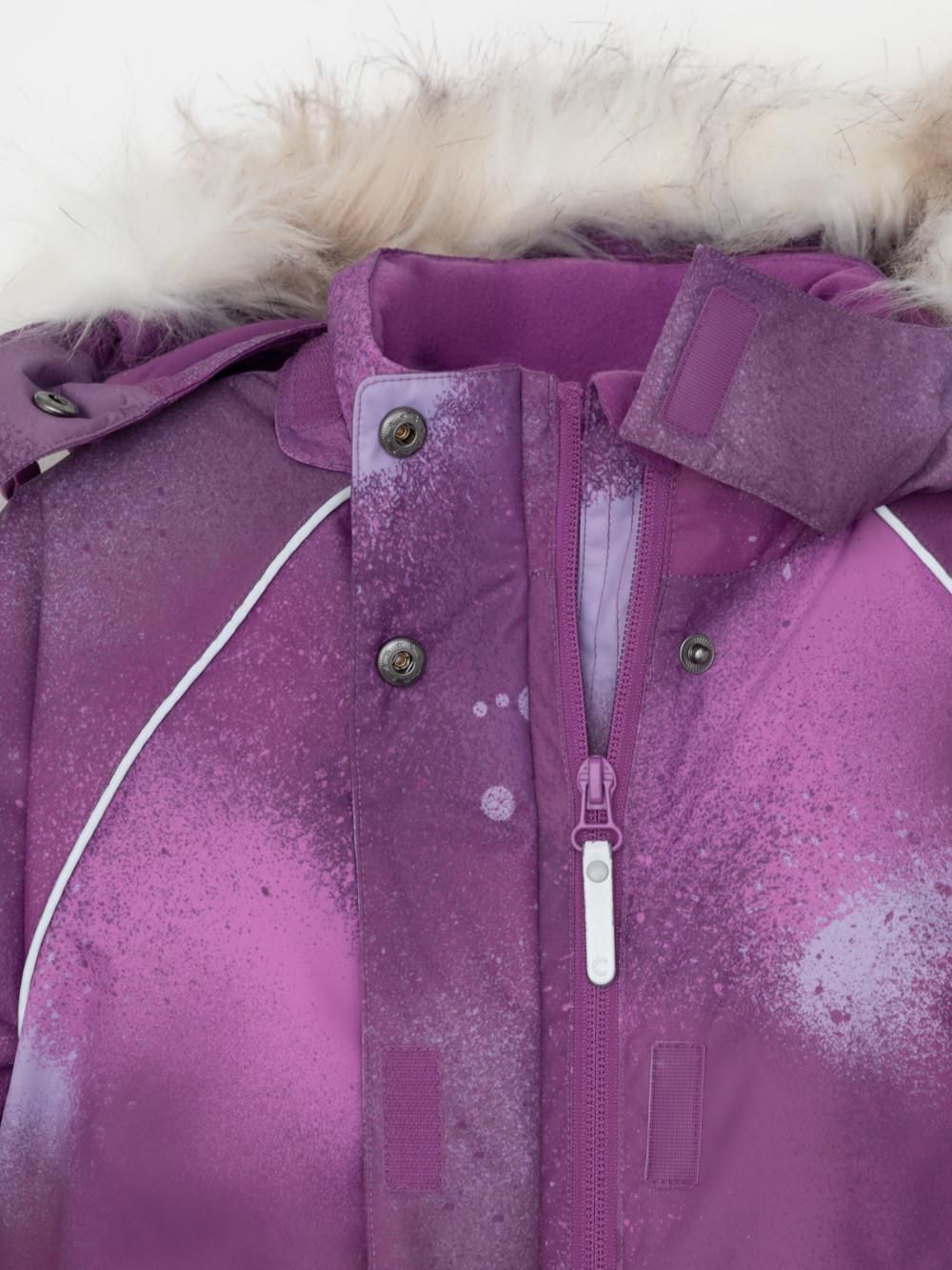 Зимний комбинезон для девочки с утеплителем Fellex®: 250 г/м2 . Выполнен из мембранной ткани с дополнительной тефлоновой обработкой, которая предохраняет изделие от загрязнений и отталкивает влагу. Подклад выполнен из 100% полиэстера Tricot. Комбинезон застёгивается на молнию и внешнюю планку на липучках и кнопках, предусмотрена защита подбородка. Съёмный капюшон имеет эластичную утяжку со стопперами и отстёгивающийся искусственный мех. Резинка по спинке обеспечивает лучшее прилегание. По бокам два кармана на молнии. Эластичные манжеты на рукавах  регулируются по ширине с помощью липучки, по низу изделия - с помощью кнопки. Внутренняя противоснежная юбка защищает обувь от попадания снега и удерживает комбинезон в закреплённом положении, предусмотрены отстёгивающиеся штрипки. Во всех изделиях верхнего ассортимента для безопасности ребёнка предусмотрены светоотражающие элементы.