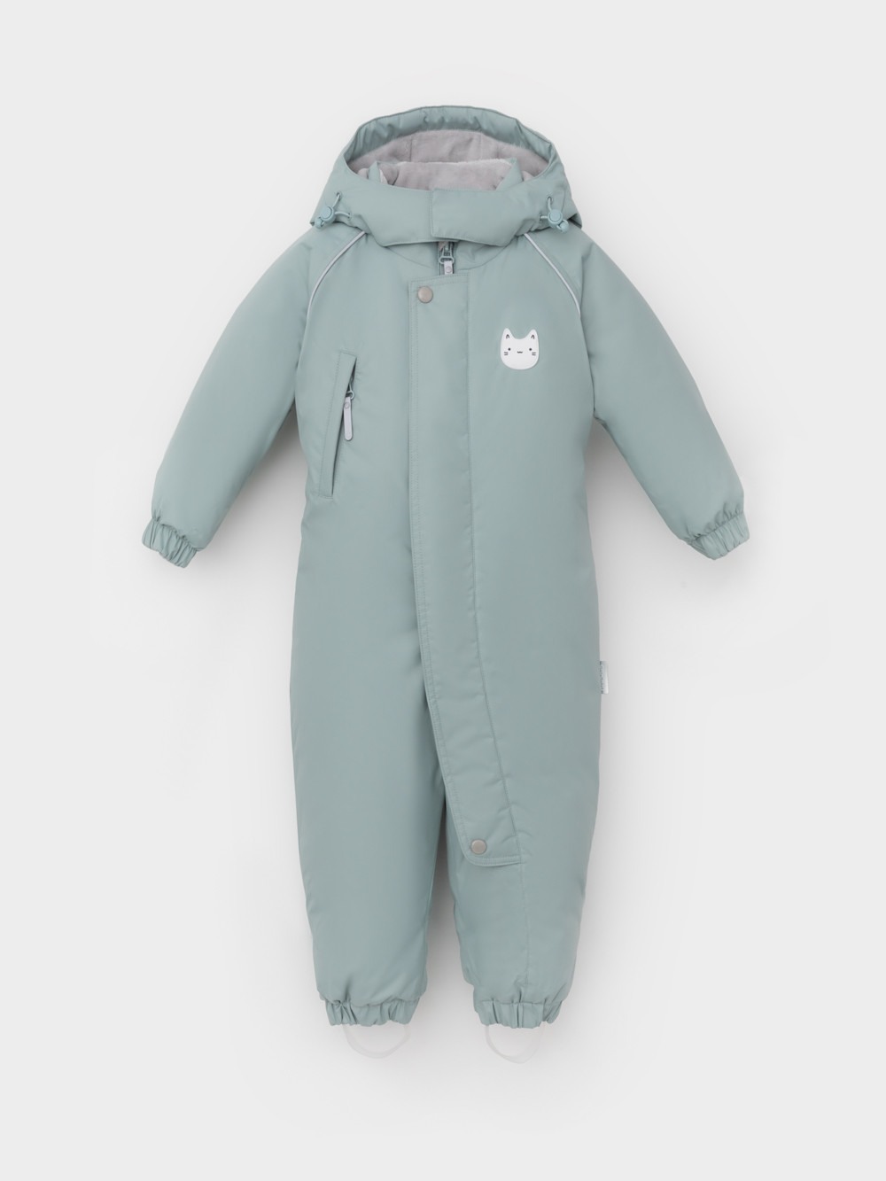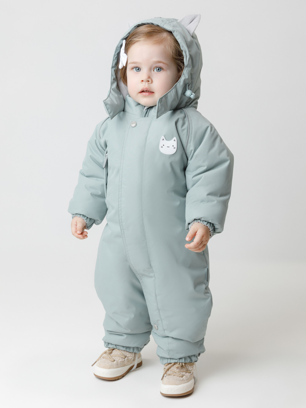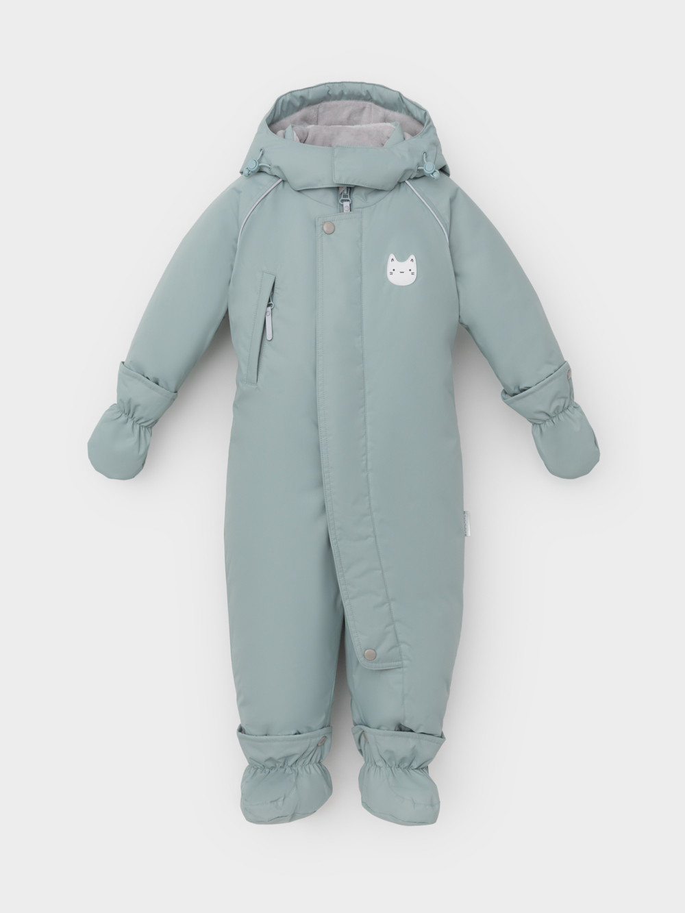 Зимний комбинезон ясельный с утеплителем SEE®: 300 г/м2. Выполнен из мембранной ткани с дополнительной тефлоновой обработкой, которая предохраняет изделие от загрязнений и отталкивает влагу. Подклад выполнен из велюра (80% хлопок, 20% полиэстер) и полиэстера Tricot. Комбинезон застёгивается на молнию и внешнюю планку на липучках, предусмотрена защита подбородка. Несъёмный капюшон имеет эластичную утяжку со стопперами и декоративные ушки. Резинка по спинке для лучшего прилегания. На груди карман на молнии. По рукавам и низу изделия эластичные манжеты, на ножках отстёгивающиеся силиконовые штрипки. До размера 80-86 включительно в комплекте идут рукавицы и пинетки. Во всех изделиях верхнего ассортимента для безопасности ребёнка предусмотрены светоотражающие элементы.