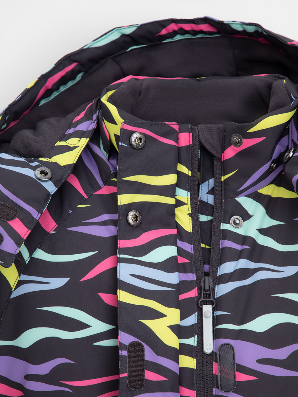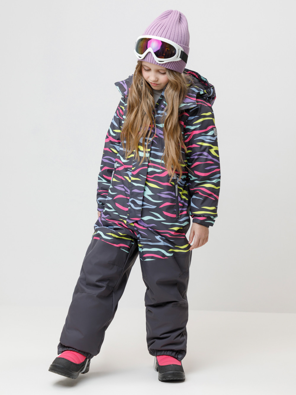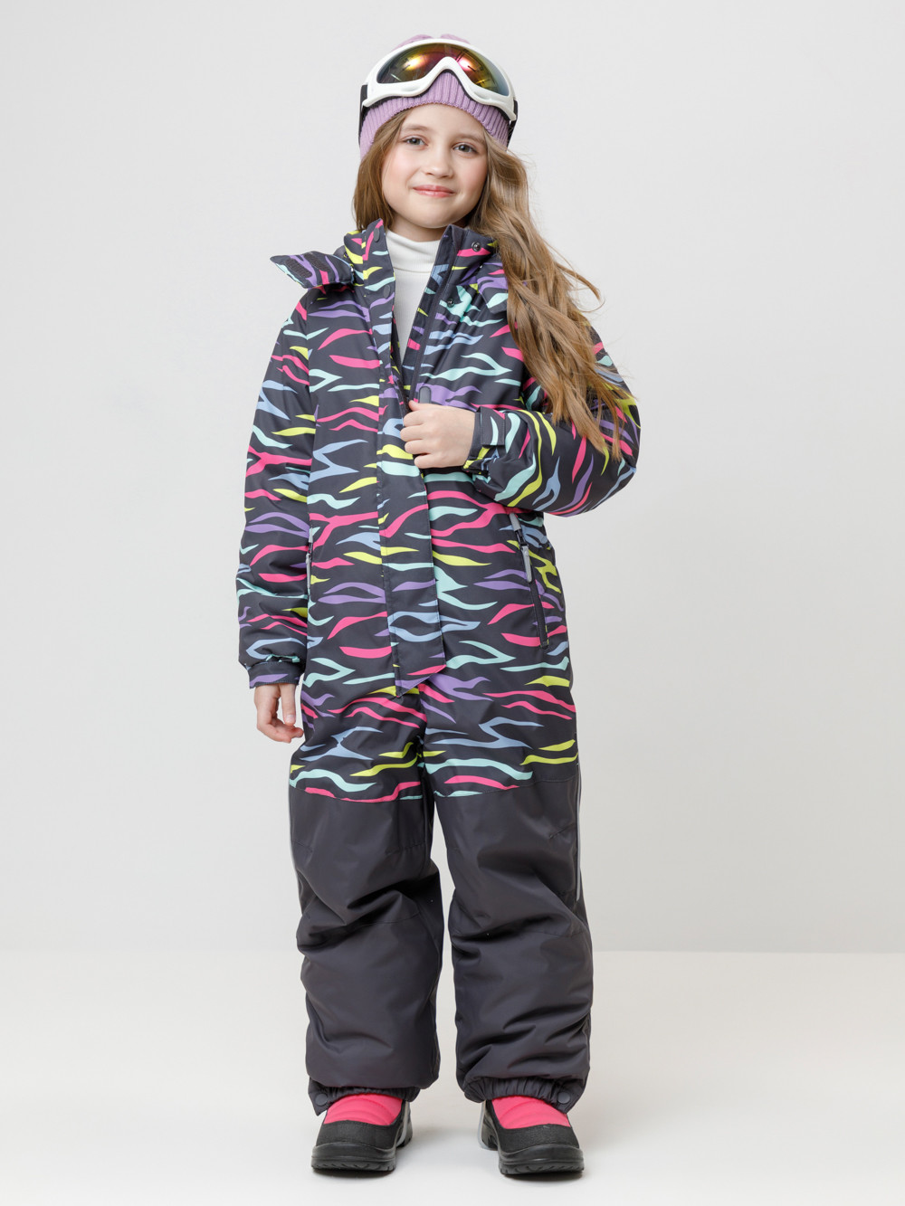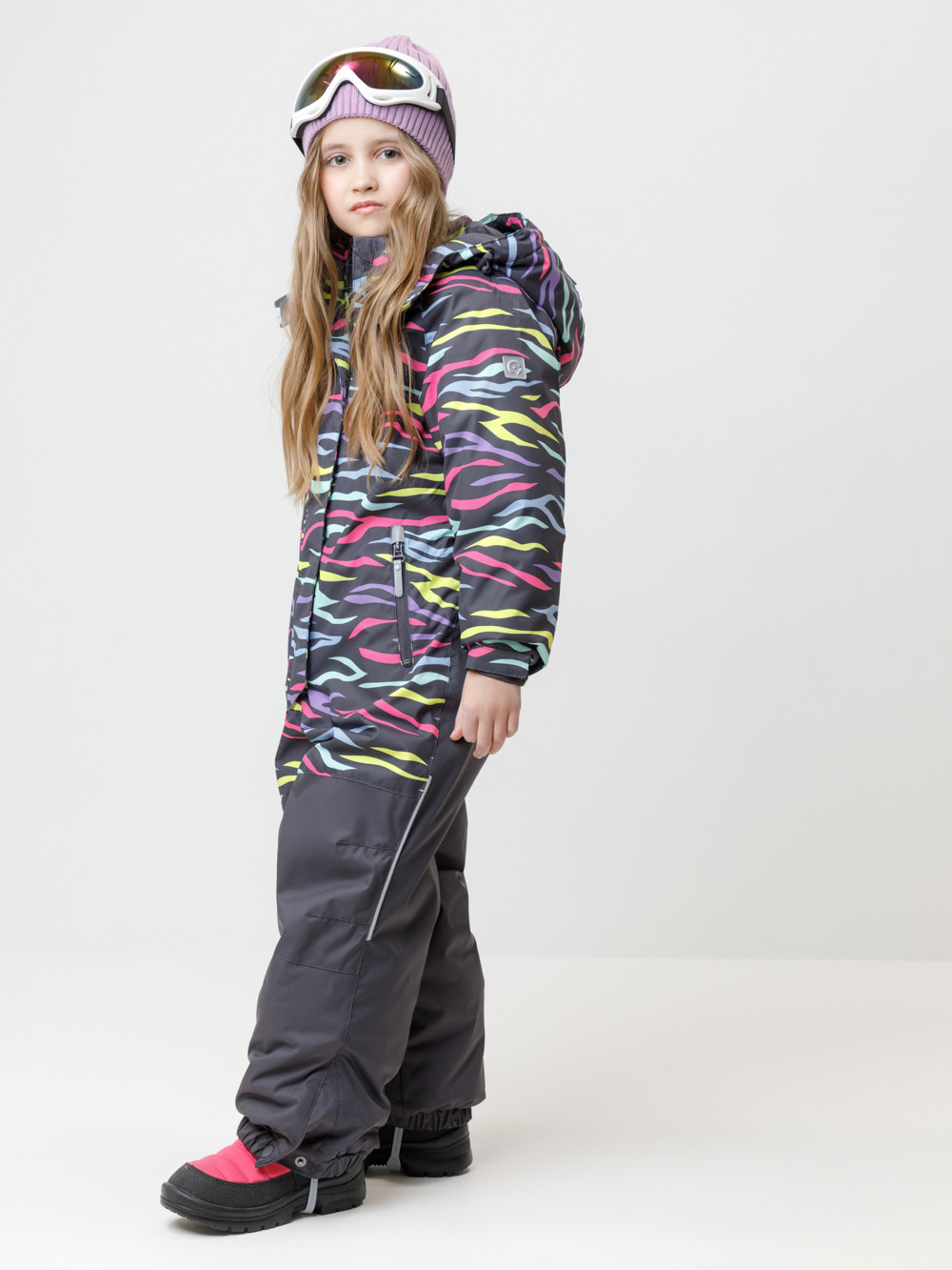 Зимний комбинезон для девочки с утеплителем SEE®: 250 г/м2 . Выполнен из мембранной ткани с дополнительной тефлоновой обработкой, которая предохраняет изделие от загрязнений и отталкивает влагу. Подклад выполнен из 100% полиэстера Tricot. Комбинезон застёгивается на молнию и внешнюю планку на липучках и кнопках, предусмотрена защита подбородка. Съёмный капюшон имеет эластичную утяжку со стопперами. Резинка по спинке обеспечивает лучшее прилегание. По бокам два кармана на молнии. Эластичные манжеты на рукавах  регулируются по ширине с помощью липучки, по низу изделия - с помощью кнопки. Внутренняя противоснежная юбка защищает обувь от попадания снега и удерживает комбинезон в закреплённом положении, предусмотрены отстёгивающиеся штрипки до размера 116-122 включительно. Во всех изделиях верхнего ассортимента для безопасности ребёнка предусмотрены светоотражающие элементы.