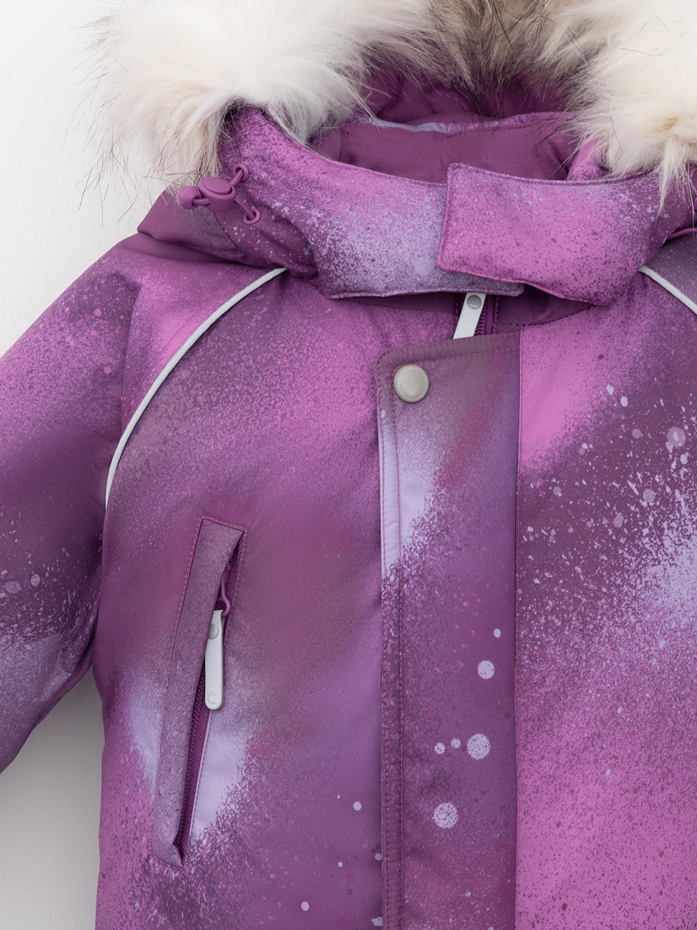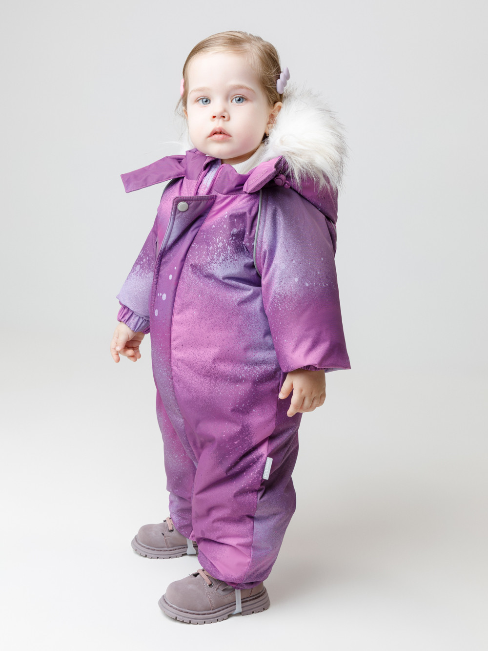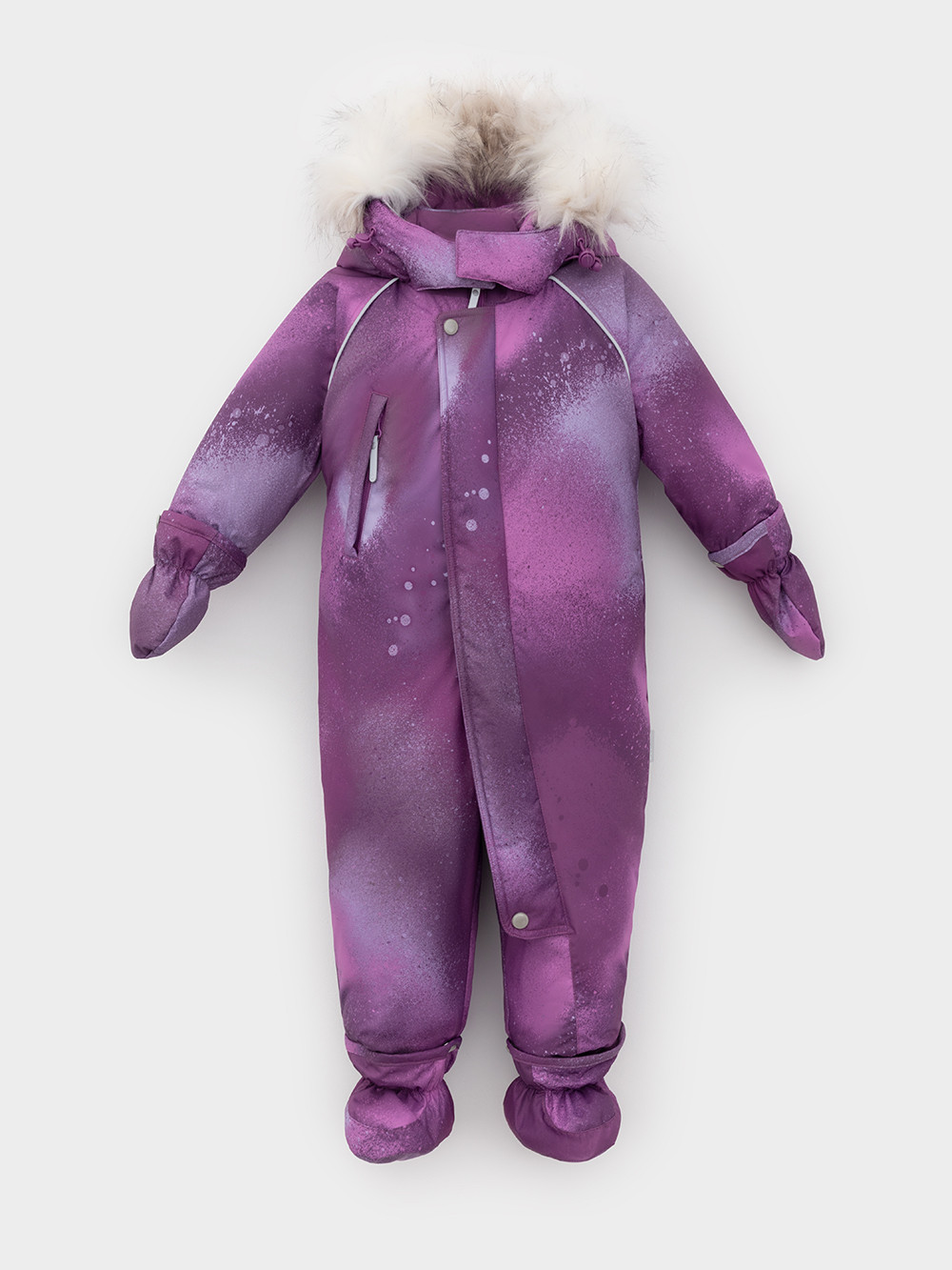 Зимний комбинезон ясельный с утеплителем Fellex®: 300 г/м2. Выполнен из мембранной ткани с дополнительной тефлоновой обработкой, которая предохраняет изделие от загрязнений и отталкивает влагу. Подклад выполнен из 100% хлопка. Комбинезон застёгивается на молнию и внешнюю планку на липучках, предусмотрена защита подбородка. Несъёмный капюшон имеет эластичную утяжку со стопперами и отстёгивающийся искусственный мех. Резинка по спинке для лучшего прилегания. На груди карман на молнии. По рукавам и низу изделия эластичные манжеты, на ножках отстёгивающиеся силиконовые штрипки. До размера 80-86 включительно в комплекте идут рукавицы и пинетки. Во всех изделиях верхнего ассортимента для безопасности ребёнка предусмотрены светоотражающие элементы.