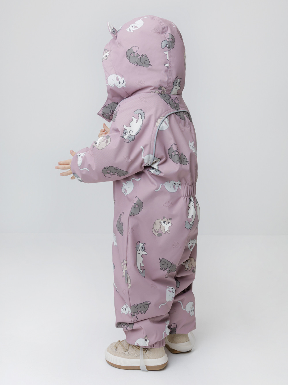 Демисезонный комбинезон ясельный с утеплителем SEE, 120 г/м2. Выполнен из мембранной ткани с дополнительной тефлоновой обработкой. Данный вид обработки предохраняет изделие от загрязнения и лучше отводит влагу. Подклад из 100% хлопка. Для удобного одевания комбинезон застёгивается на удлинённую молнию с защитой подбородка. Ветрозащитная планка фиксируется на липучках и кнопках. Утяжка на капюшоне с потайным стоппером. По низу рукавов и брючин, а также на спинке изделия предусмотрены эластичные резинки для лучшего прилегания. Для фиксации комбинезона используются съёмные силиконовые штрипки. В размерах 68-74 и 74-80 есть функциональные отвороты на рукавах и брючинах. Во всех изделиях верхнего ассортимента для безопасности ребёнка предусмотрены светоотражающие элементы.