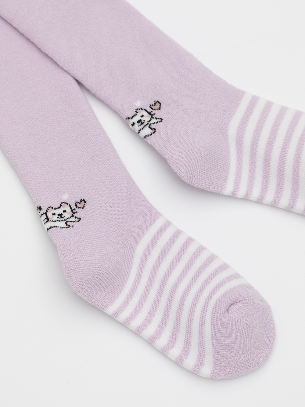 Колготки тёплые из махры для девочки с эластичной резинкой в поясе и формованной стопой. Украшены рисунком. Изделие сохраняет форму и стойкий цвет после многочисленных стирок.