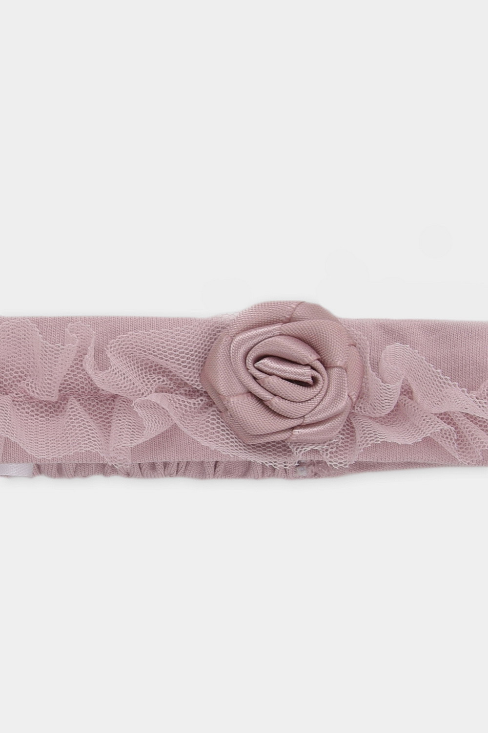Повязка на голову для девочки из высокачественного хлопкового трикотажа супрем. В области затылка эластичная мягкая резинка. Украшена присборенной рюшей из сетки и декоративной розочкой. Все трикотажные полотна производятся в соответствии с нормами швейцарского сертификата ЭкоТекс.