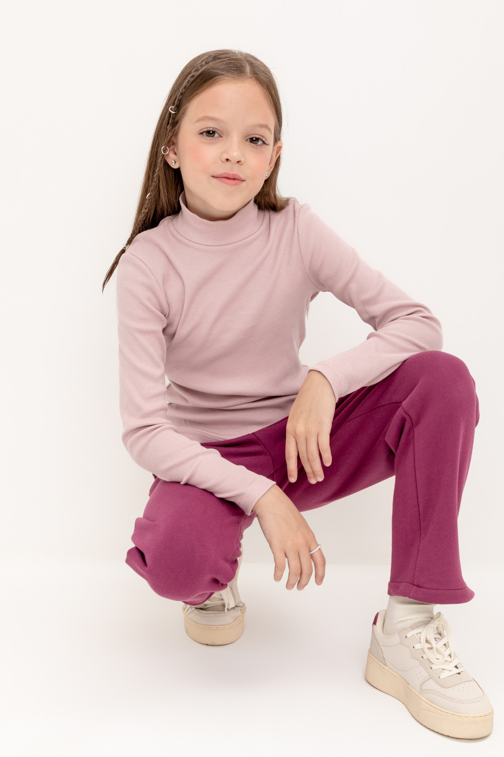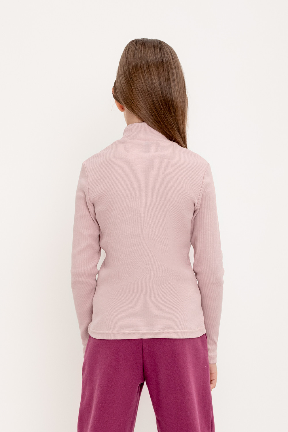 Базовая водолазка для девочки из эластичного кашкорсе, произведенного из натурального хлопка. Изделие имеет воротник с отворотом и длинные втачные рукава. Водолазка сохраняет цвет и форму после многократных стирок.