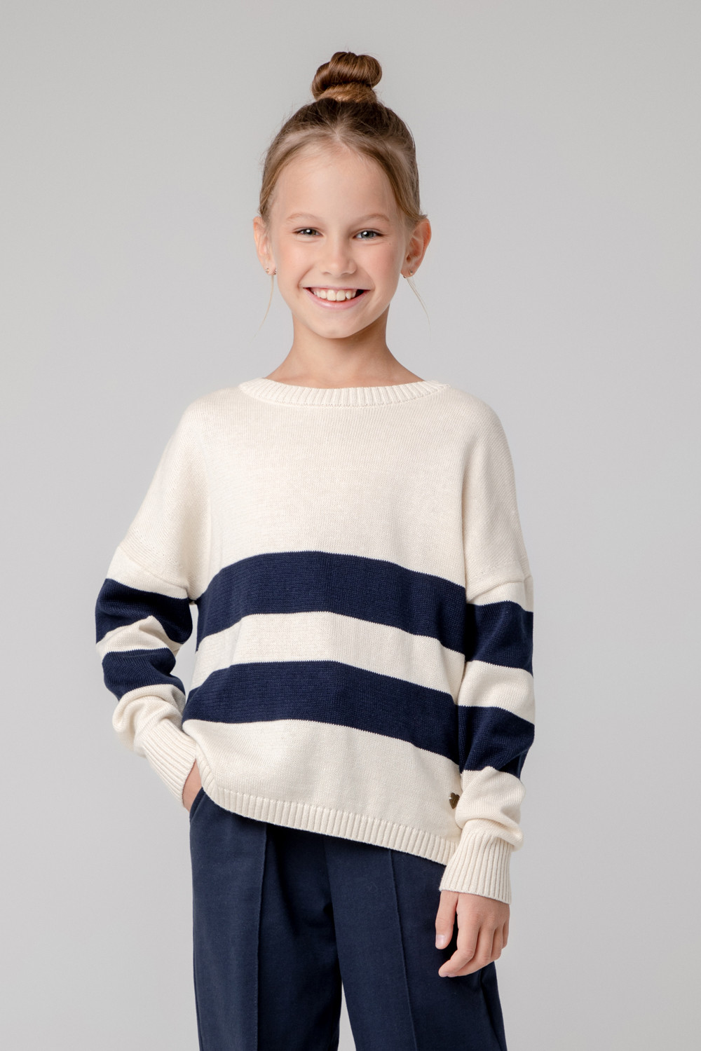 Вязаный джемпер в широкую полоску. Состав 50% хлопок, 50% акрил. Благодаря акрилу в составе изделие не пилингуется.