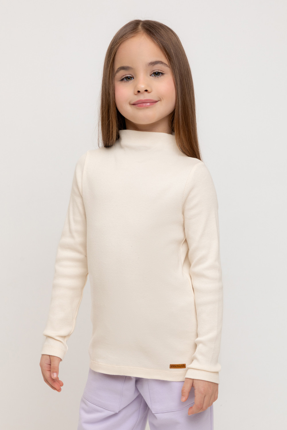 Базовая водолазка для девочки из эластичного трикотажа кашкорсе. Изделие имеет цельнокроенный воротник и длинные втачные рукава. Водолазка сохраняет цвет и форму после многократных стирок.