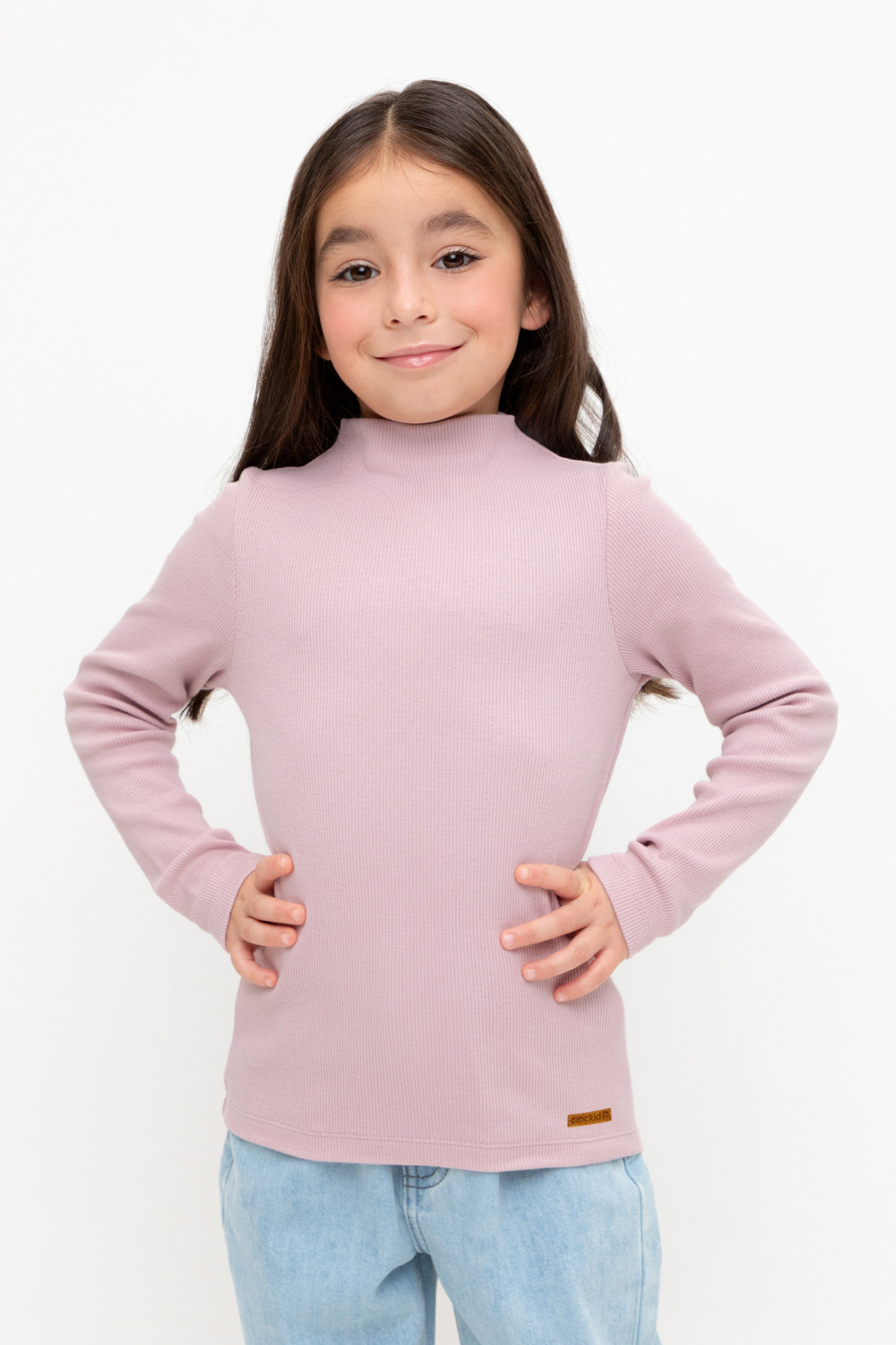 Базовая водолазка для девочки из эластичного трикотажа кашкорсе. Изделие имеет цельнокроенный воротник и длинные втачные рукава. Водолазка сохраняет цвет и форму после многократных стирок.