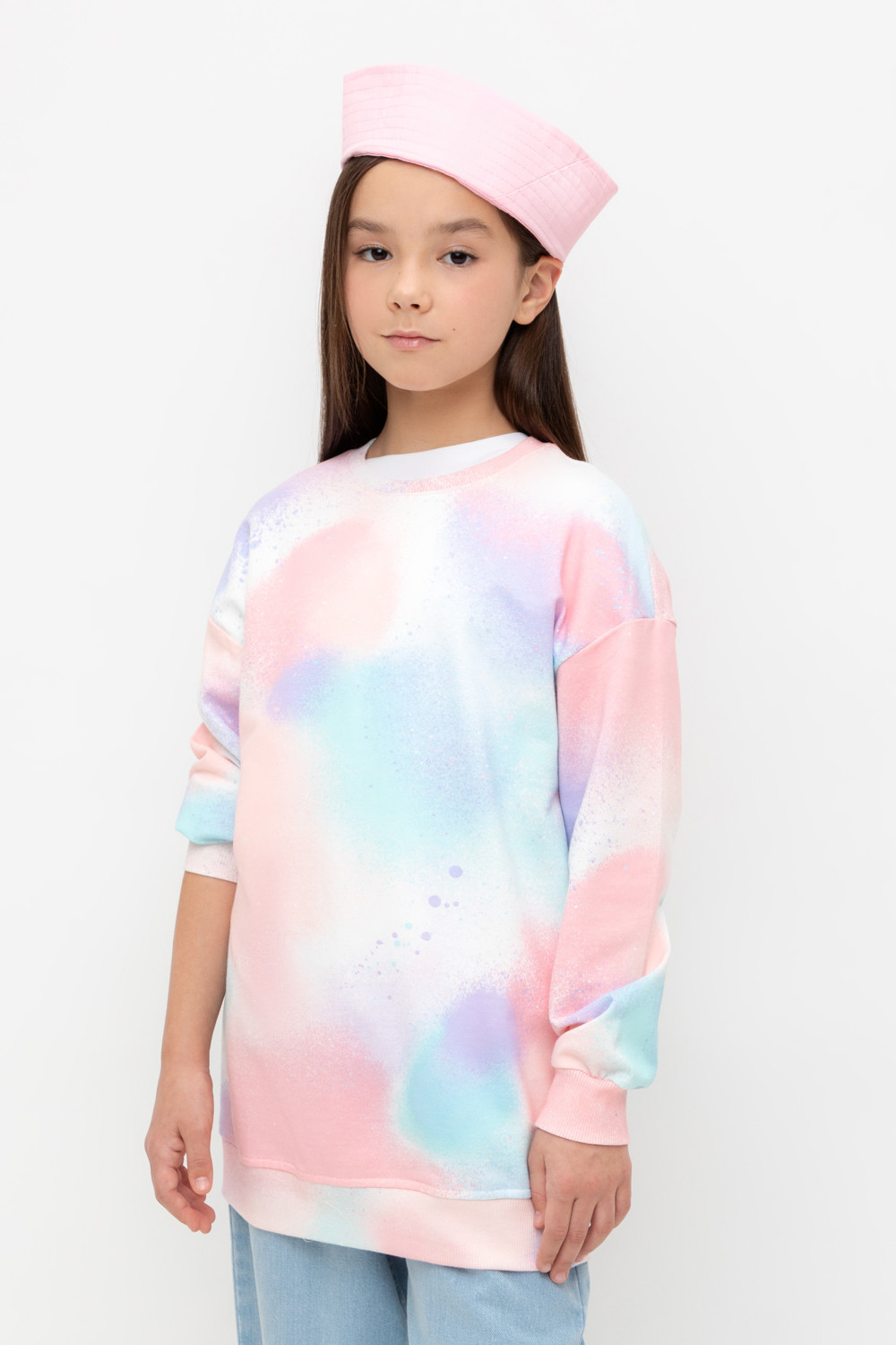 Удлинённый джемпер из петельчатого футера. Спущенные плечи и сборки по низу на рукавах придают свободный объём. Оригинальная набивка выполнена из стойких текстильных гипоаллергенных красителей.