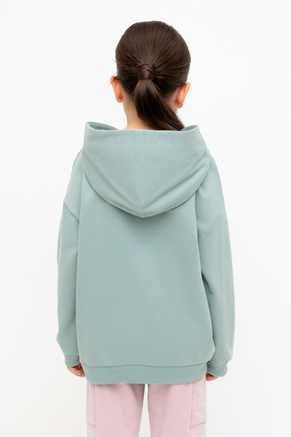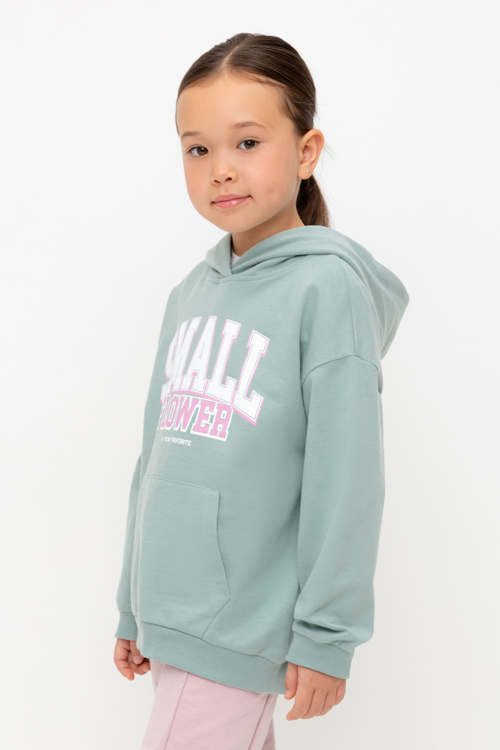 Толстовка с капюшоном для девочки из мягкого петельчатого футера. На рукавах и по низу изделия эластичные манжеты и пояс. Спереди удобный карман-кенгуру. Принт выполнен из стойких текстильных гипоаллергенных красителей.