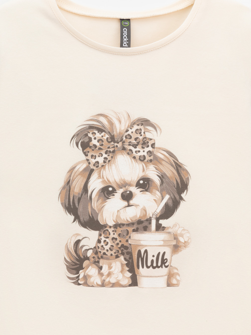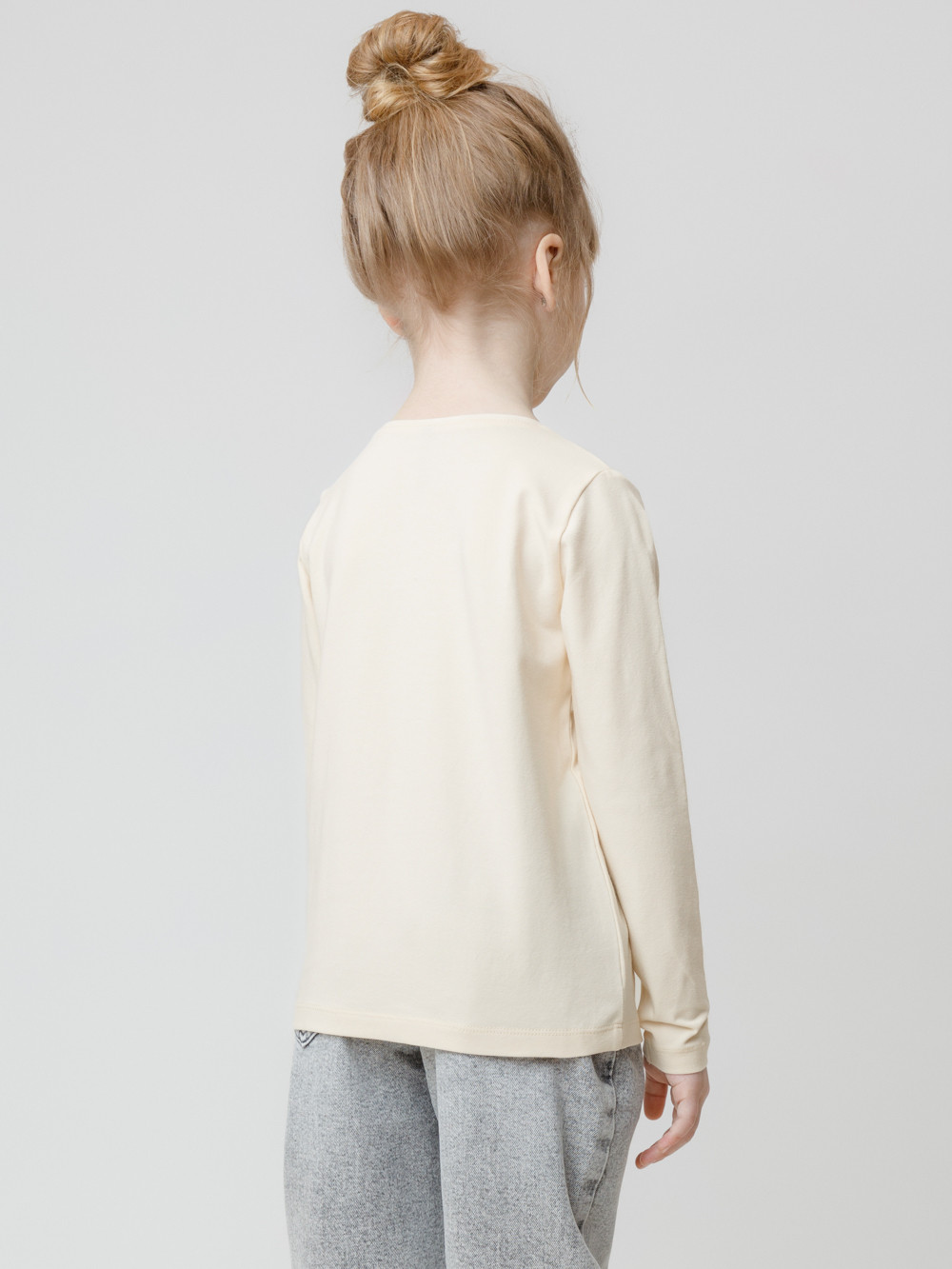 Лонгслив для девочки из гладкого эластичного трикотажа. Оригинальный принт выполнен из стойких текстильных гипоаллергенных красителей. Изделие сохраняет цвет и форму после многократных стирок. Все трикотажные полотна производятся в соответствии с нормами швейцарского сертификата ЭкоТекс.