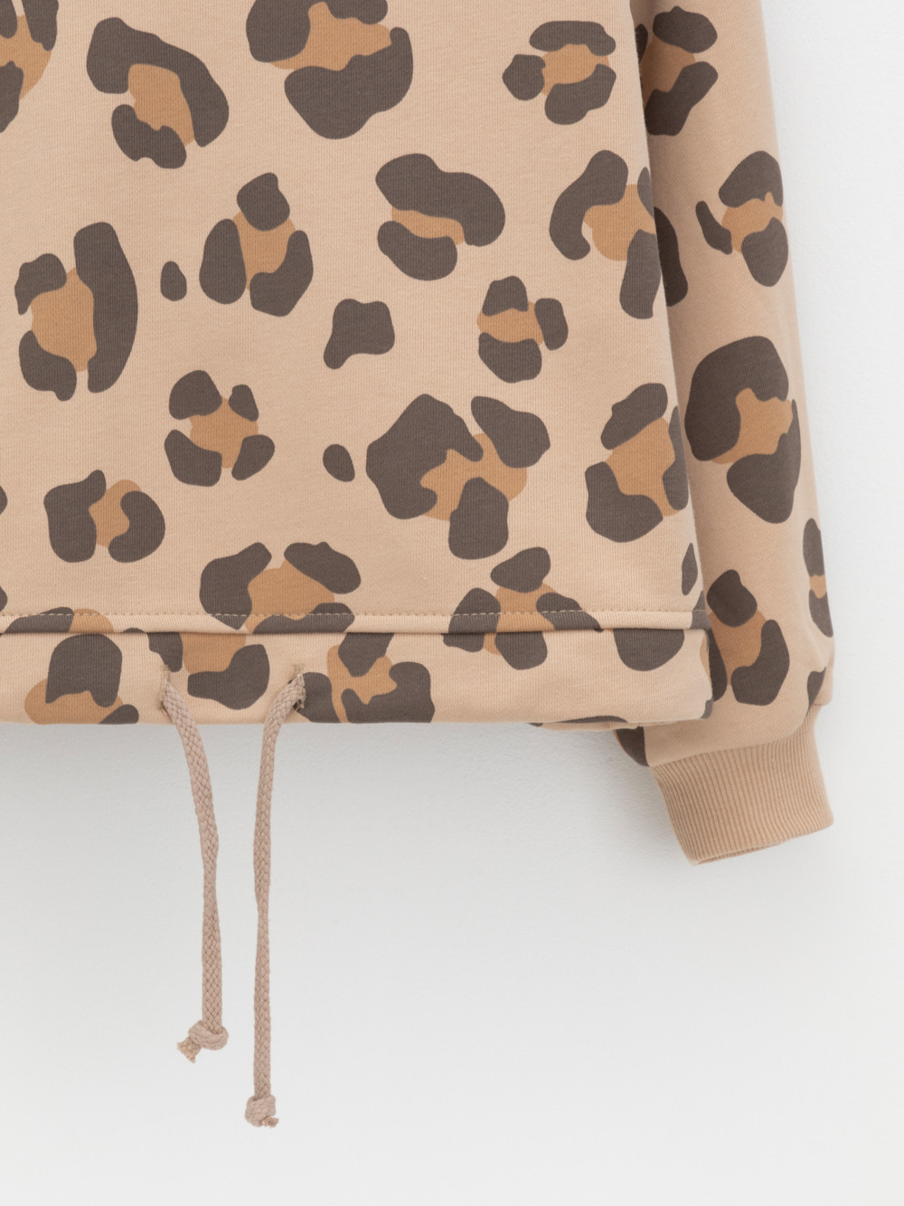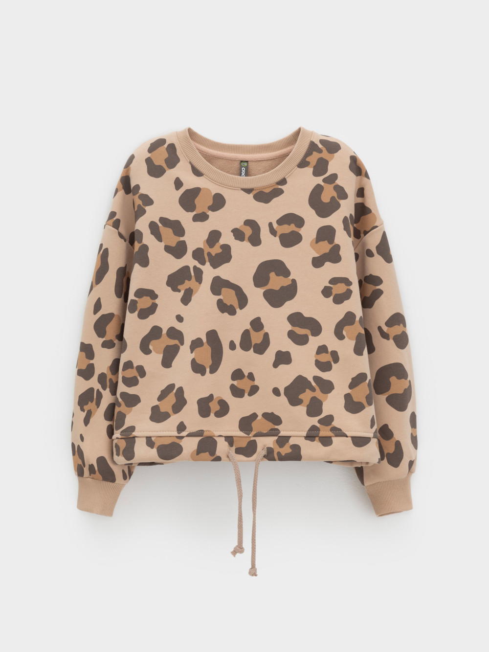 Свитшот для девочки из мягкого петельчатого футера трёхнитки. В составе 80% натурального хлопка и 20% полиэстера, при этом полиэстер ввязан внутрь по особой технологии и не соприкасается с кожей. Застёгивается на кнопки в размерах 92 и 98. Пояс регулируется по ширине с помощью шнурка. На рукавах эластичные манжеты. Оригинальный принт выполнен из стойких текстильных гипоаллергенных красителей. Изделие сохраняет цвет и форму после многократных стирок. Все трикотажные полотна производятся в соответствии с нормами швейцарского сертификата ЭкоТекс.