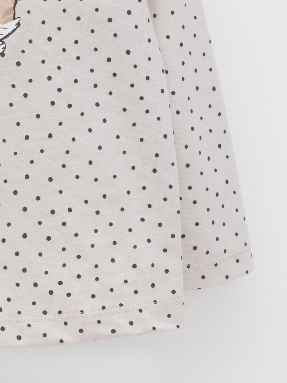 Лонгслив для девочки из гладкого трикотажа, произведённого из высококачественного натурального хлопка. Застёгивается на спинке на планку с кнопками. Оригинальный принт выполнен из стойких текстильных гипоаллергенных красителей. Изделие сохраняет цвет и форму после многократных стирок. Все трикотажные полотна производятся в соответствии с нормами швейцарского сертификата ЭкоТекс.