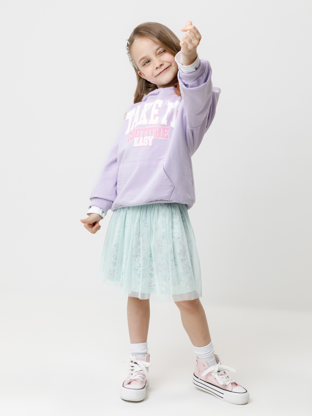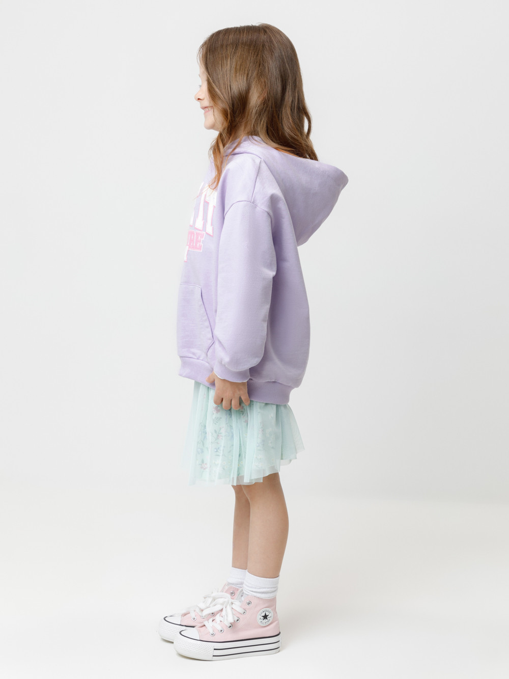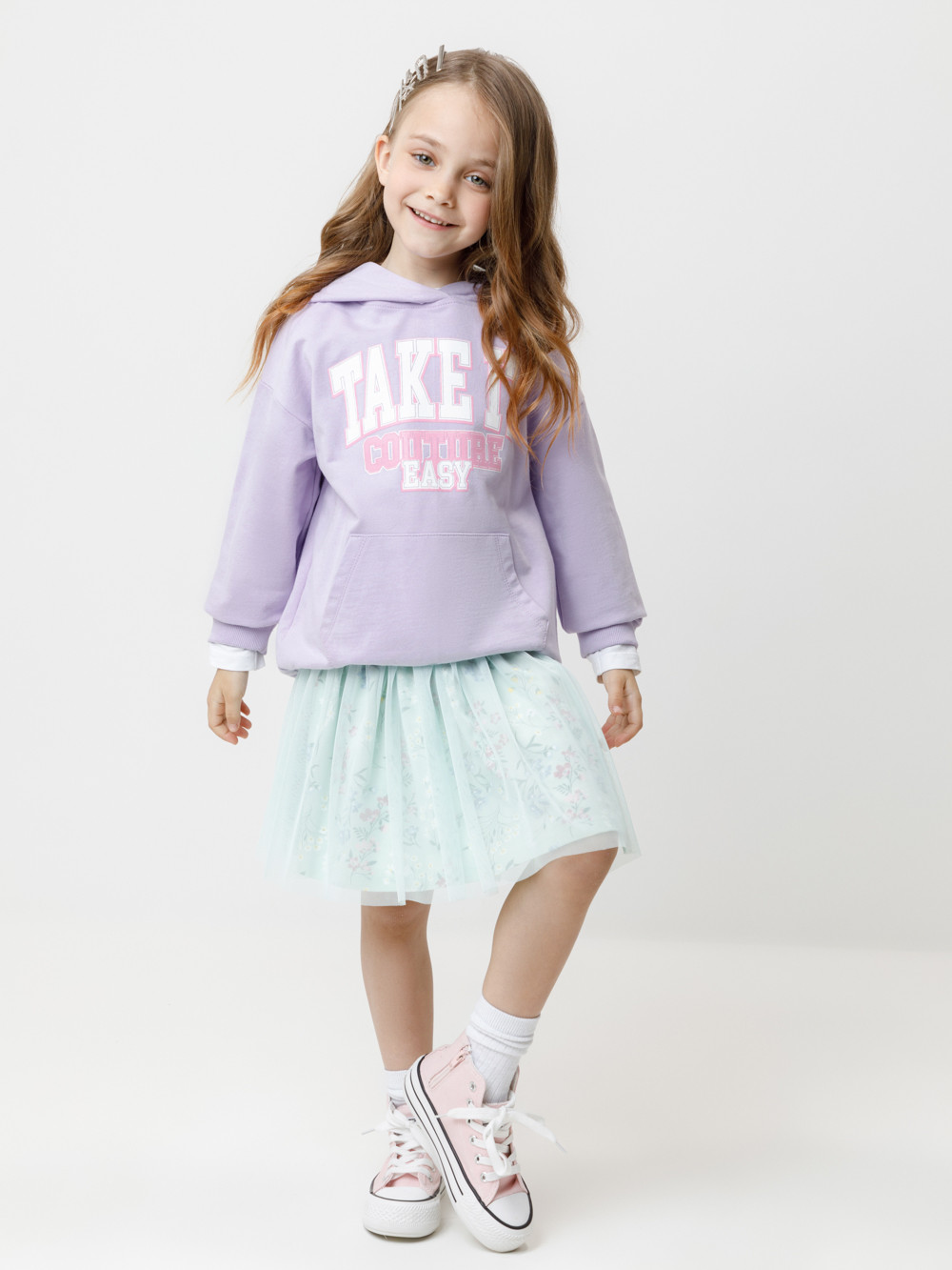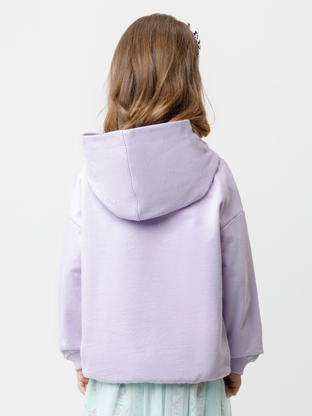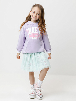 Толстовка с капюшоном для девочки из мягкого петельчатого футера. На рукавах и по низу изделия эластичные манжеты и пояс. Спереди удобный карман-кенгуру. Принт выполнен из стойких текстильных гипоаллергенных красителей.