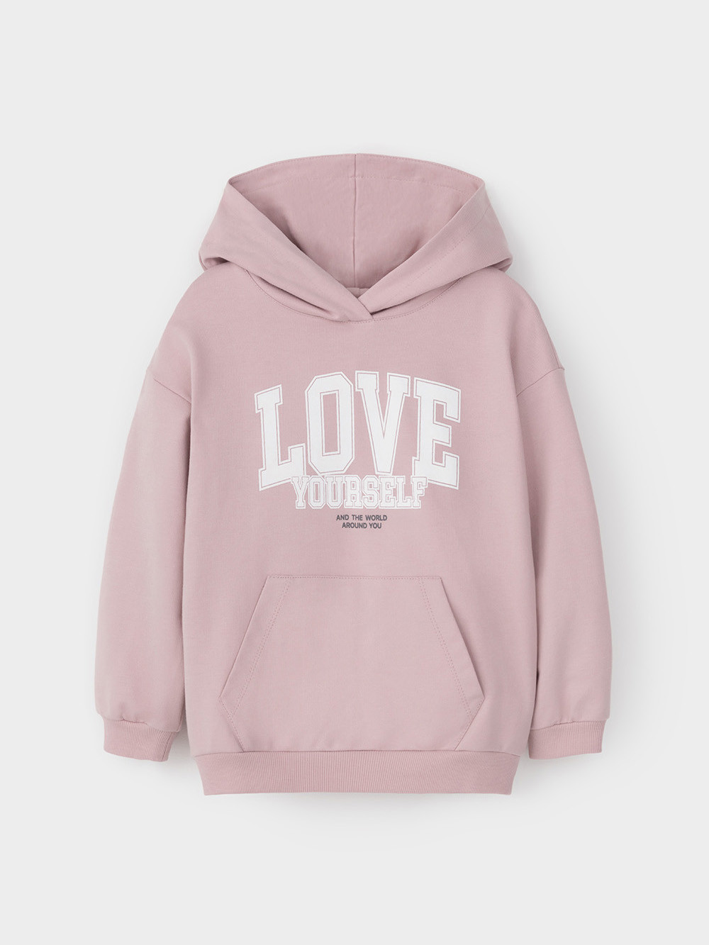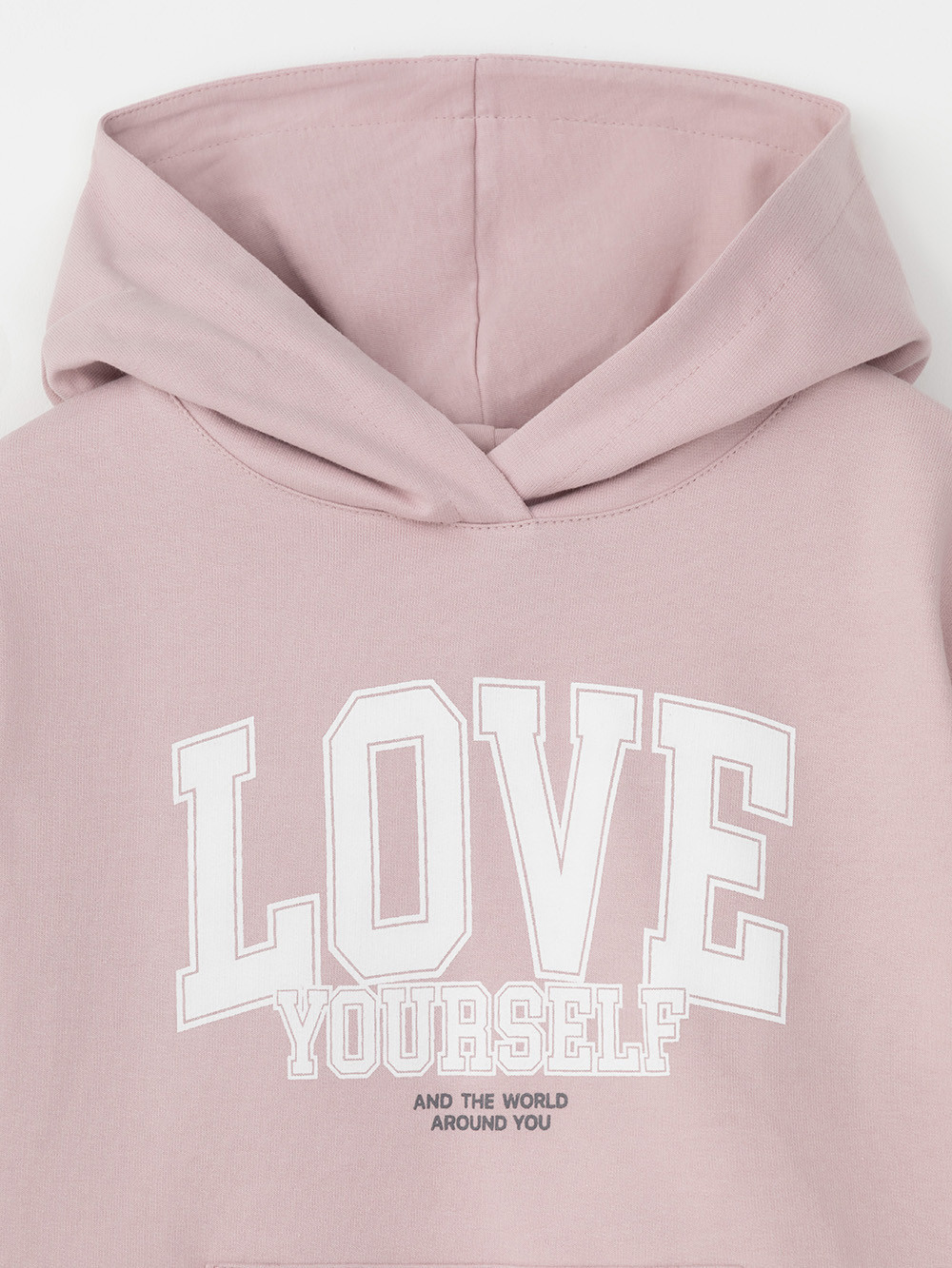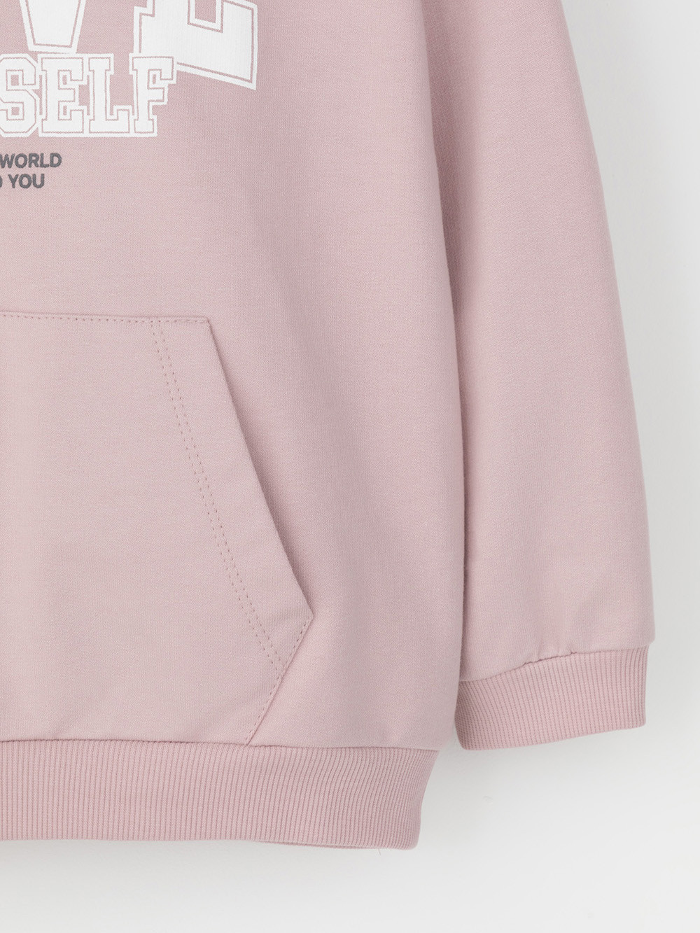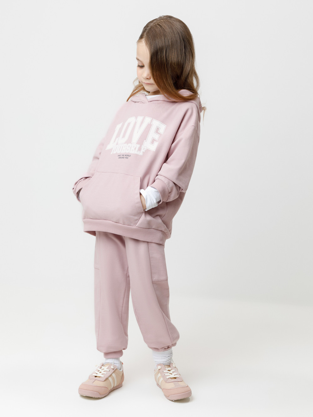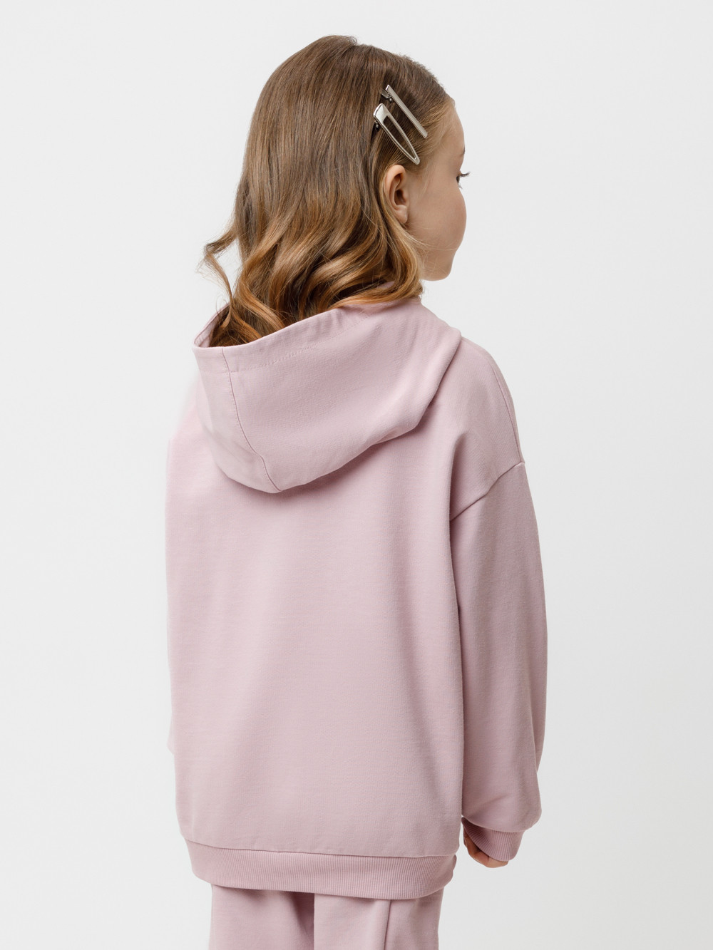 Толстовка с капюшоном для девочки из мягкого петельчатого футера. На рукавах и по низу изделия эластичные манжеты и пояс. Спереди удобный карман-кенгуру. Принт выполнен из стойких текстильных гипоаллергенных красителей.
