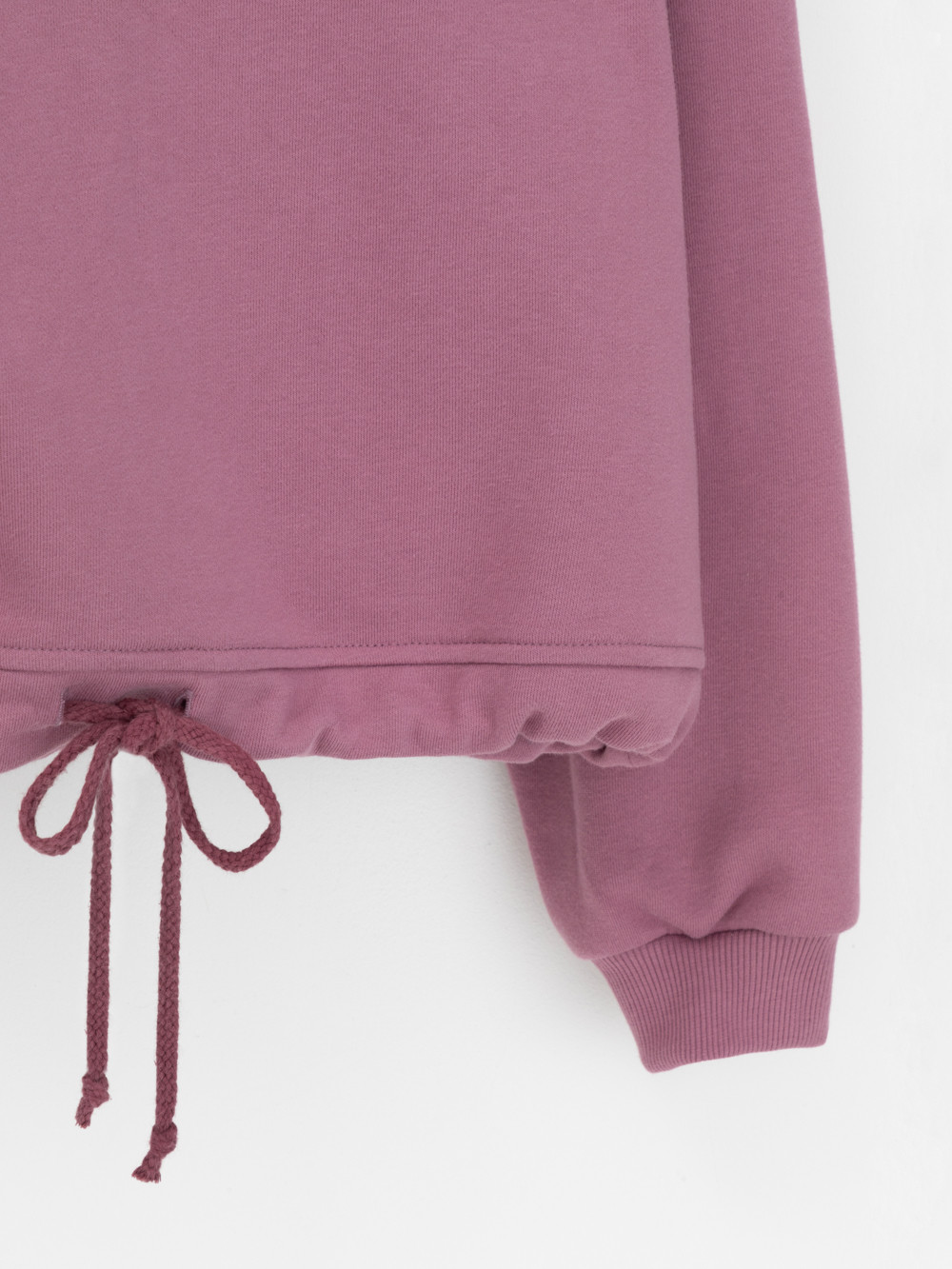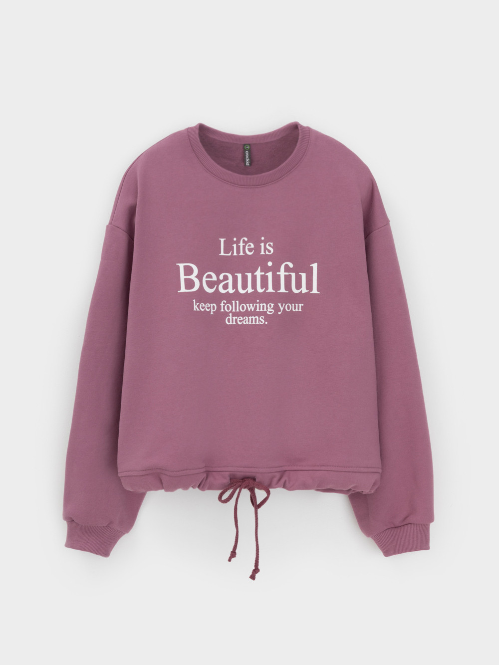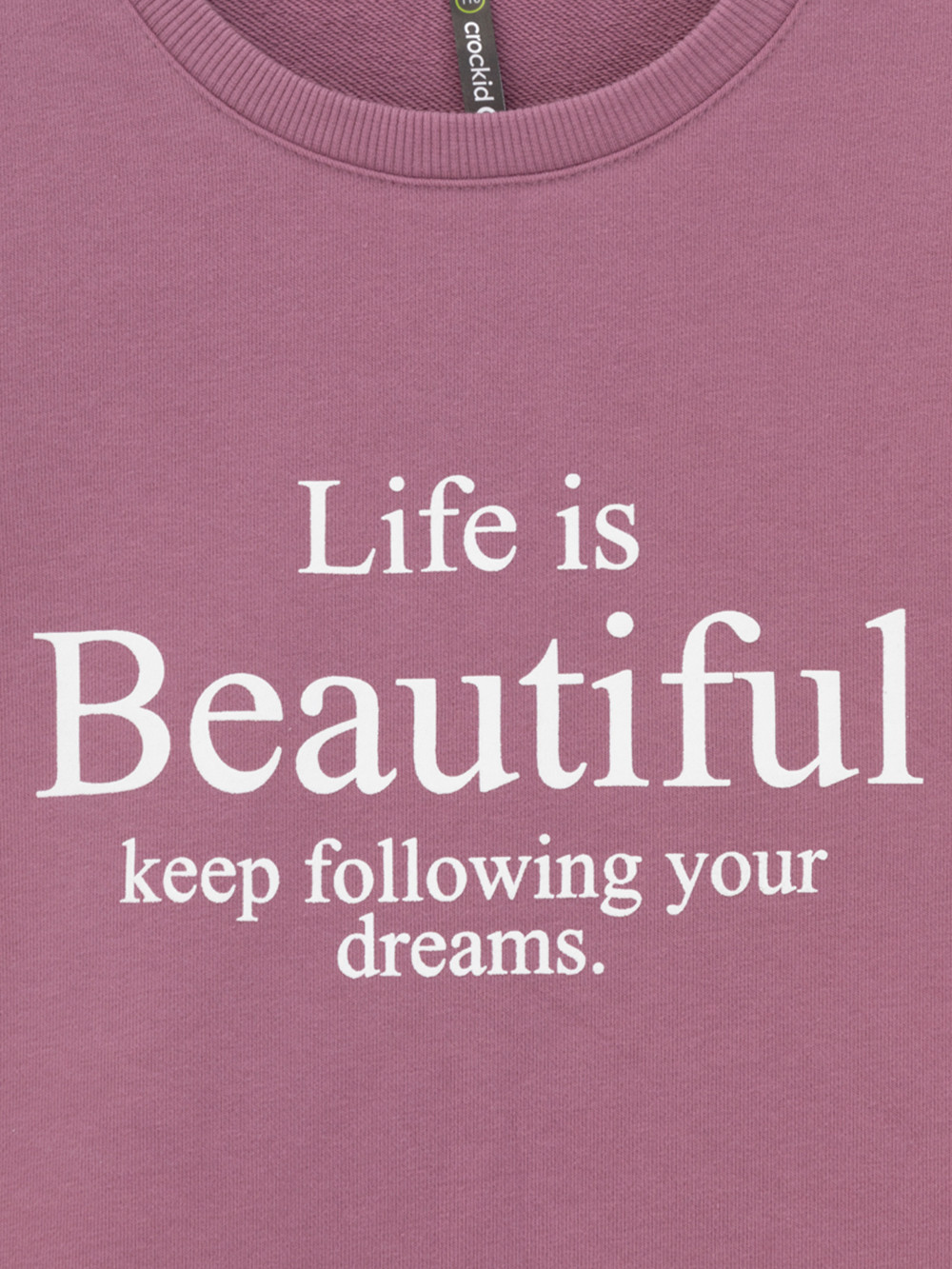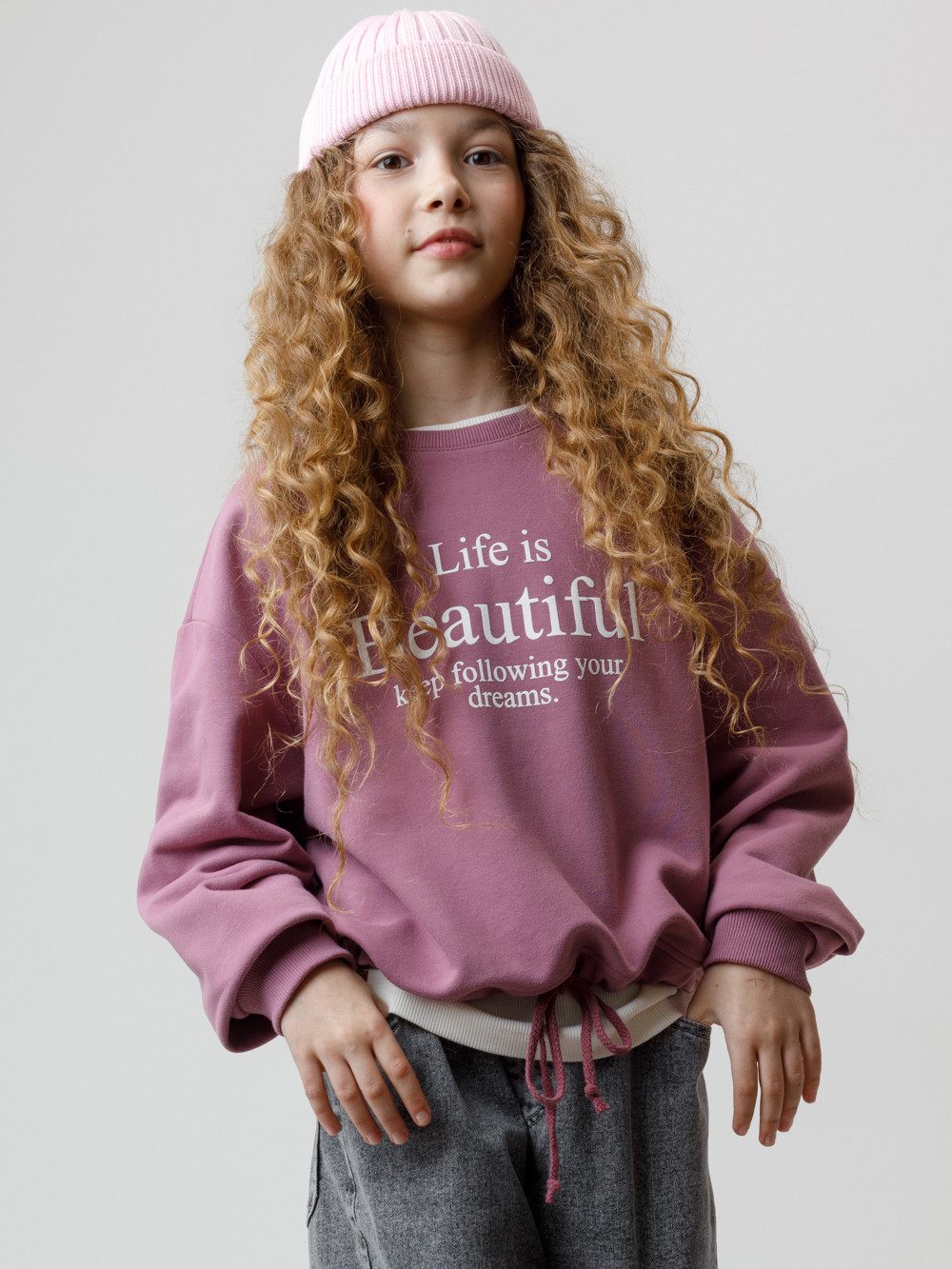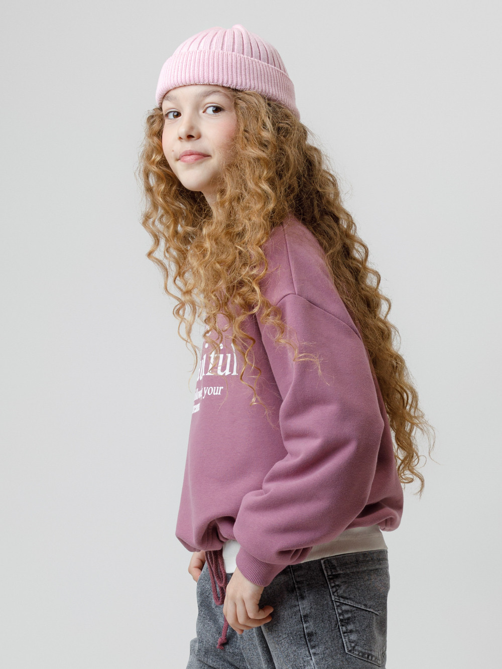 Свитшот для девочки из мягкого петельчатого трикотажа. В составе 80% натурального хлопка и 20% полиэстера, при этом полиэстер ввязан внутрь по особой технологии и не соприкасается с кожей. Манжеты выполнены из эластичного полотна. Пояс регулируется по ширине при помощи шнурка. Оригинальный принт выполнен из стойких текстильных гипоаллергенных красителей. Изделие сохраняет цвет и форму после многократных стирок. Все трикотажные полотна производятся в соответствии с нормами швейцарского сертификата ЭкоТекс.