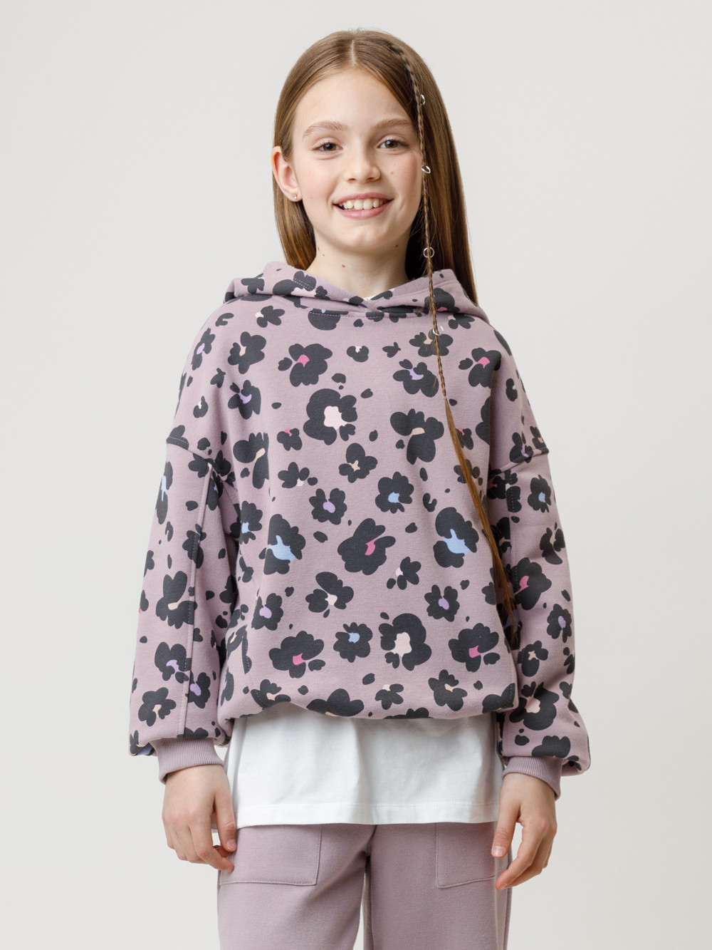 Худи с капюшоном для девочки. Модель оверсайз из мягкого футера трёхнитки с начёсом. Пояс и манжеты выполнены из мягкого эластичного трикотажа. Худи сохраняет форму и стойкий цвет после многочисленных стирок и идеально подходит на каждый день. Оригинальный принт выполнен из стойких текстильных гипоаллергенных красителей. Все трикотажные полотна производятся в соответствии с нормами швейцарского сертификата ЭкоТекс.