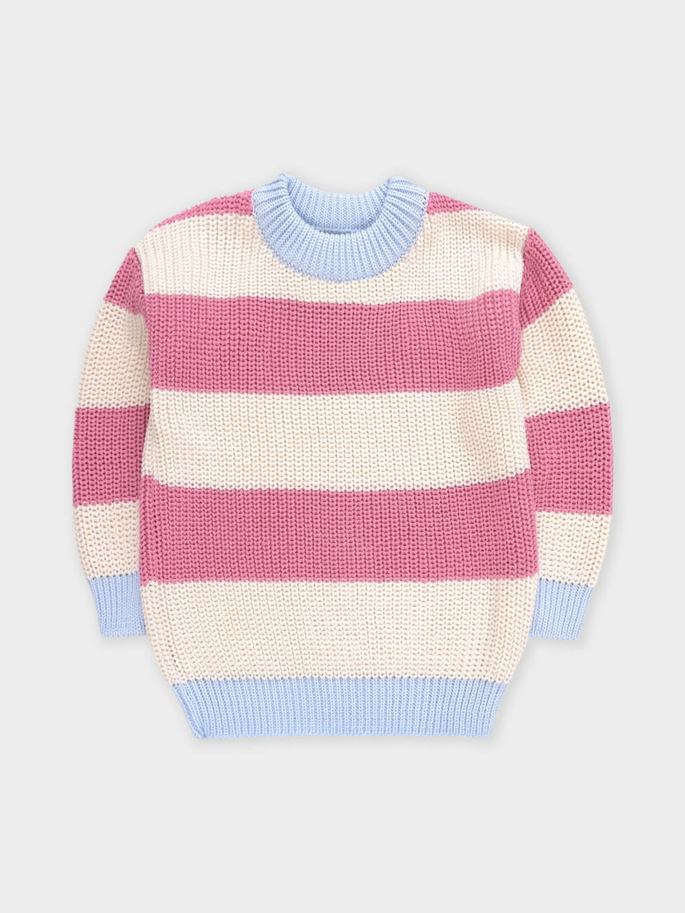 Вязаный джемпер объёмный. Изготовлен из мягкой хлопковой пряжи с добавлением акрила. Длинные рукава с манжетами. Внизу эластичный пояс. Изделие сохраняет форму и стойкий цвет после многочисленных стирок.