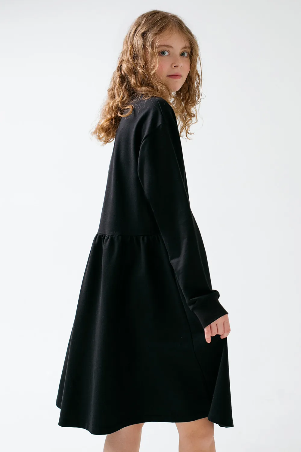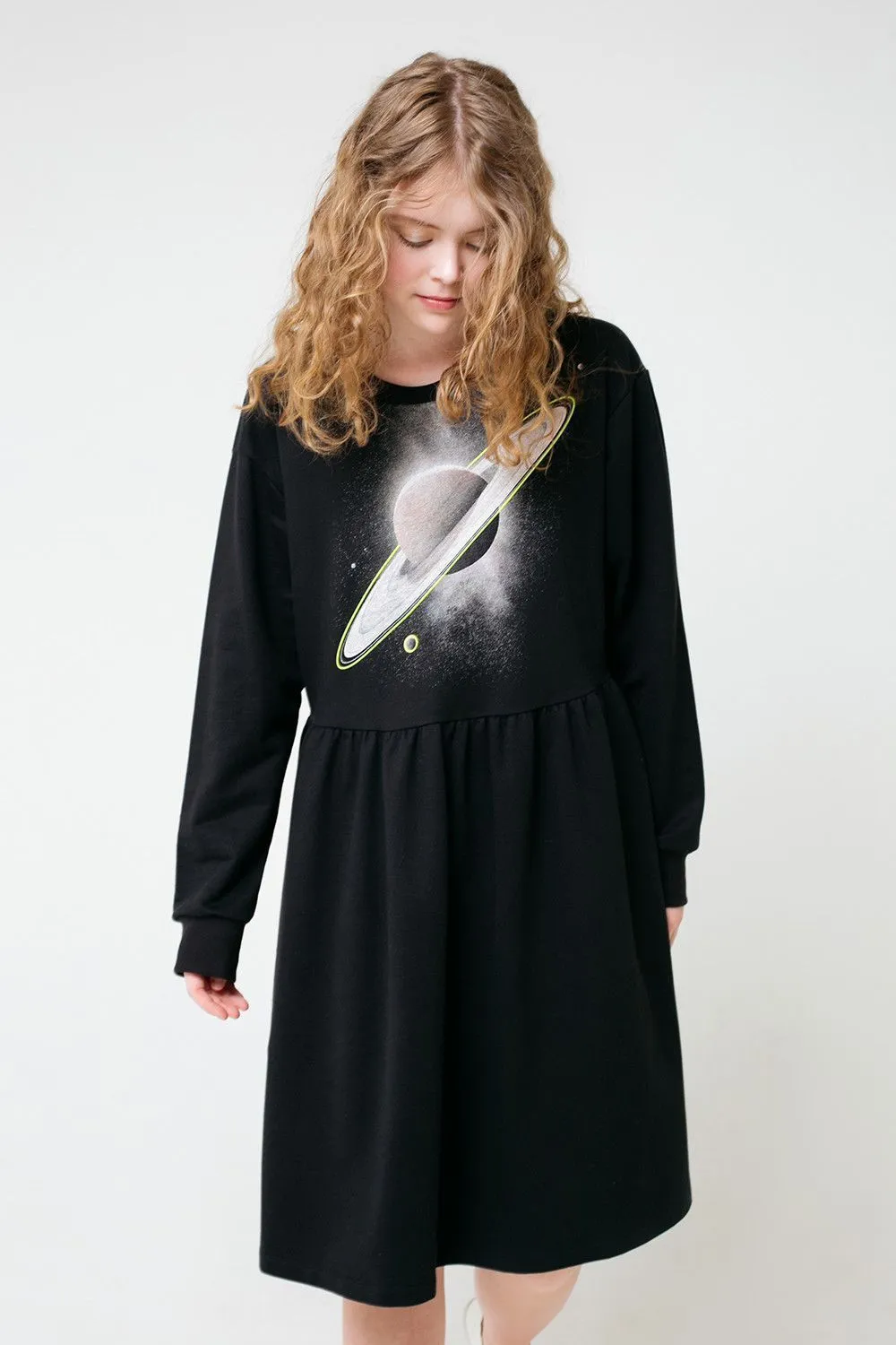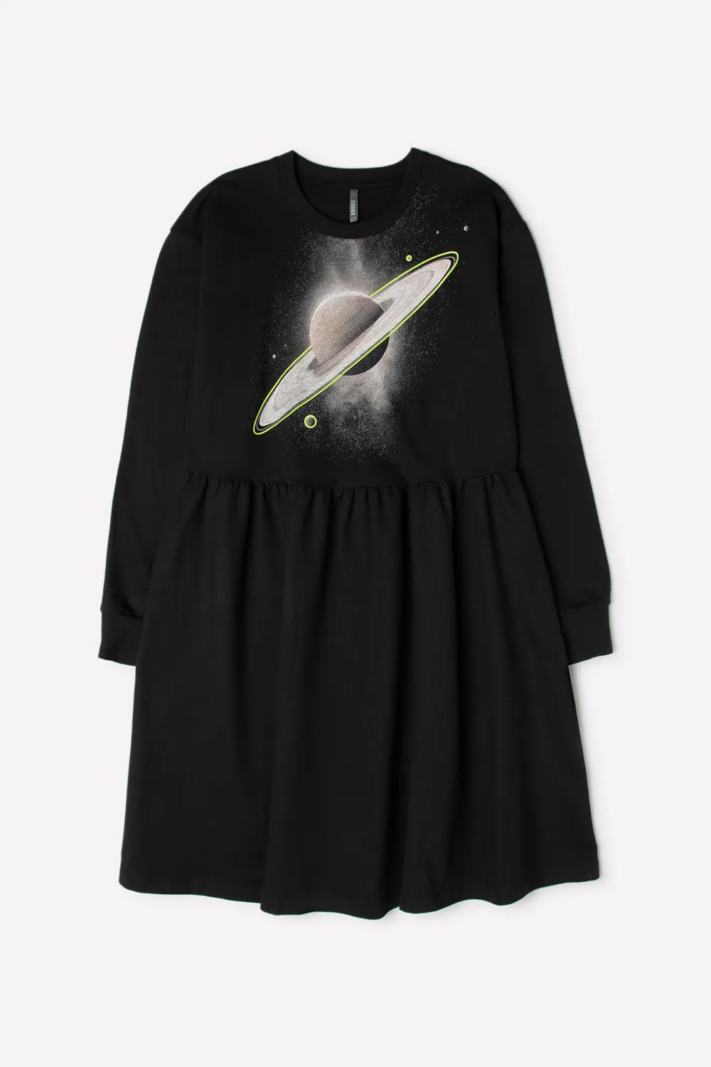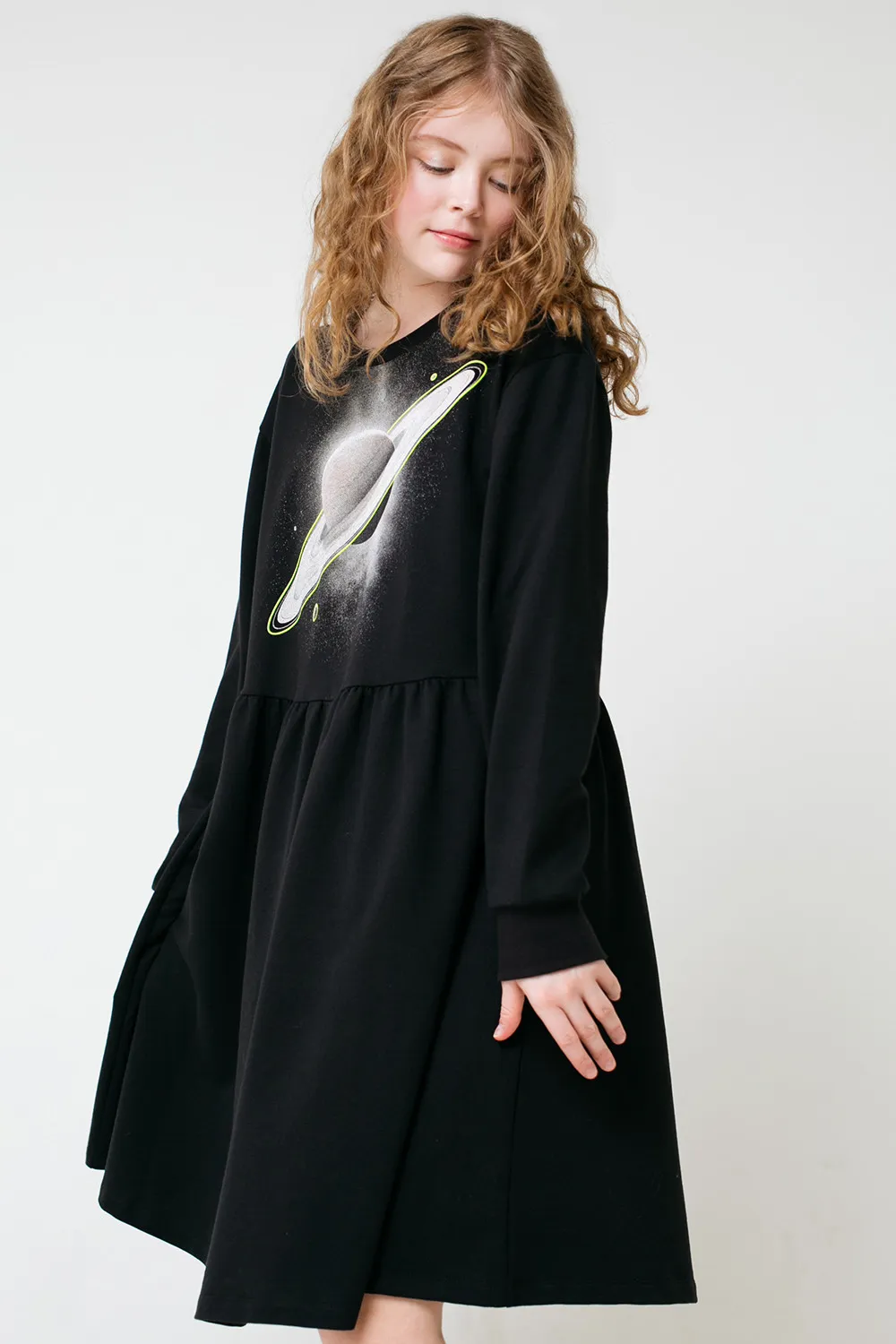 Отрезное платье для девочки с длинными рукавами и сборкой на талии. Спущенные плечи придают свободный объём. Украшено принтом с изображением планеты.