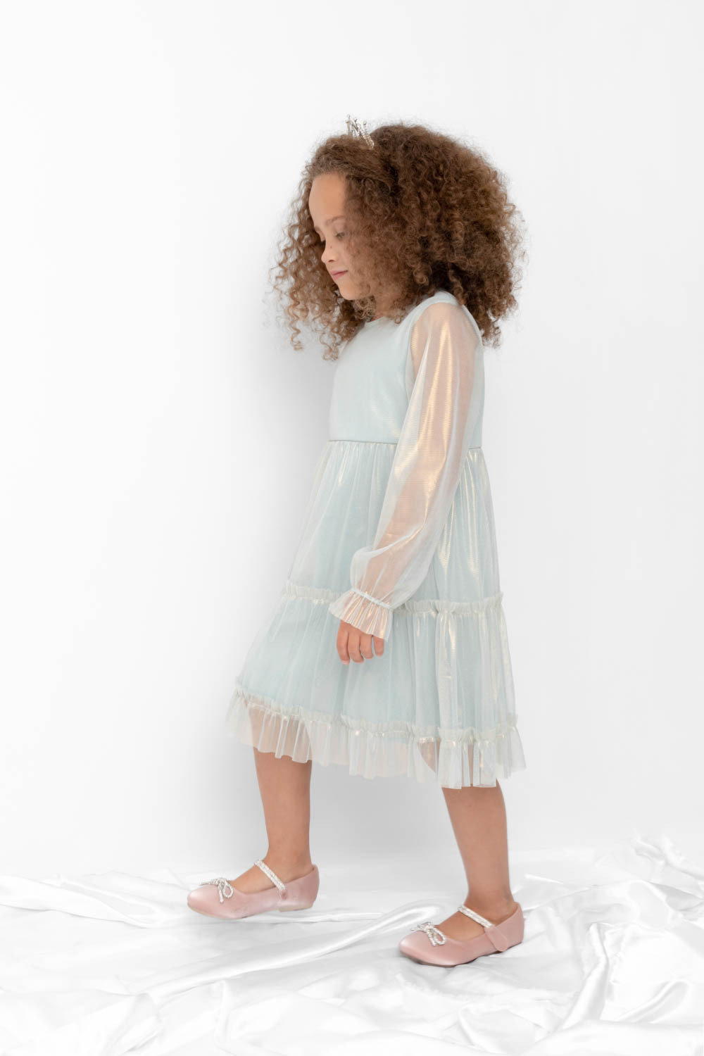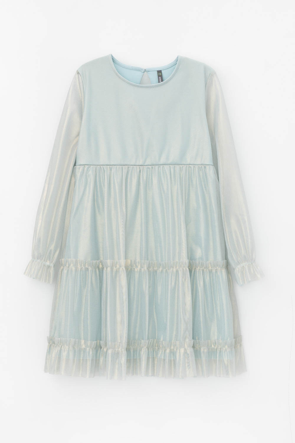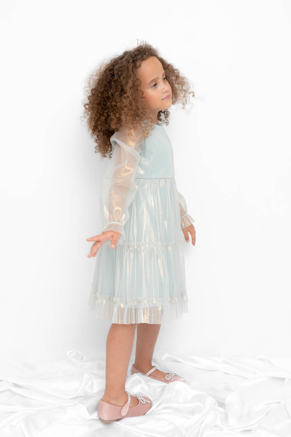 Нарядное платье для девочки из высококачественного трикотажа супрем с лёгким слоем из сетки с золотым переливом. Длинные рукава из сетки собраны на резинку. Для удобства одевания платье застёгивается на пуговицу на спинке. Платье сохраняет форму и стойкий цвет после многочисленных стирок и идеально подходит для праздников и фотосессий.