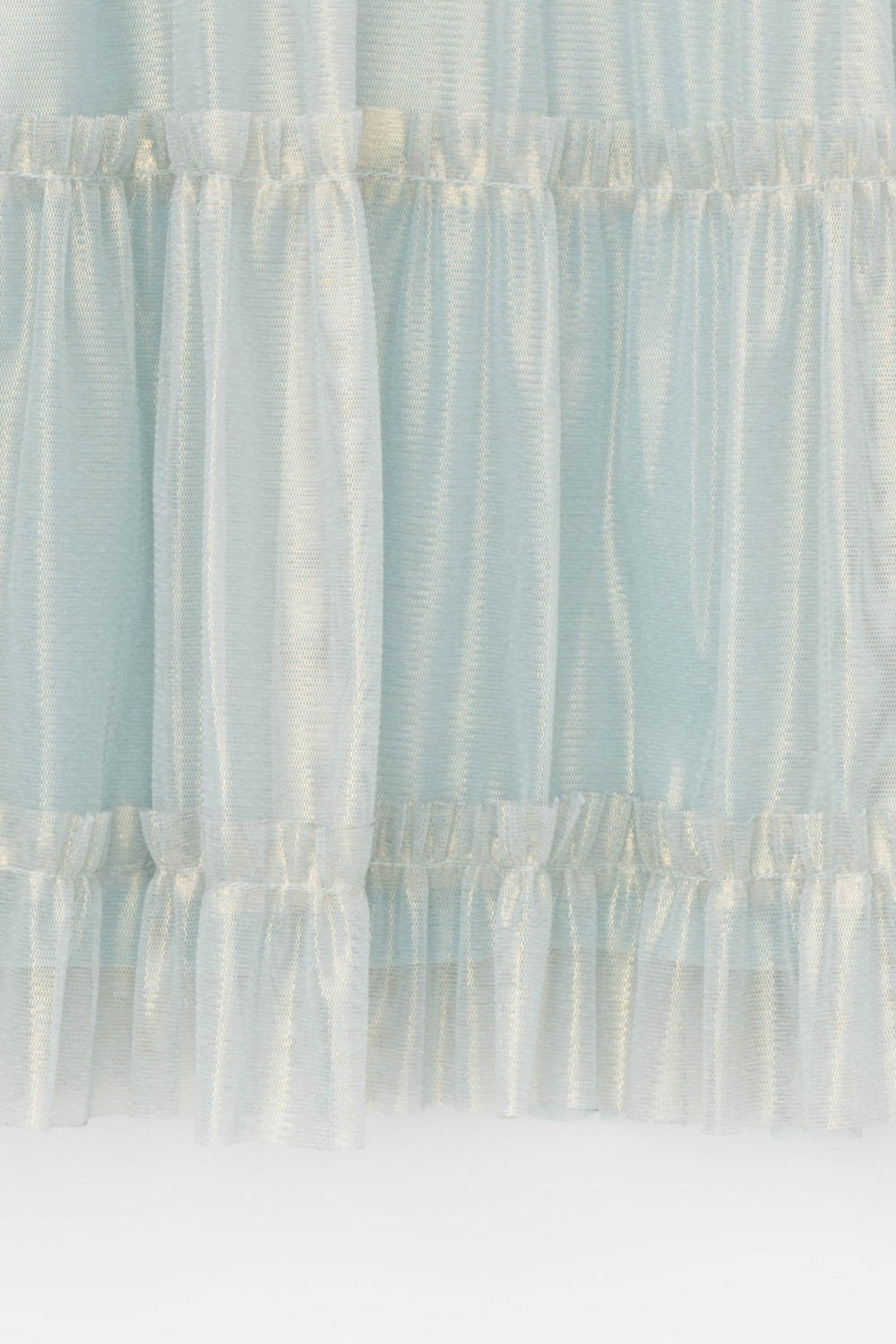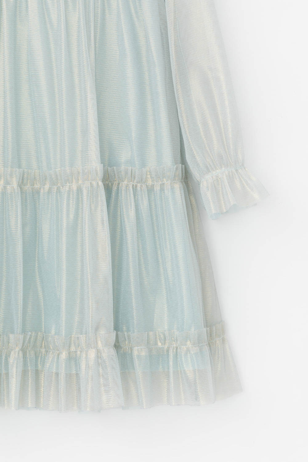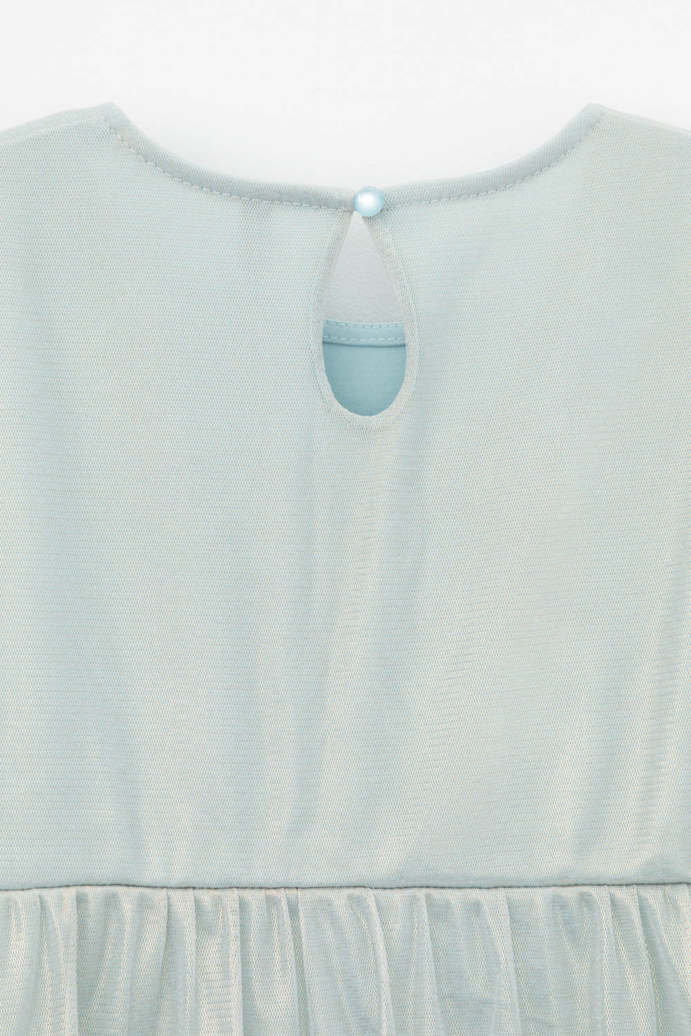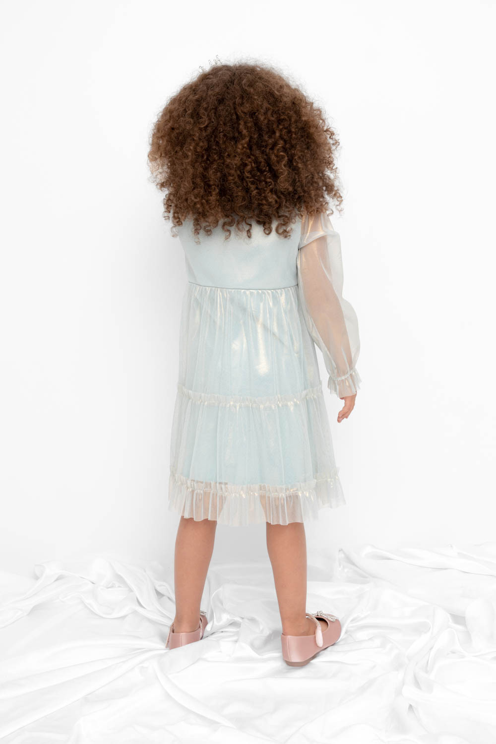 Нарядное платье для девочки из высококачественного трикотажа супрем с лёгким слоем из сетки с золотым переливом. Длинные рукава из сетки собраны на резинку. Для удобства одевания платье застёгивается на пуговицу на спинке. Платье сохраняет форму и стойкий цвет после многочисленных стирок и идеально подходит для праздников и фотосессий.