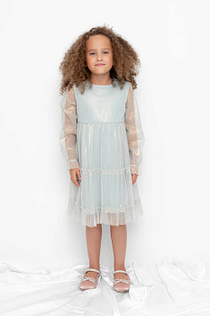 Нарядное платье для девочки из высококачественного трикотажа супрем с лёгким слоем из сетки с золотым переливом. Длинные рукава из сетки собраны на резинку. Для удобства одевания платье застёгивается на пуговицу на спинке. Платье сохраняет форму и стойкий цвет после многочисленных стирок и идеально подходит для праздников и фотосессий.