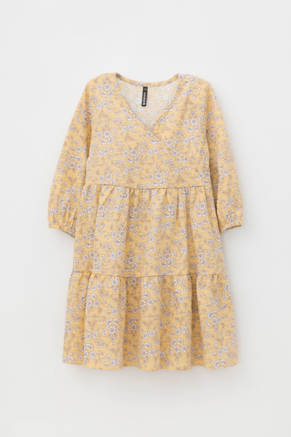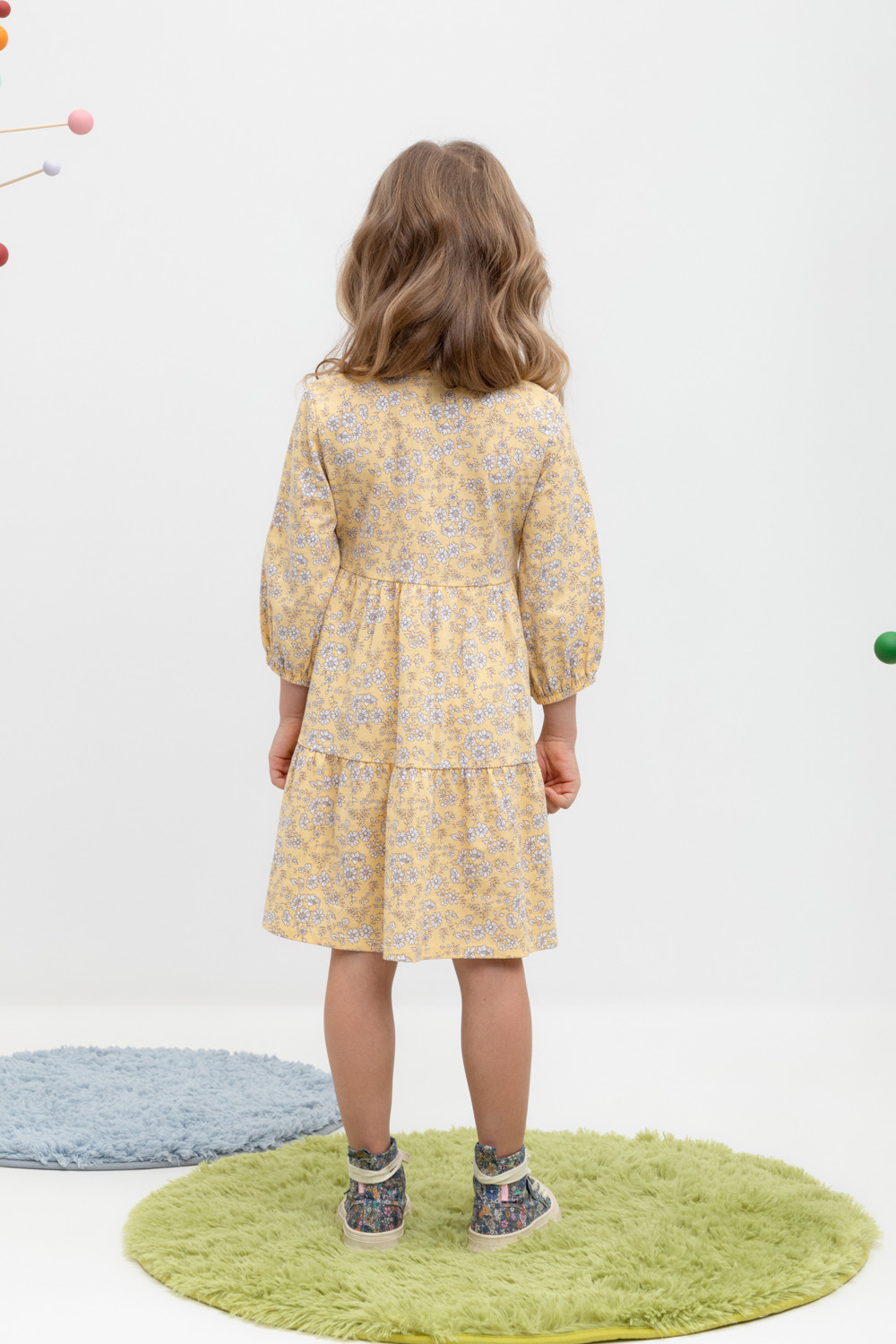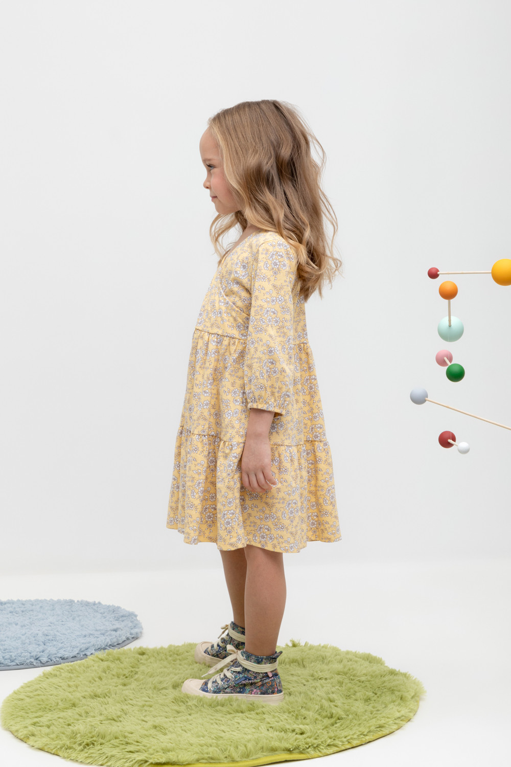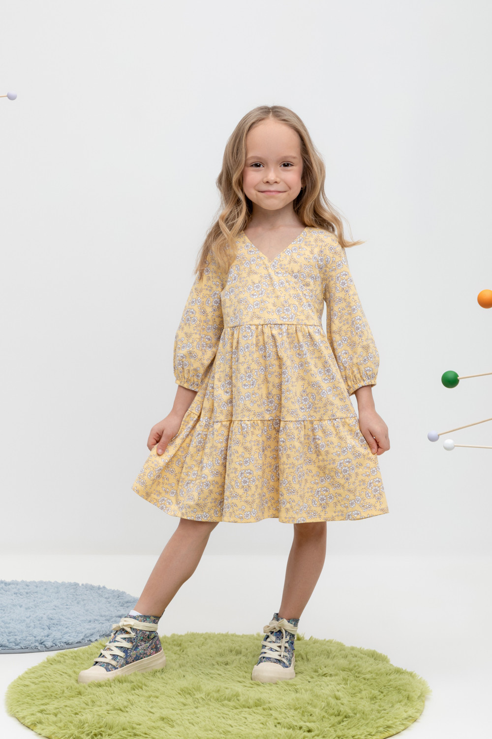 Легкое трикотажное платье на запах для девочки из высококачественного хлопка. Оригинальная набивка выполнена из стойких текстильных гипоаллергенных красителей. Изделие сохраняет цвет и форму после многократных стирок