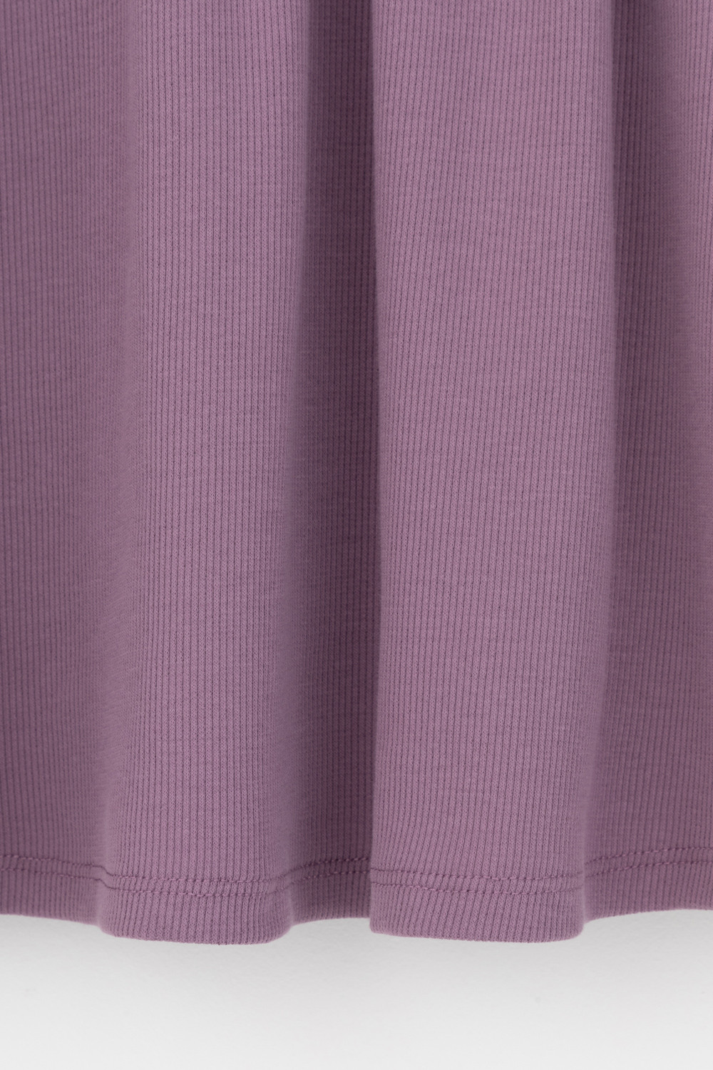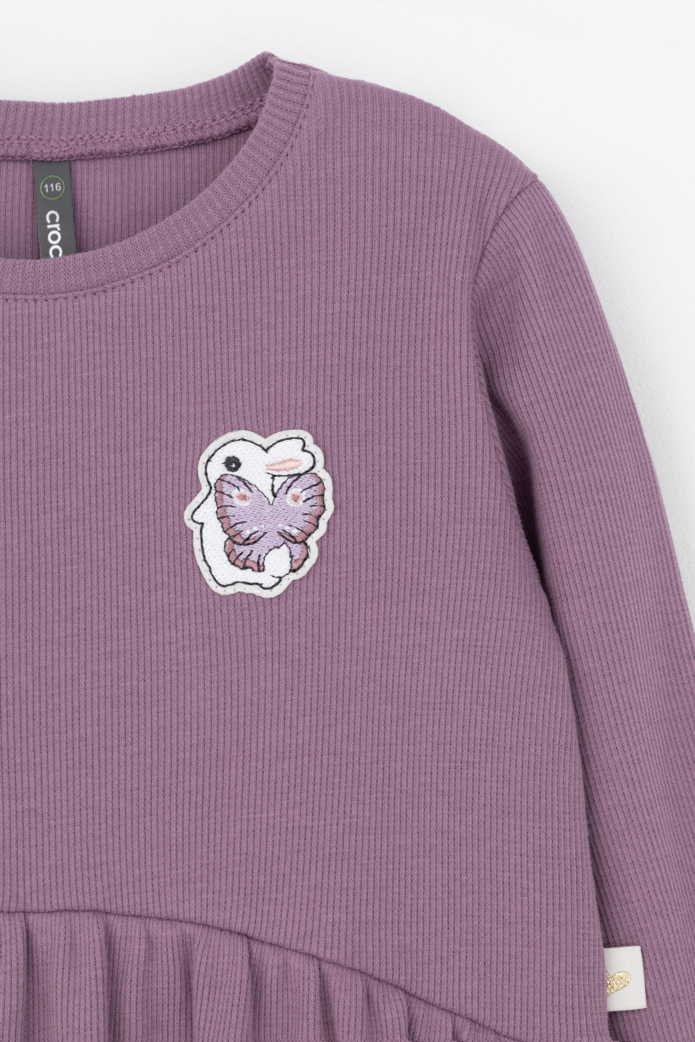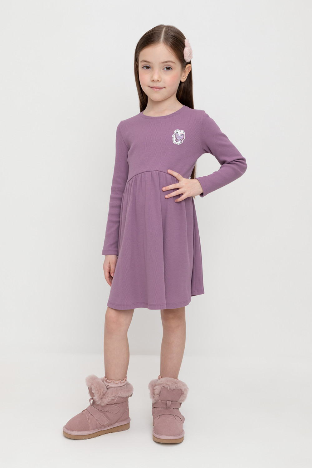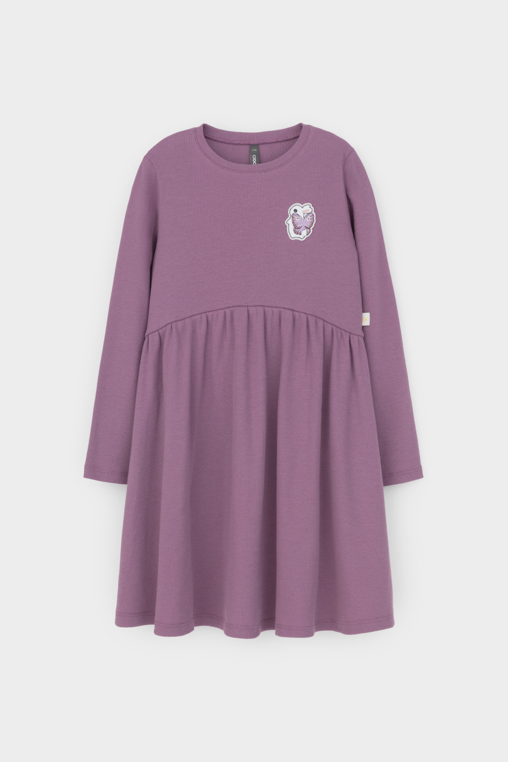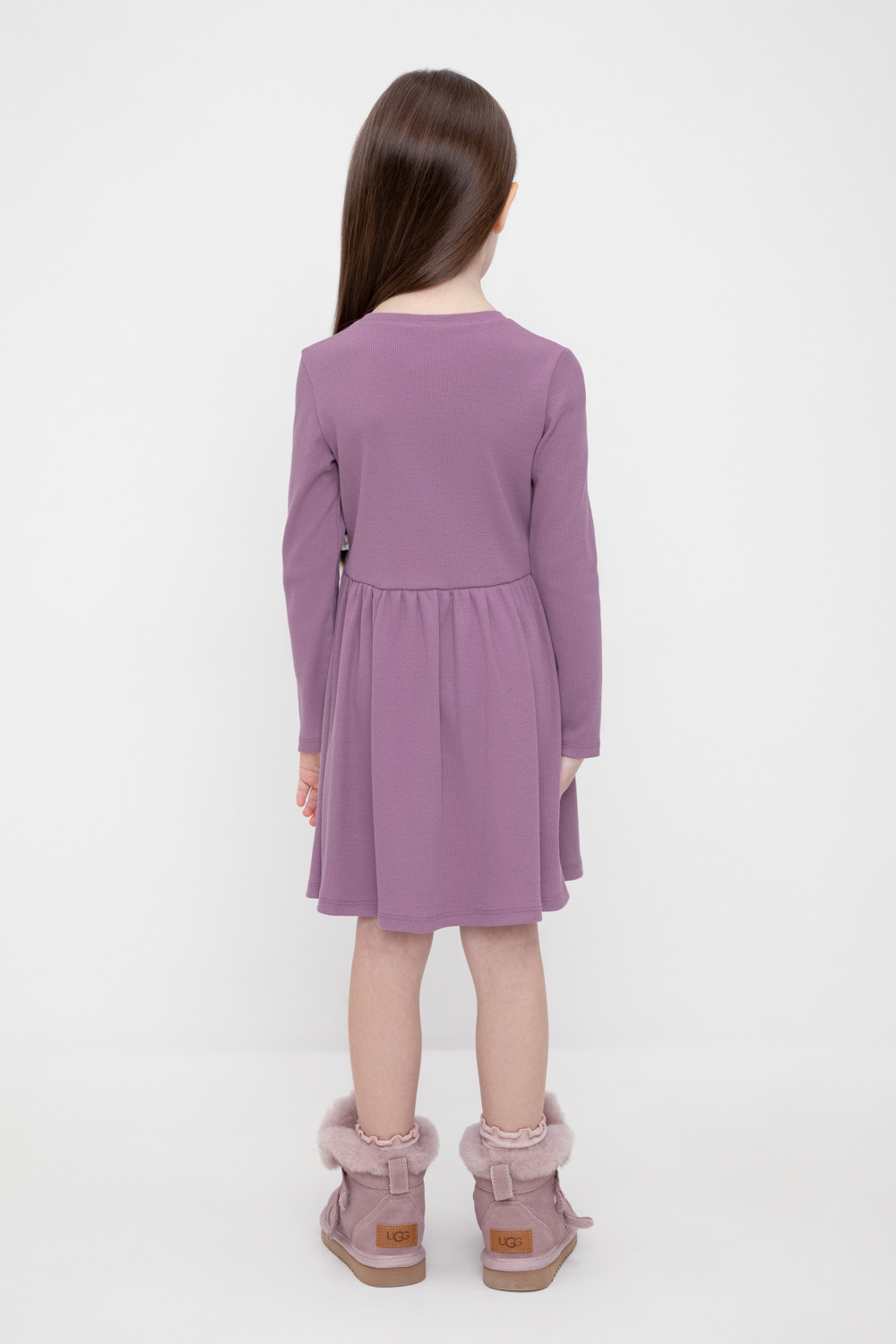 Платье для девочки из эластичного трикотажа в рубчик. Спереди нашивка.