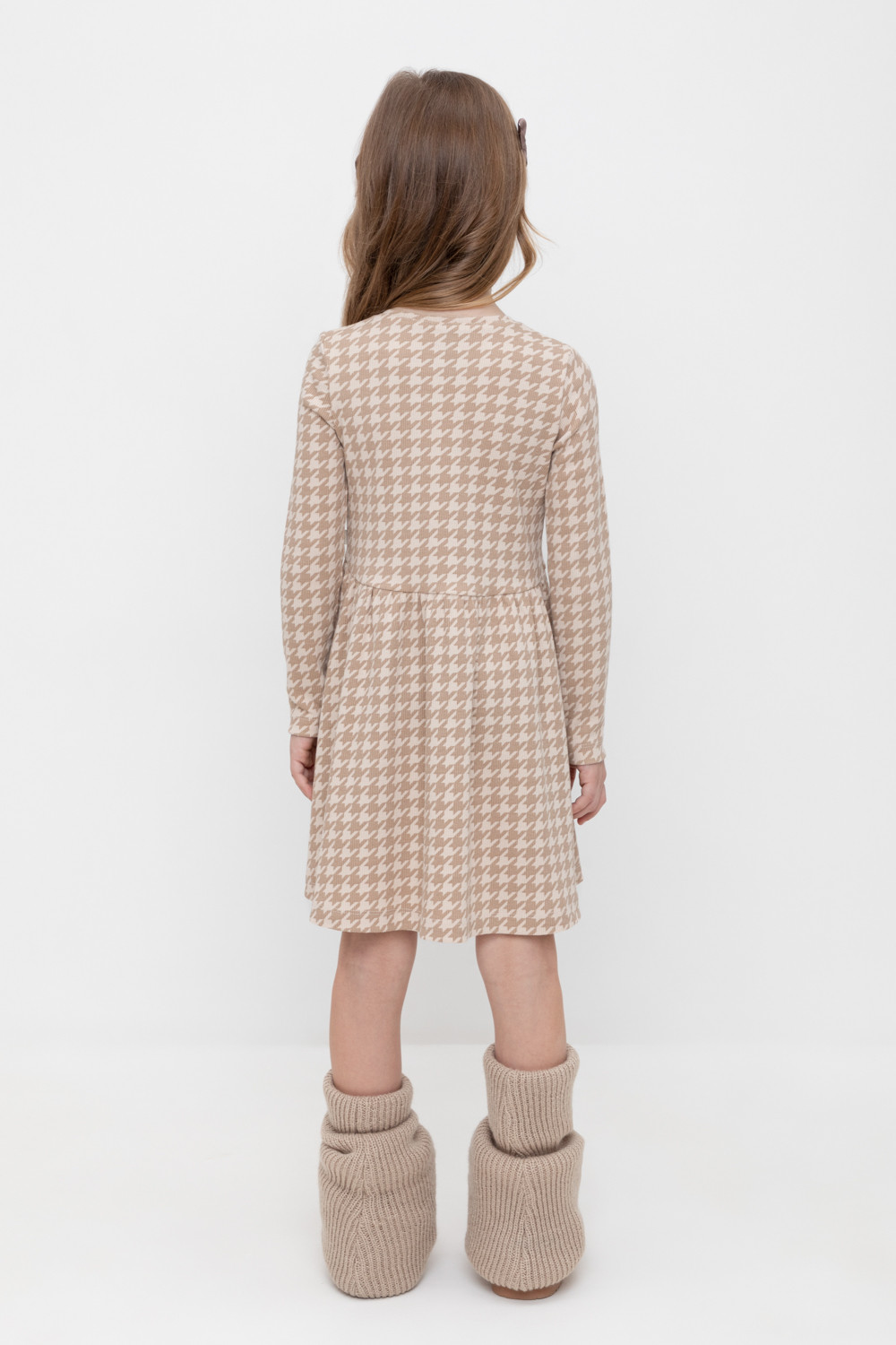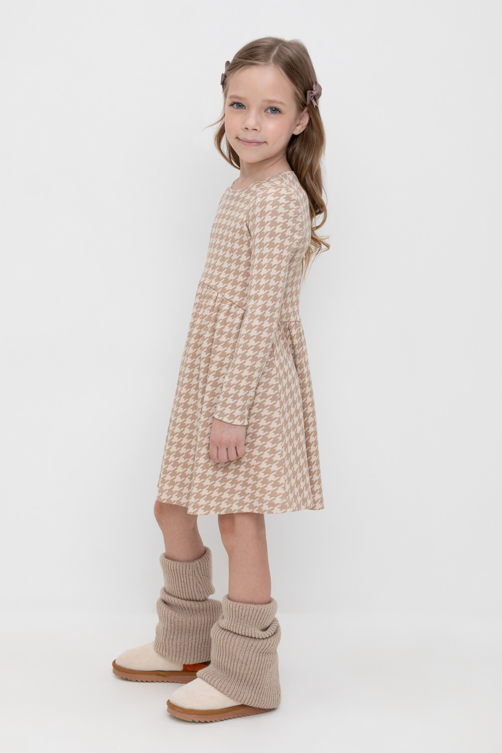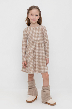 Платье для девочки из эластичного трикотажа в рубчик. Оригинальная набивка выполнена из стойких текстильных гипоаллергенных красителей.
