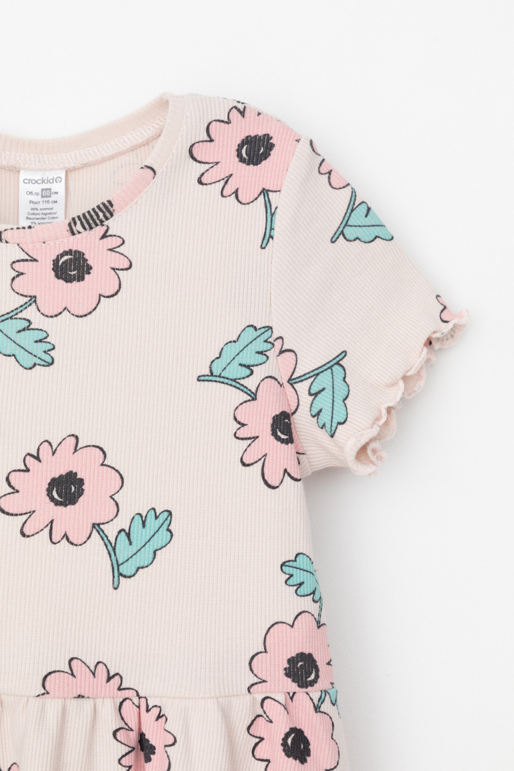 Летнее платье для девочки из эластичного трикотажа в рубчик. Оригинальная набивка выполнена из стойких текстильных гипоаллергенных красителей.