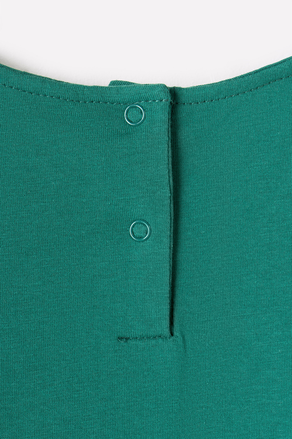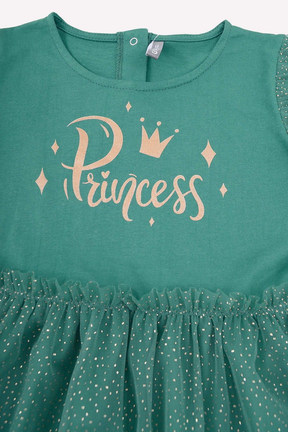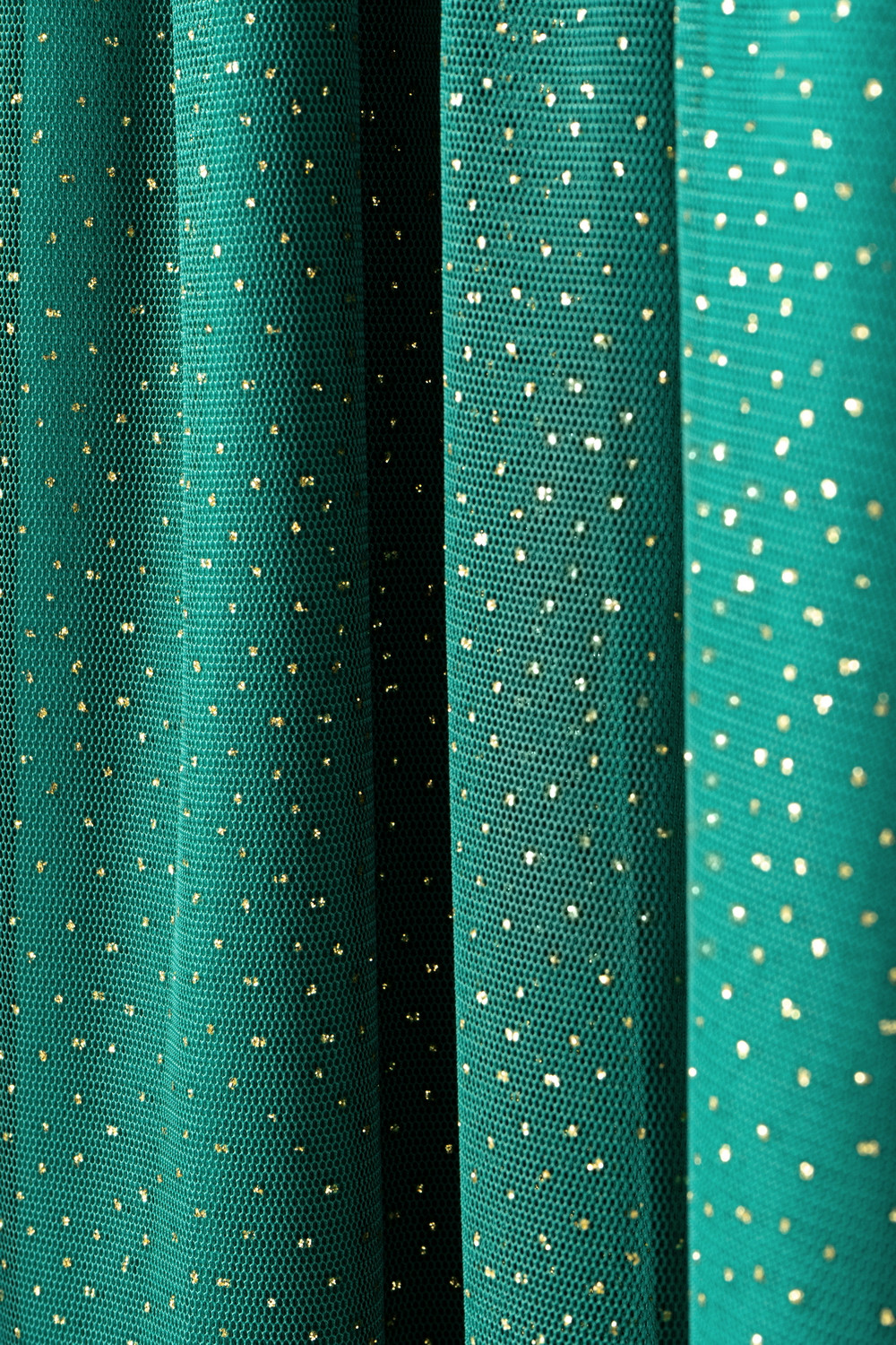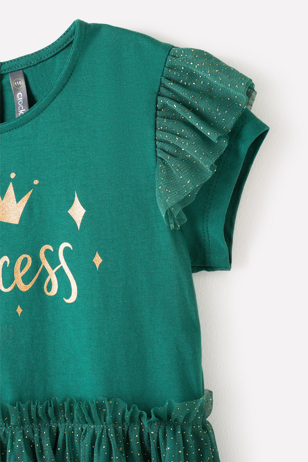 Нарядное тёмно-зелёное платье. Лиф из супрема украшен принтом. Верхний слой юбки сделан из сетки с золотыми блёстками, на талии красивая сборка. На рукавах оборка из сетки. До 98 размера для удобства при одевании застёгивается на спинке с помощью кнопок.
