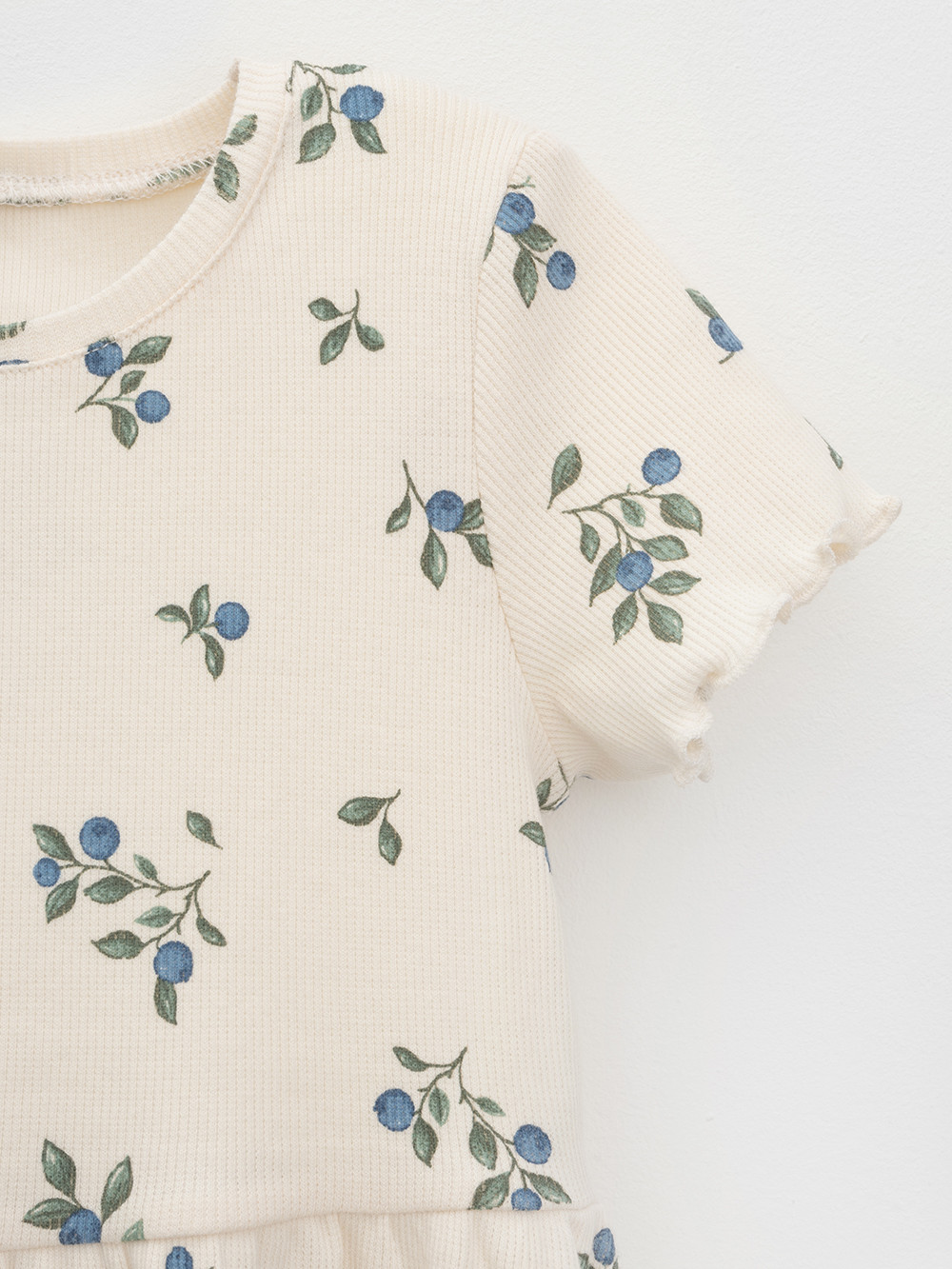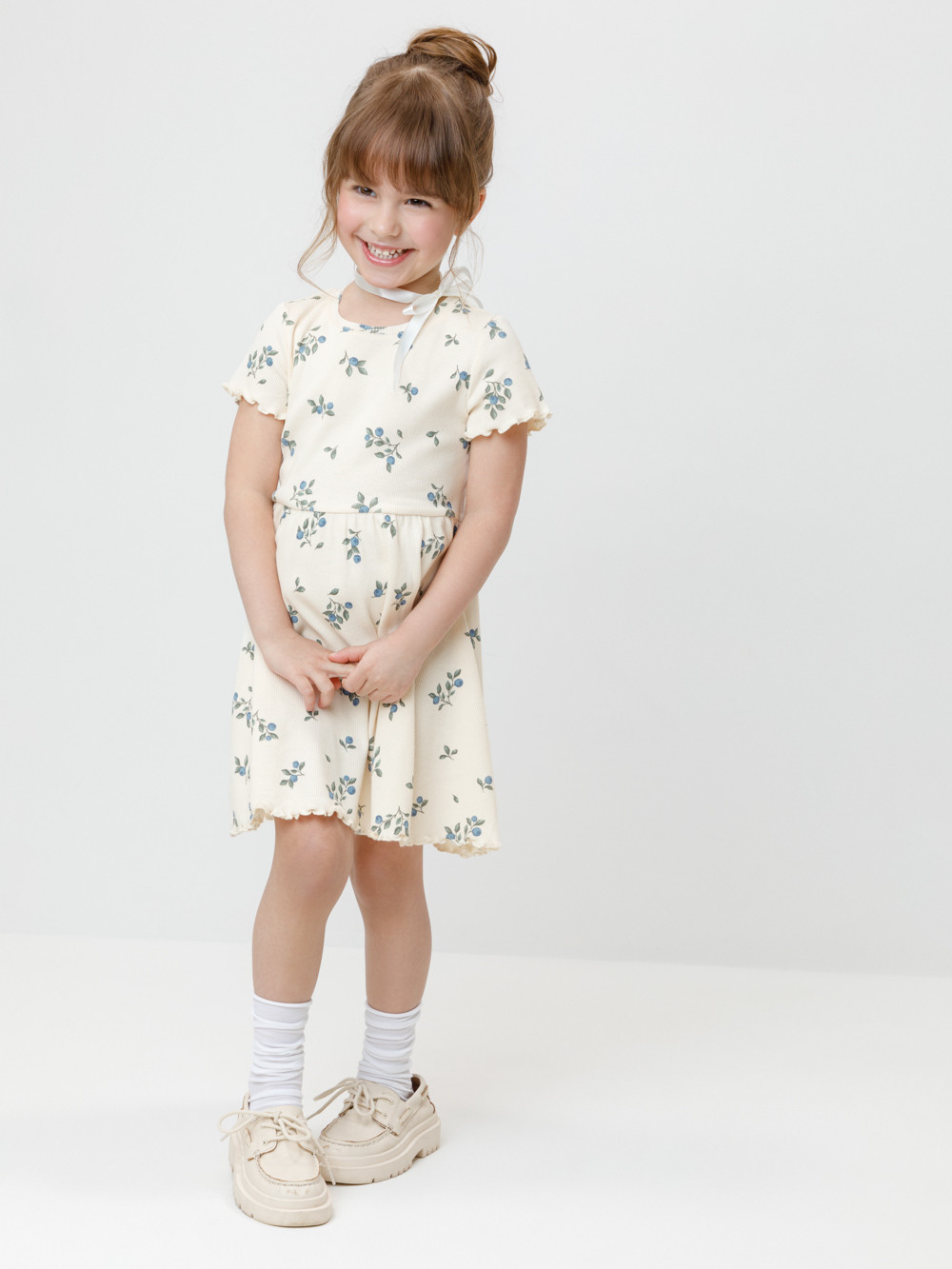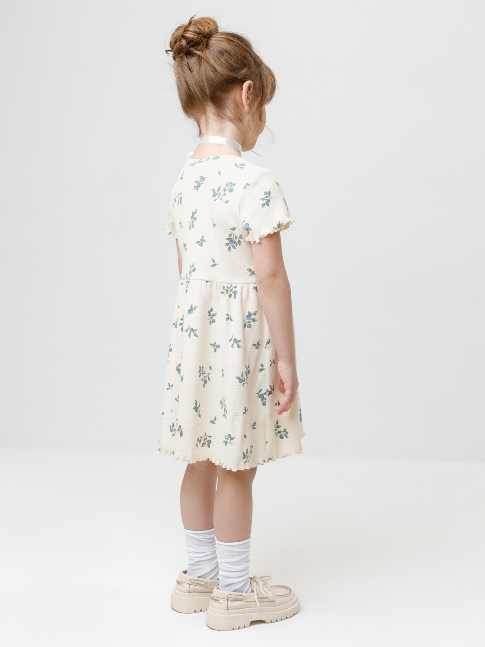 Лёгкое платье для девочки с короткими рукавами из эластичного трикотажа в рубчик. Оригинальная набивка выполнена из стойких текстильных гипоаллергенных красителей. Изделие сохраняет цвет и форму после многократных стирок.