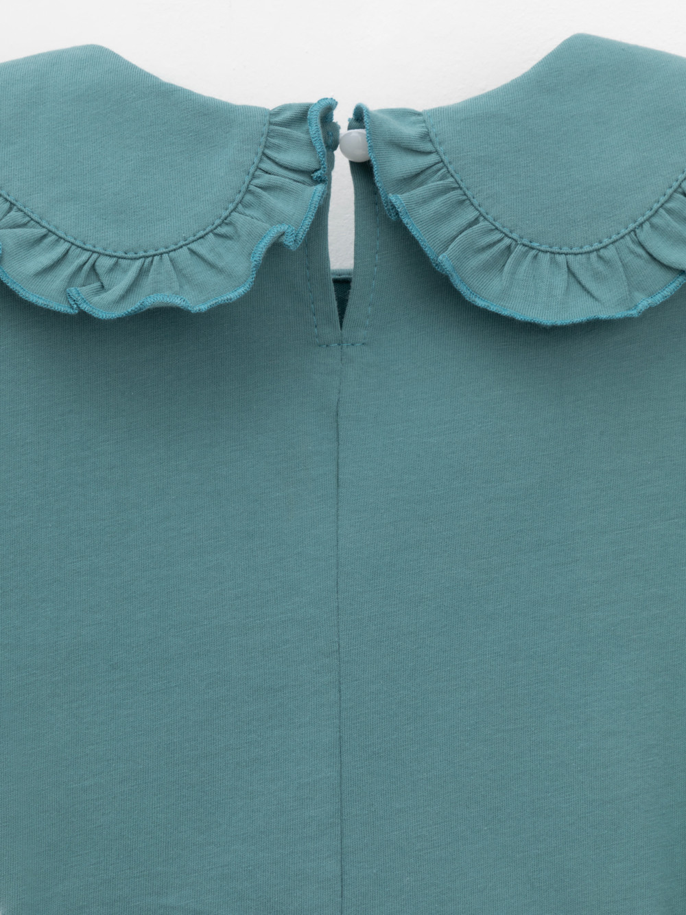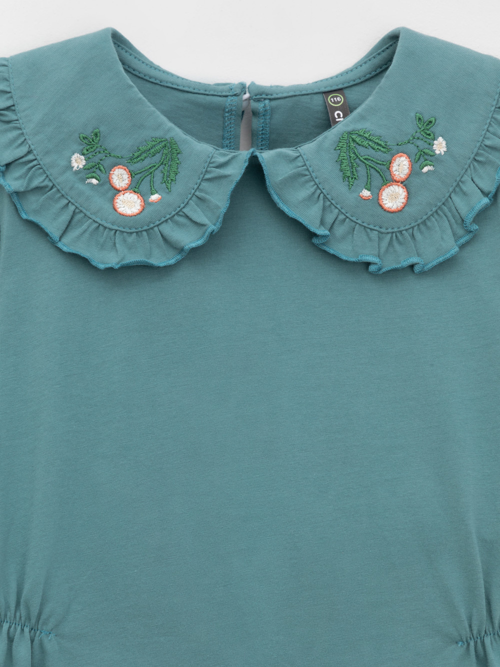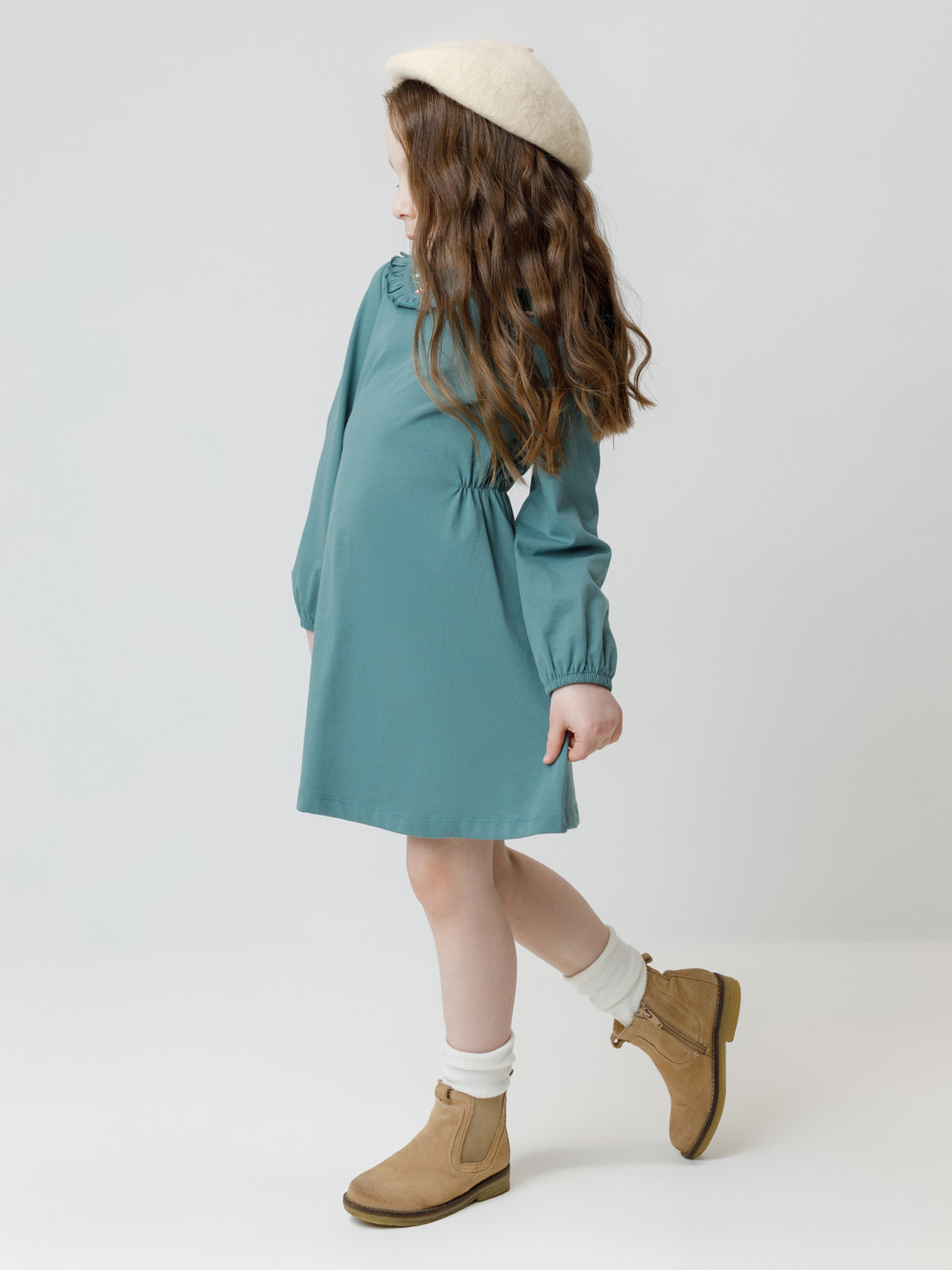 Платье для девочки с длинными рукавами из высококачественного трикотажа супрем. Украшено отложным воротничком с вышивкой. Для удобства одевания платье на спинке застёгивается на пуговицу. Платье сохраняет форму и стойкий цвет после многочисленных стирок и идеально подходит на каждый день. Все трикотажные полотна производятся в соответствии с нормами швейцарского сертификата ЭкоТекс.