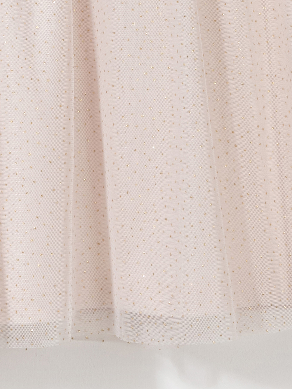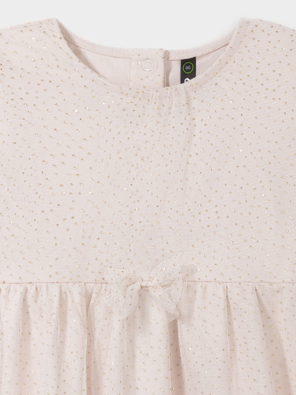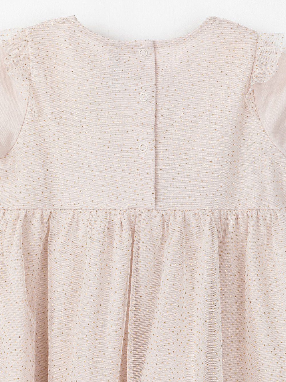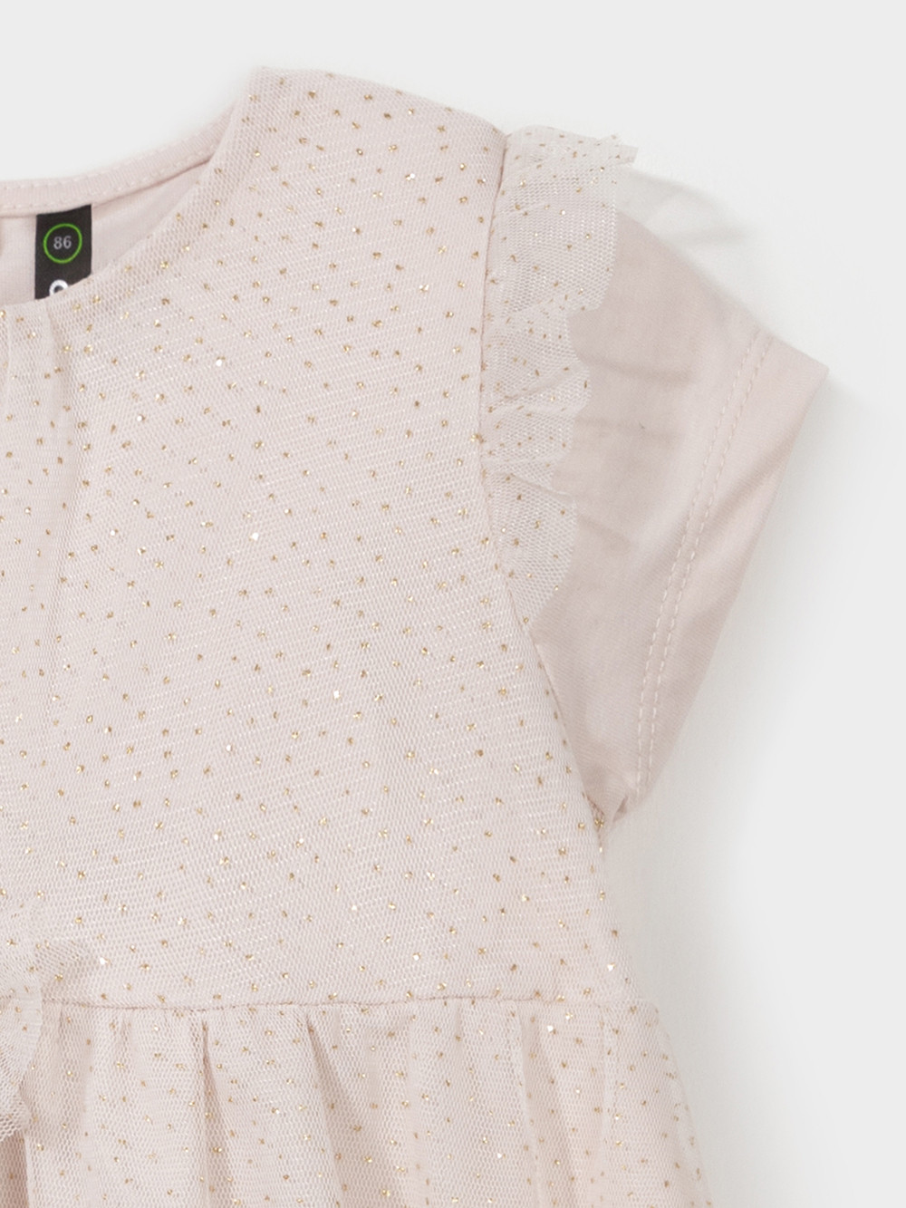 Нарядное платье с воздушными крылышками для девочки. Изготовлено из высококачественного хлопкового трикотажа супрем. Поверх трикотажа лёгкая сетка. Для удобства одевания на спинке расположена застёжка на кнопки. Спереди украшено декоративным бантиком. Изделие сохраняет цвет и форму после многократных стирок.