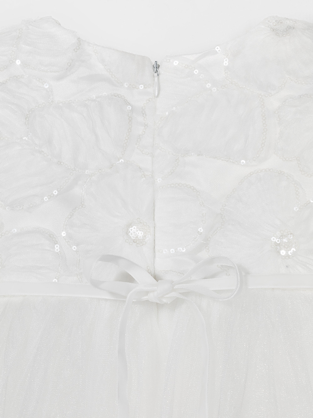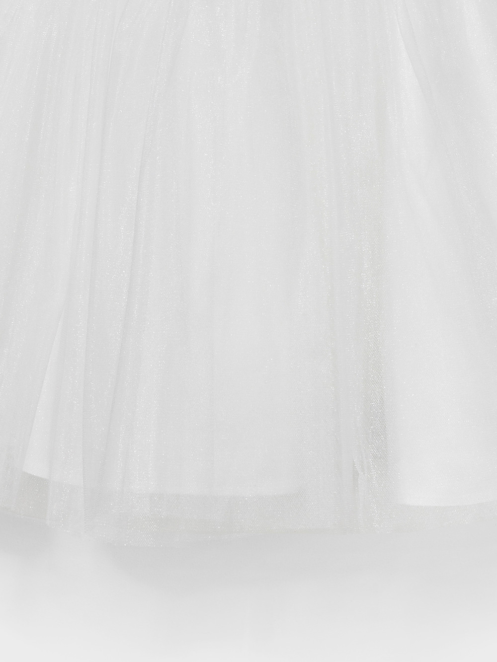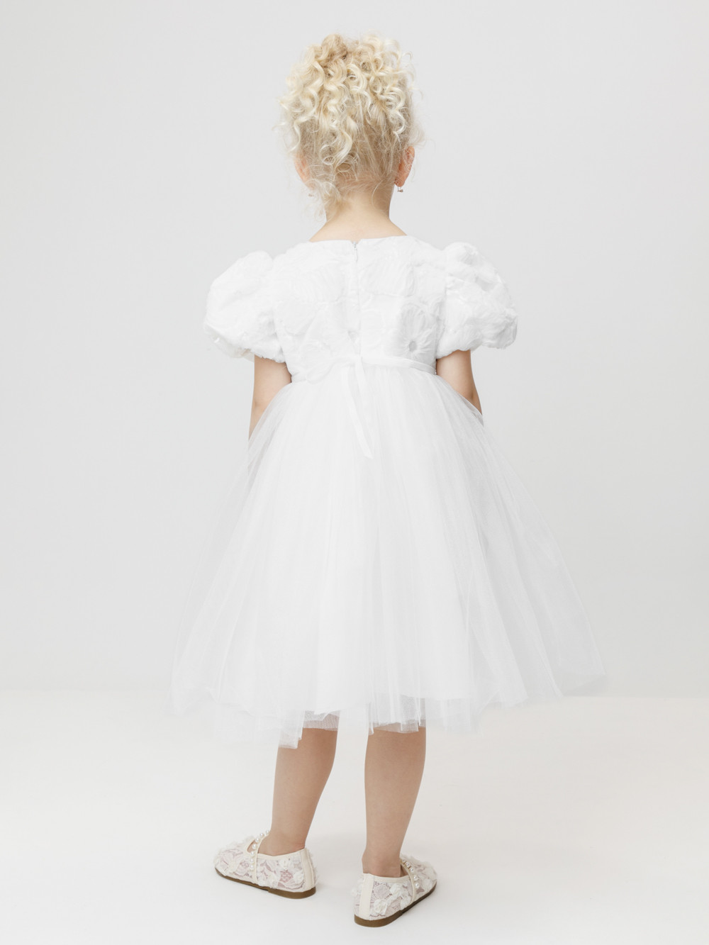 Нарядное платье с короткими рукавами-фонариками для девочки. Рукава и лиф изделия изготовлены из атласа и сетки с цветами. Юбка сшита из лёгкой блестящей сетки. Для удобства одевания на спинке предусмотрена застёжка на молнию. С помощью бархатной ленты можно регулировать ширину изделия по талии. Платье сохраняет форму и стойкий цвет после многочисленных стирок и идеально подходит для праздников и фотосессий.