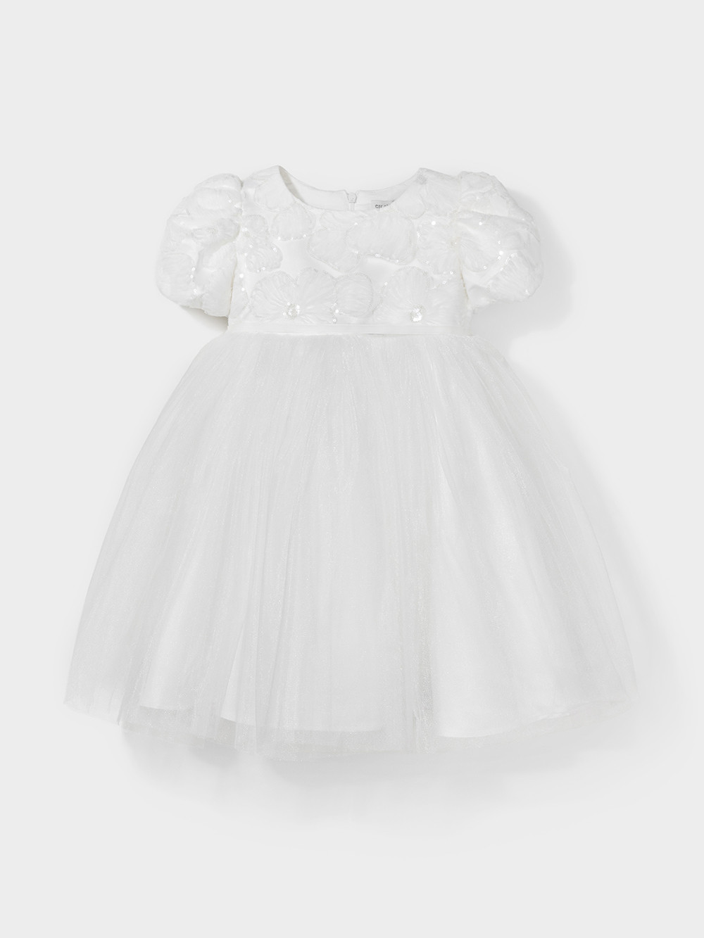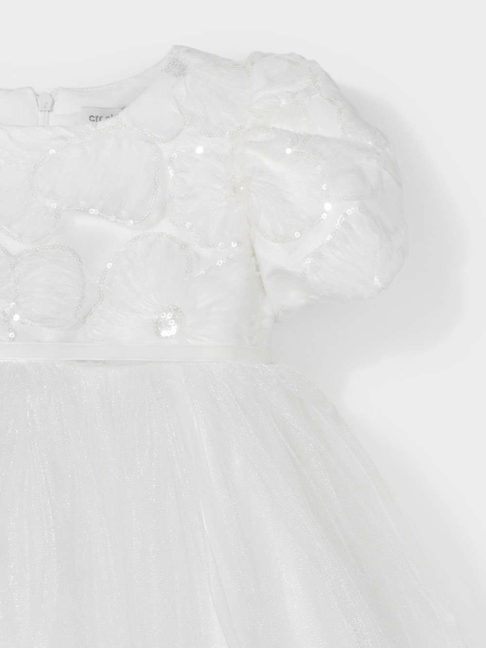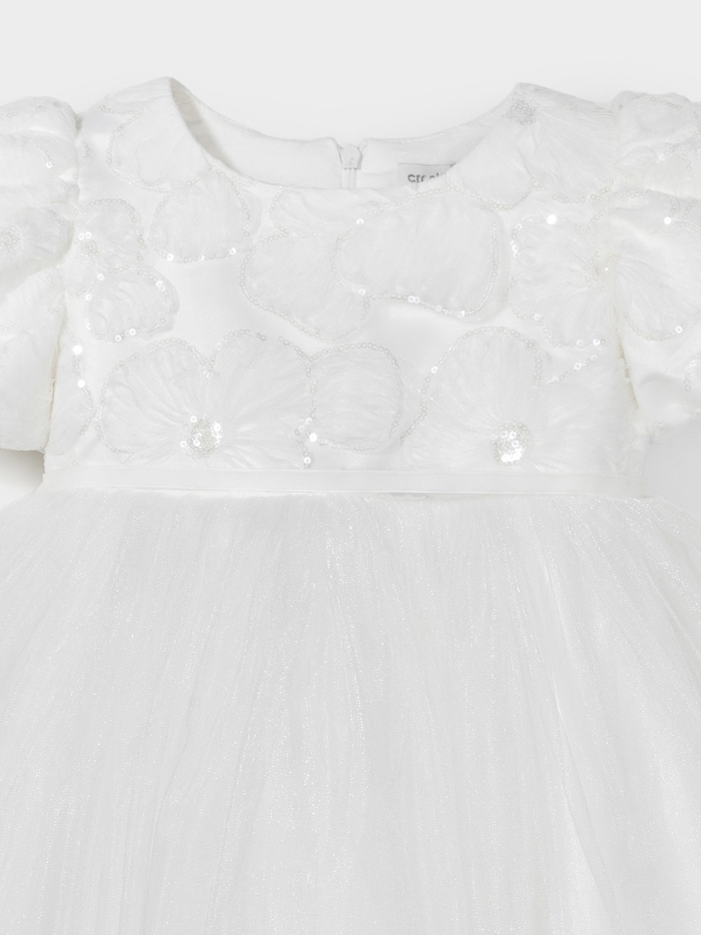 Нарядное платье с короткими рукавами-фонариками для девочки. Рукава и лиф изделия изготовлены из атласа и сетки с цветами. Юбка сшита из лёгкой блестящей сетки. Для удобства одевания на спинке предусмотрена застёжка на молнию. С помощью бархатной ленты можно регулировать ширину изделия по талии. Платье сохраняет форму и стойкий цвет после многочисленных стирок и идеально подходит для праздников и фотосессий.