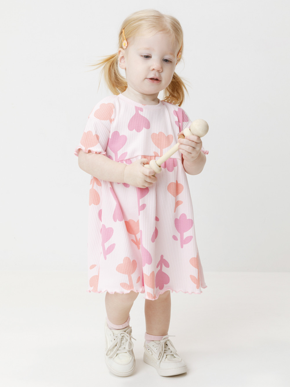Платье для девочки из эластичного трикотажа в рубчик. Застёгивается на спинке на кнопки. Оригинальный рисунок выполнен из стойких текстильных гипоаллергенных красителей. Изделие сохраняет цвет и форму после многократных стирок. Все трикотажные полотна производятся в соответствии с нормами швейцарского сертификата ЭкоТекс.