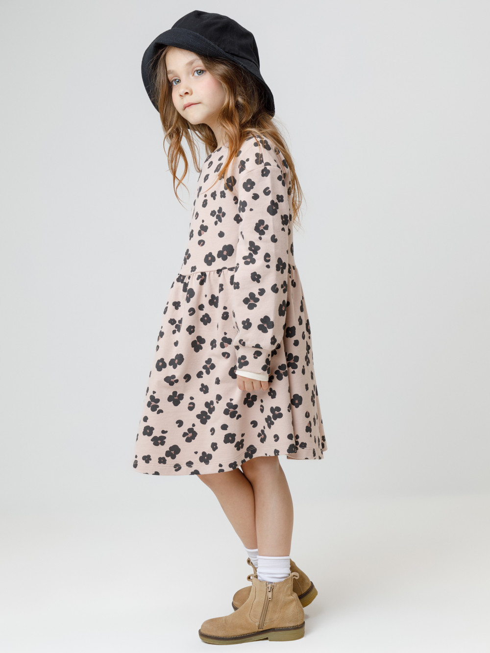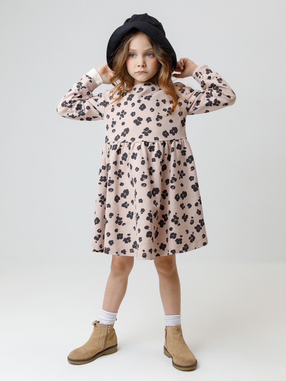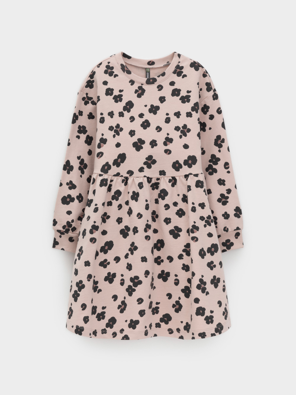 Платье с длинными рукавами для девочки из мягкого петельчатого футера. В размерах 92 и 98 на спине застёгивается на кнопки. Оригинальный рисунок выполнен из стойких текстильных гипоаллергенных красителей. Изделие сохраняет цвет и форму после многократных стирок. Все трикотажные полотна производятся в соответствии с нормами швейцарского сертификата ЭкоТекс.
