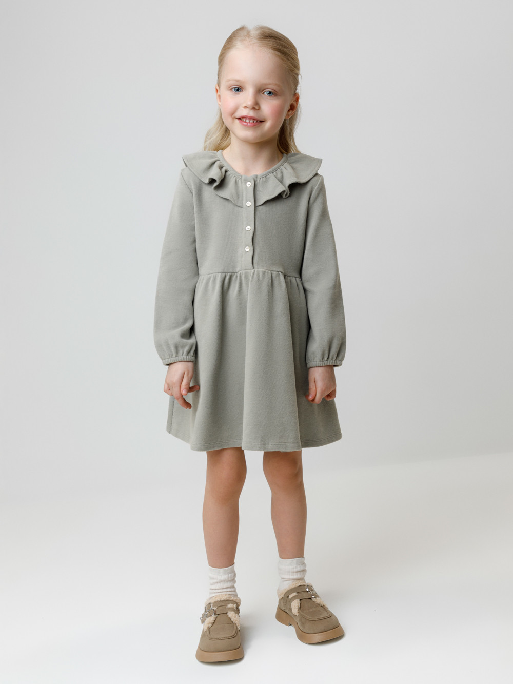 Платье для девочки с длинными рукавами из мягкого трикотажа селаник с peach эффектом. Peach эффект достигается с помощью технологии обработки полотна, при которой на его поверхности создаётся лёгкий ворс, напоминающий нежную текстуру кожи персика. Для удобства одевания спереди застёгивается на пуговицы. Платье сохраняет форму и стойкий цвет после многочисленных стирок и идеально подходит на каждый день. Все трикотажные полотна производятся в соответствии с нормами швейцарского сертификата ЭкоТекс.