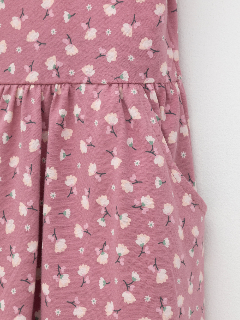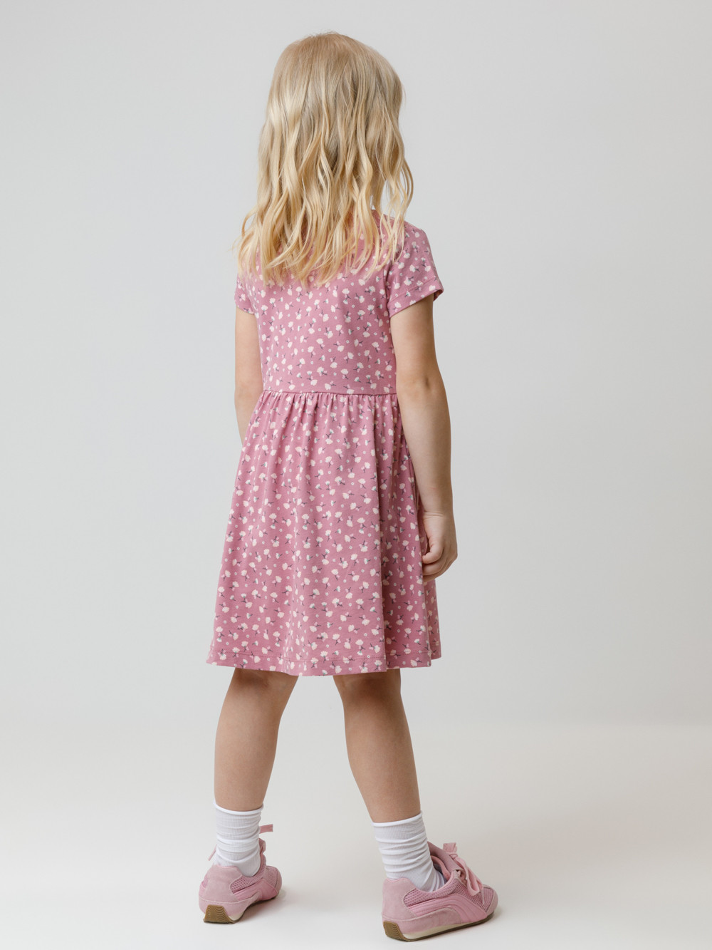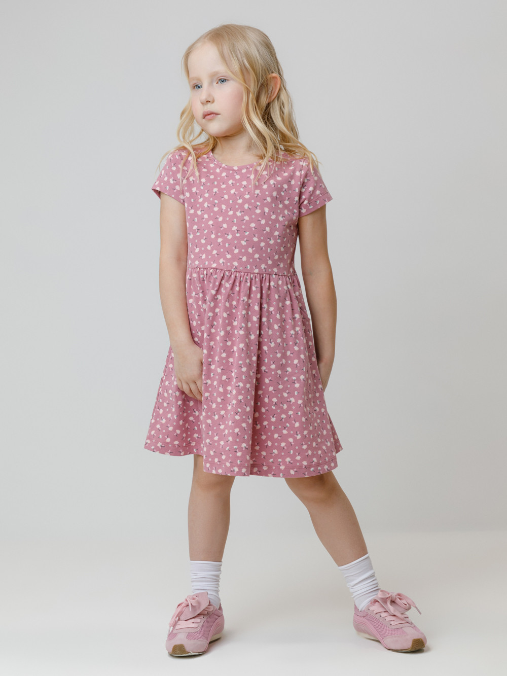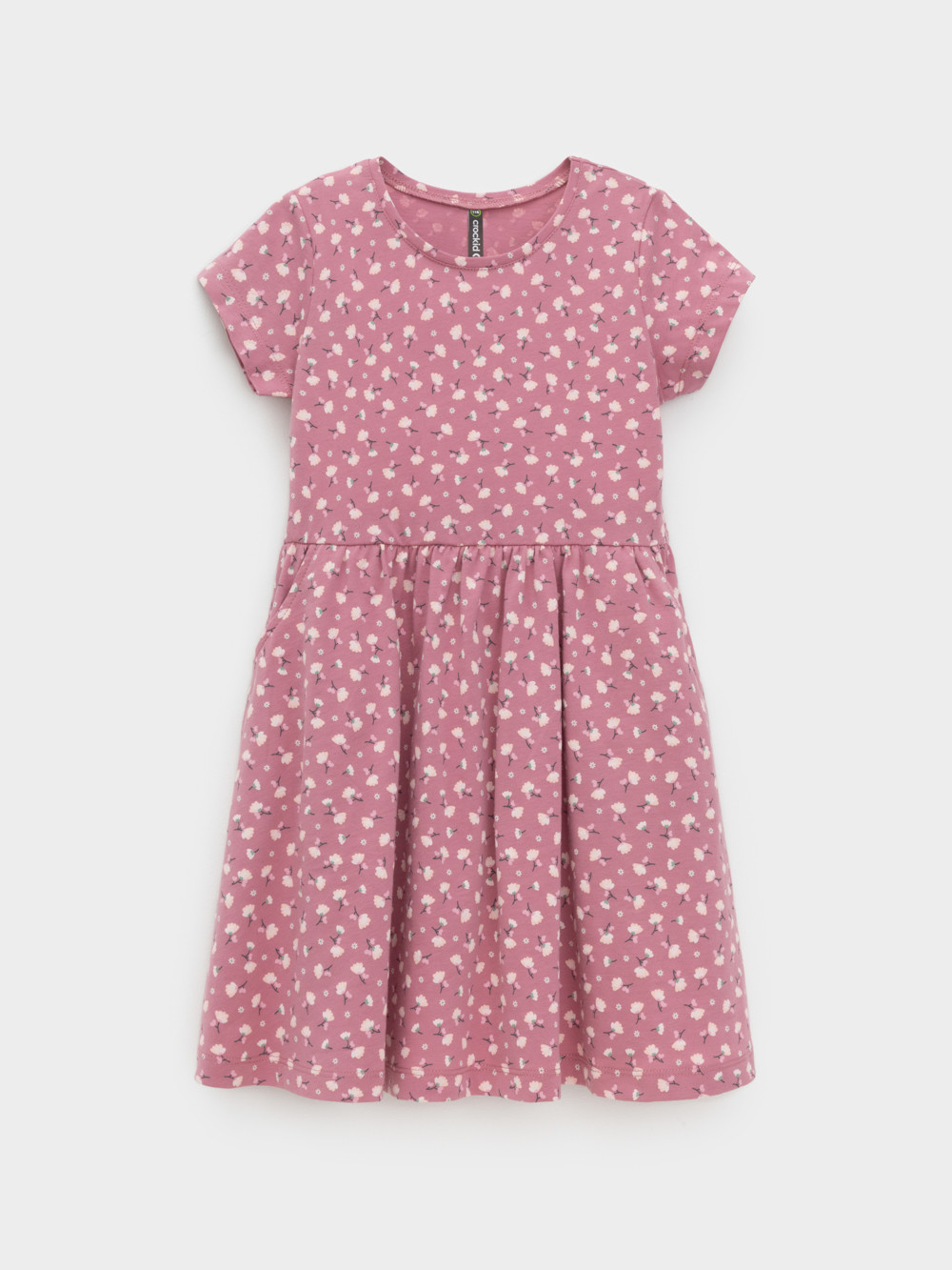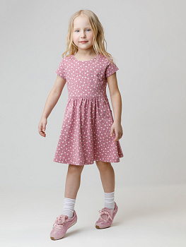Платье с короткими рукавами и удобными карманами для девочки. Изготовлено из высококачественного гладкого трикотажа, произведённого из натурального хлопка. Для удобства одевания в размерах 92 и 98 на плече платье застёгивается на кнопки. Изделие  сохраняет форму и стойкий цвет после многочисленных стирок и идеально подходит на каждый день. Все трикотажные полотна производятся в соответствии с нормами швейцарского сертификата ЭкоТекс.
