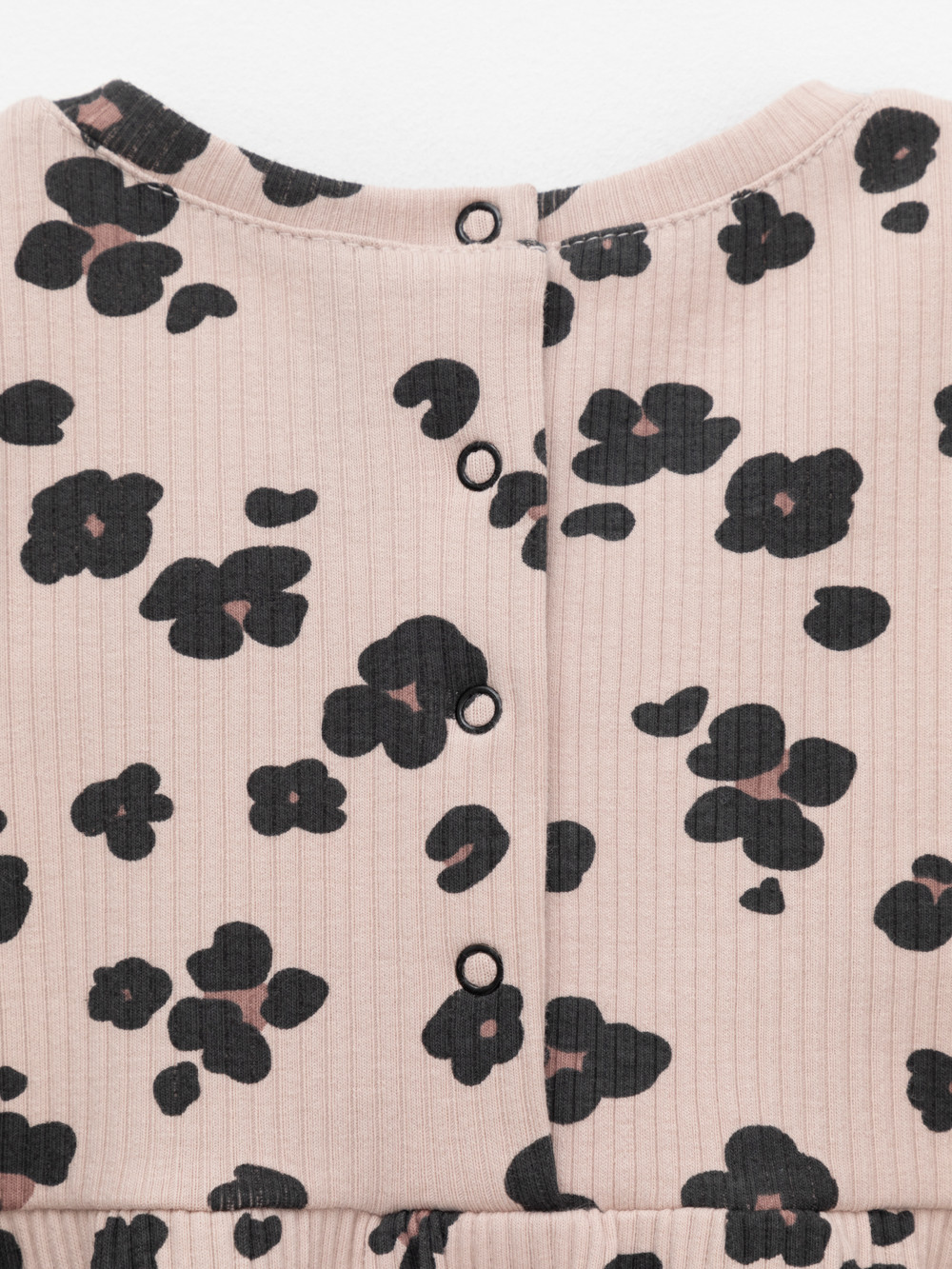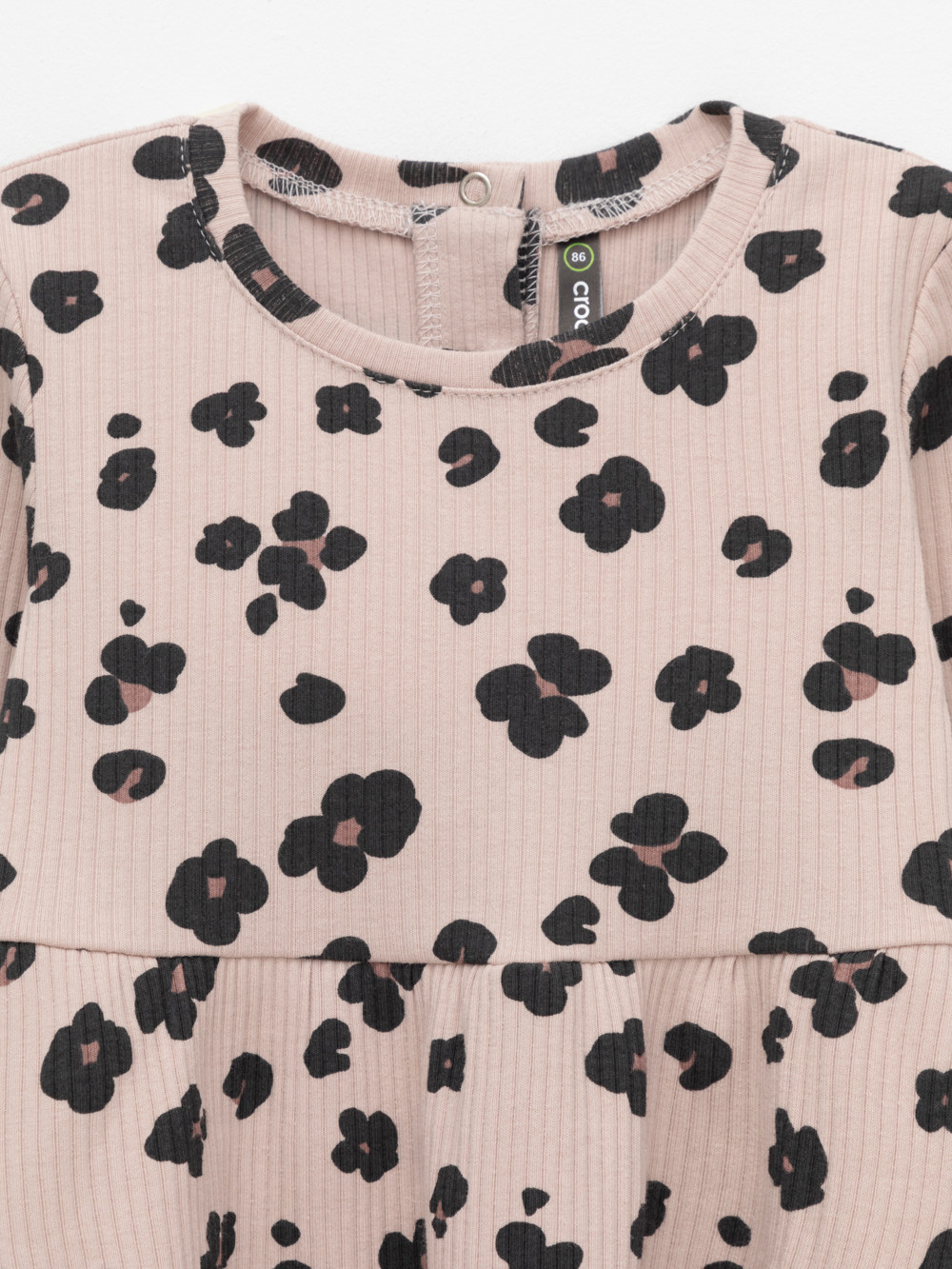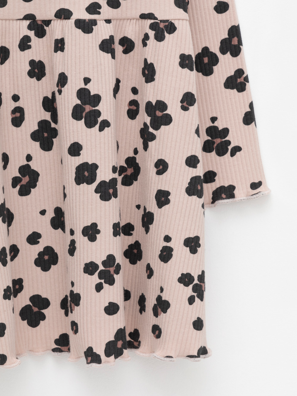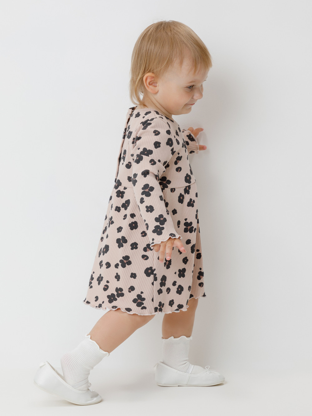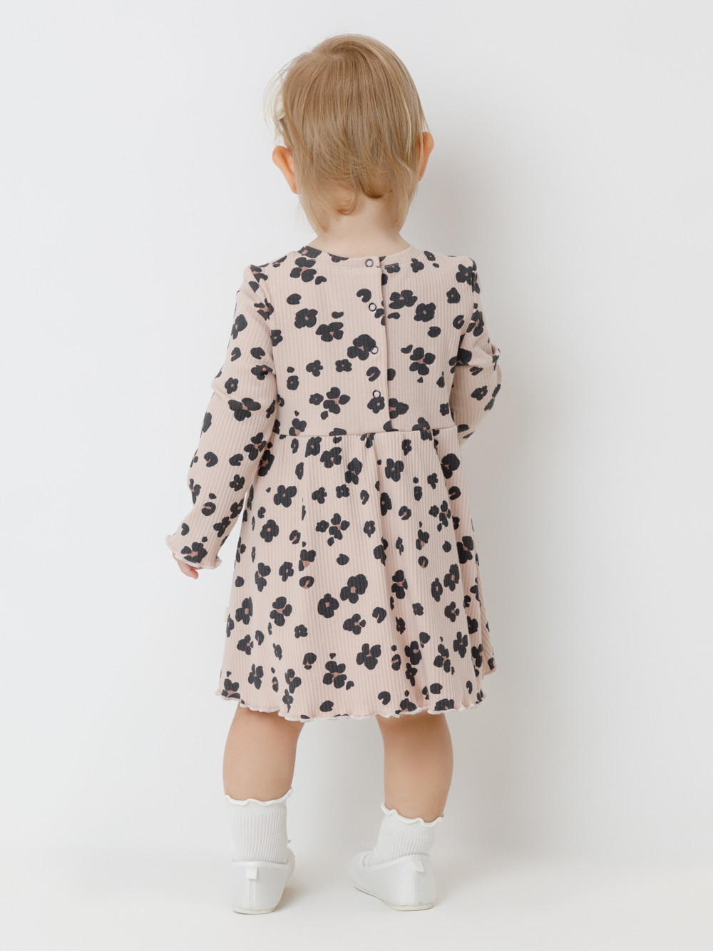 Платье для девочки из эластичного трикотажа в рубчик. Оригинальный рисунок выполнен из стойких текстильных гипоаллергенных красителей. Изделие сохраняет цвет и форму после многократных стирок. Все трикотажные полотна производятся в соответствии с нормами швейцарского сертификата ЭкоТекс.