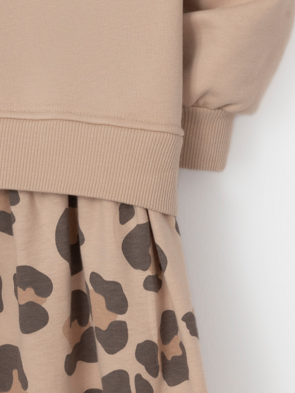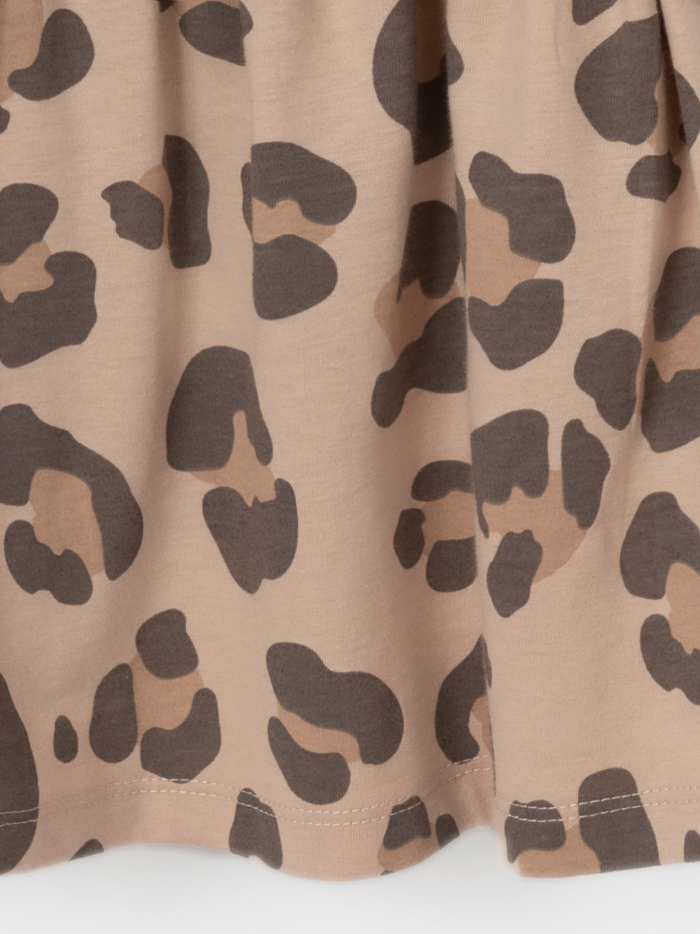 Платье для девочки с длинными рукавами и воротничком. Изготовлено из мягкого петельчатого трикотажа и украшено оборкой из гладкого материала супрем. Спереди застёжка на короткую молнию. Платье сохраняет форму и стойкий цвет после многочисленных стирок и идеально подходит на каждый день. Оригинальный принт выполнен из стойких текстильных гипоаллергенных красителей. Все трикотажные полотна производятся в соответствии с нормами швейцарского сертификата ЭкоТекс.