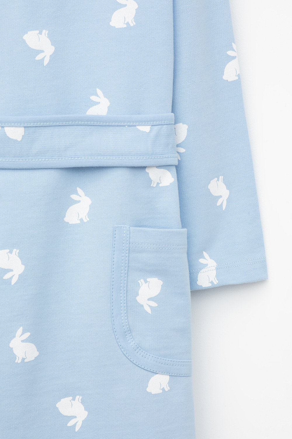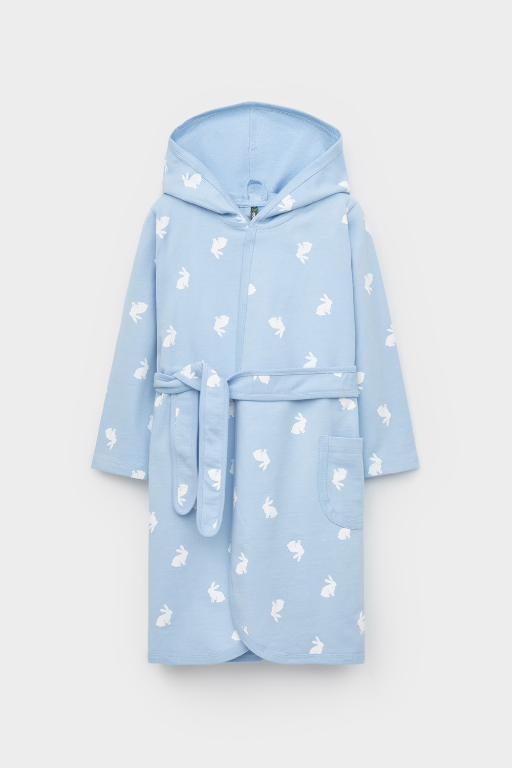 Халат с тонким капюшоном и поясом из набивного хлопкового трикотажа футер петля. Края обработаны мягким кантом. Накладной карман уходит в шов. Пояс продет в шлевки. Длинные рукава обработаны плоскими швами.