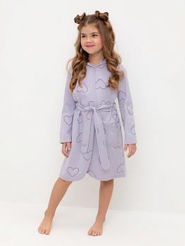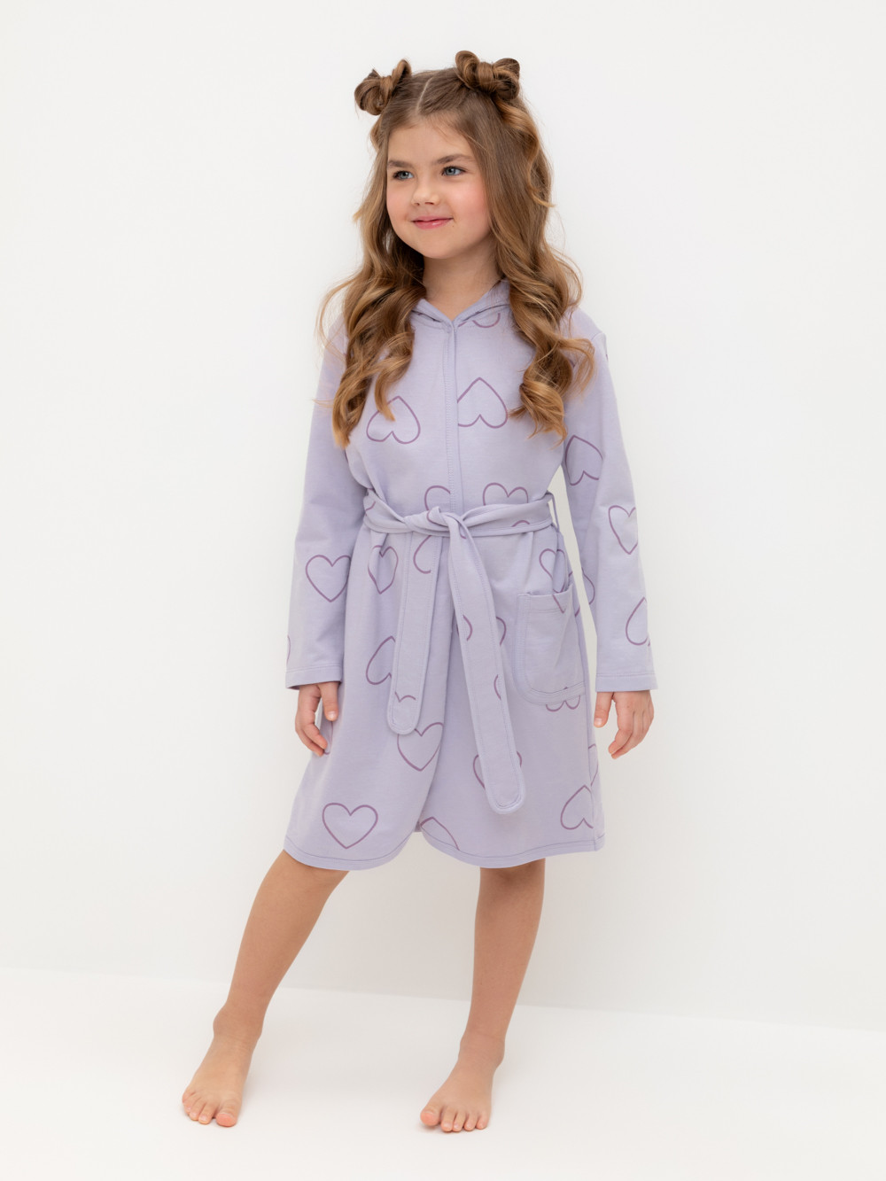Халат с тонким капюшоном. Изготовлен из набивного хлопкового трикотажа футер петля. С помощью пояса можно регулировать посадку по фигуре. Сверху застёжка на кнопку. Края изделия обработаны мягким кантом. На боку накладной карман, уходящий в шов. Оригинальная набивка выполнена из стойких гипоаллергенных текстильных красителей. Все трикотажные полотна производятся в соответствии с нормами швейцарского сертификата ЭкоТекс.