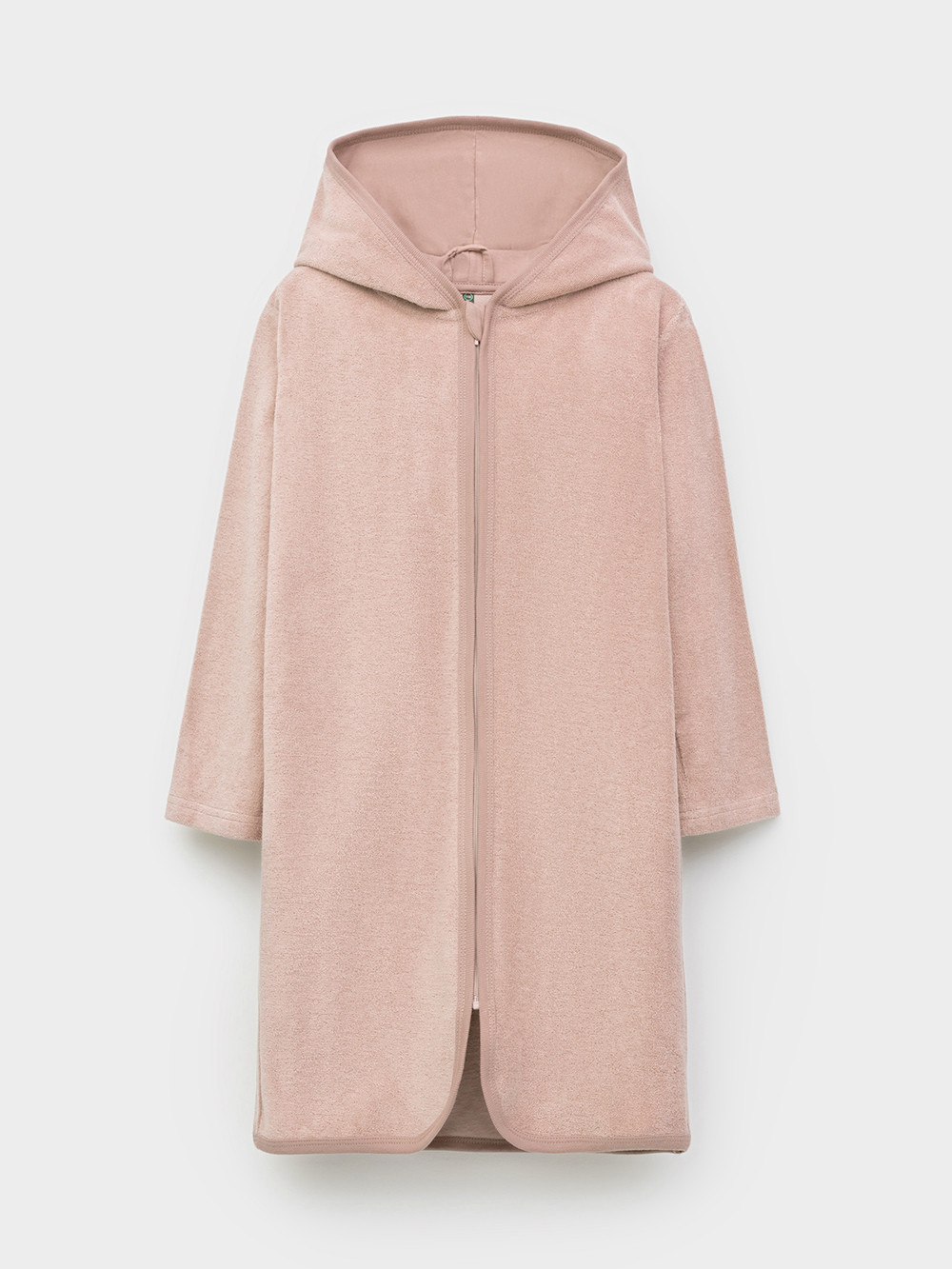 Халат на молнии с капюшоном. Изготовлен из мягкого махрового полотна, произведённого из натурального хлопка. В капюшоне подклад из высококачественного гладкого трикотажа супрем. Края обработаны эластичным кантом. Все трикотажные полотна производятся в соответствии с нормами швейцарского сертификата ЭкоТекс.