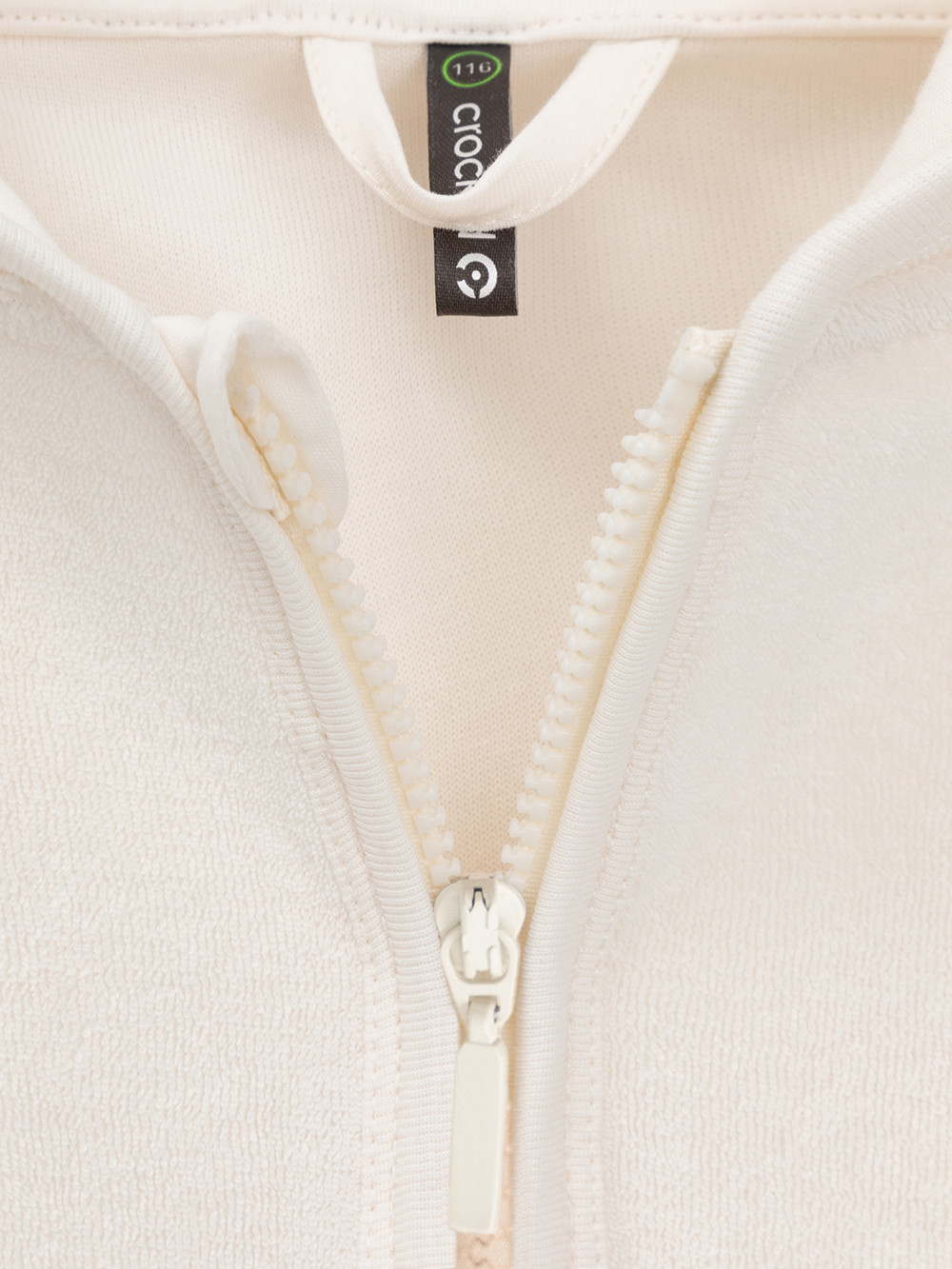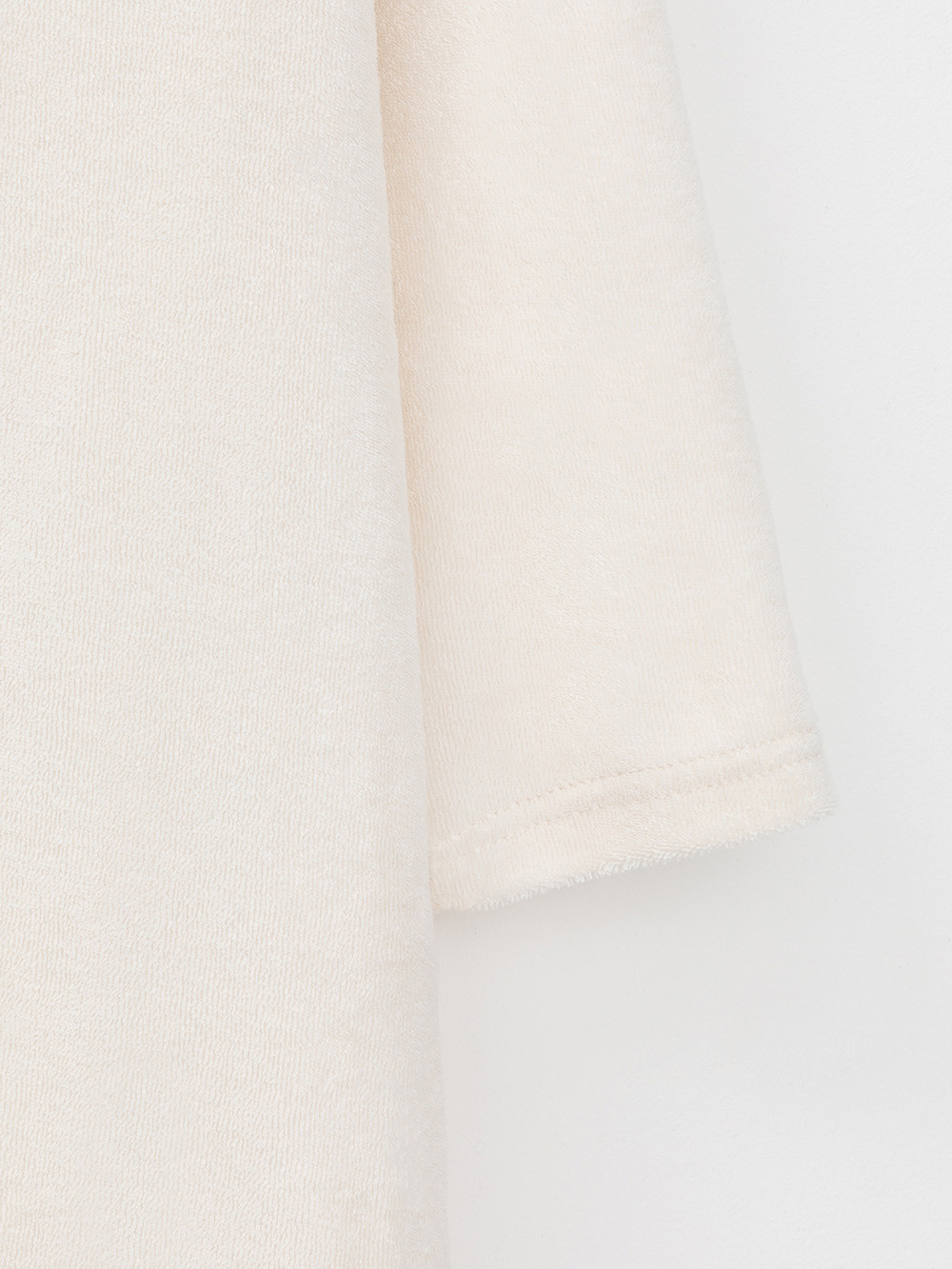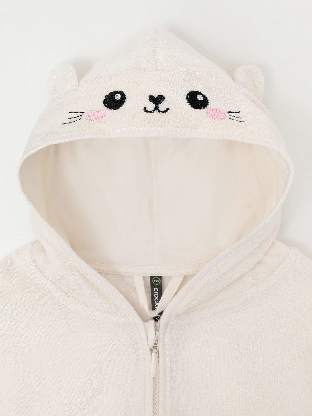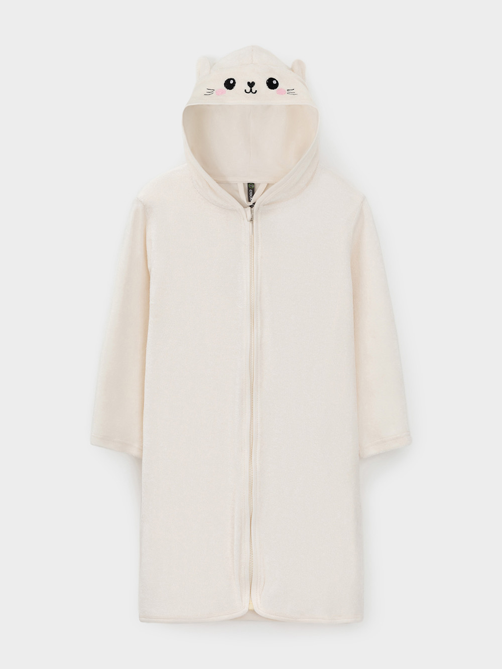 Халат на молнии с капюшоном. Изготовлен из мягкого махрового полотна, произведённого из натурального хлопка. В капюшоне подклад из высококачественного гладкого трикотажа супрем. Изделие украшено вышивкой и декоративными ушками. Края обработаны эластичным кантом. Все трикотажные полотна производятся в соответствии с нормами швейцарского сертификата ЭкоТекс.