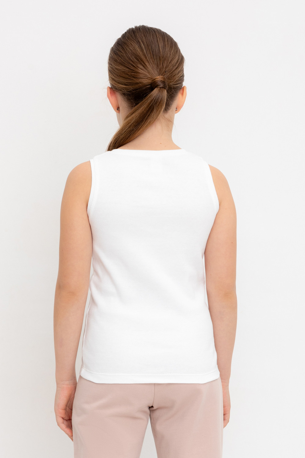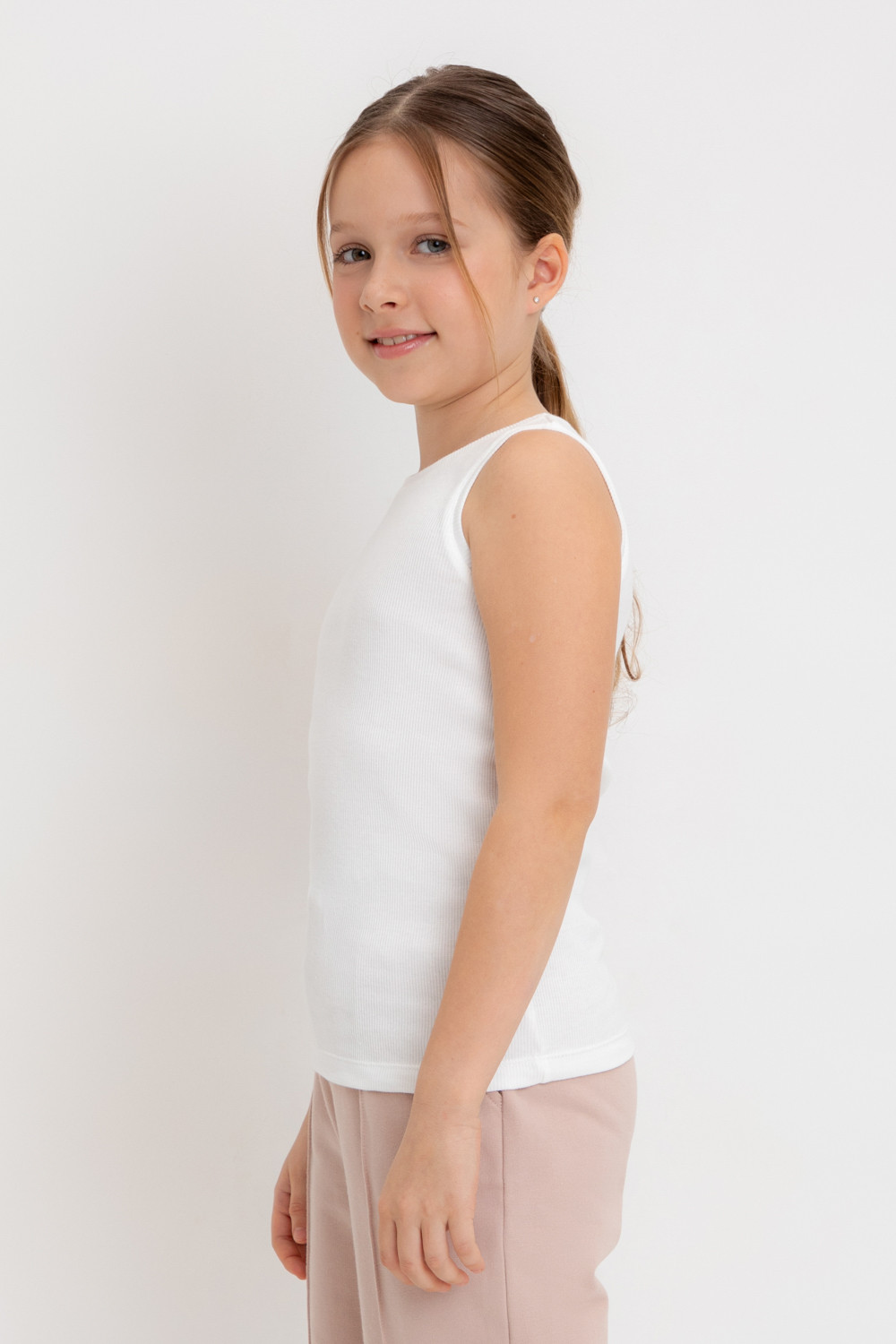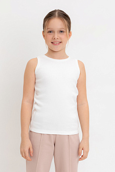 Майка для девочки из эластичного трикотажа в рубчик. Изделие сохраняет цвет и форму после многократных стирок.