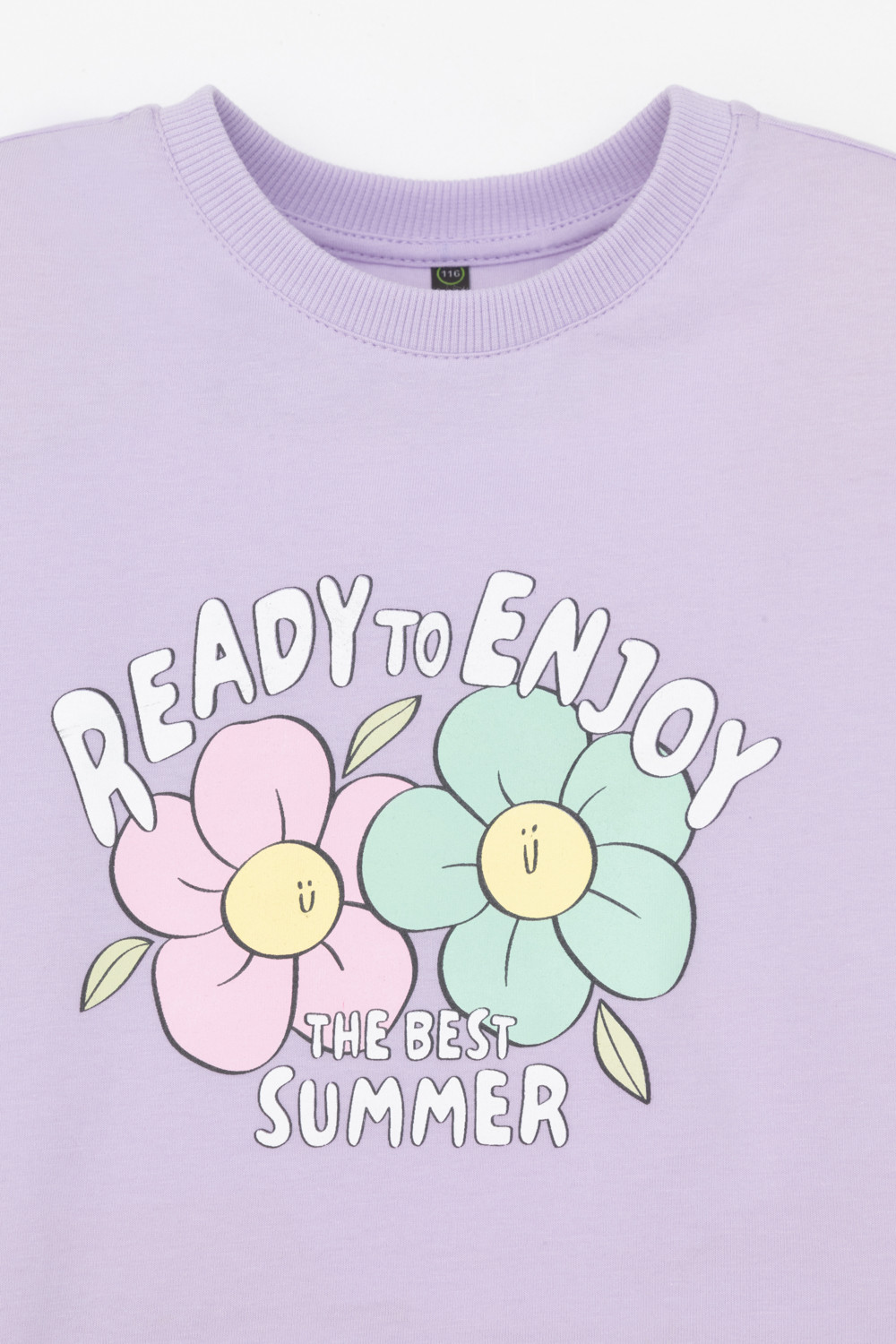 Футболка укороченная для девочки из высококачественного трикотажного полотна. Оригинальный принт выполнен из стойких текстильных гипоаллергенных красителей. Для удобства одевания на спинке в размерах 92 и 98 есть застежка на кнопки.