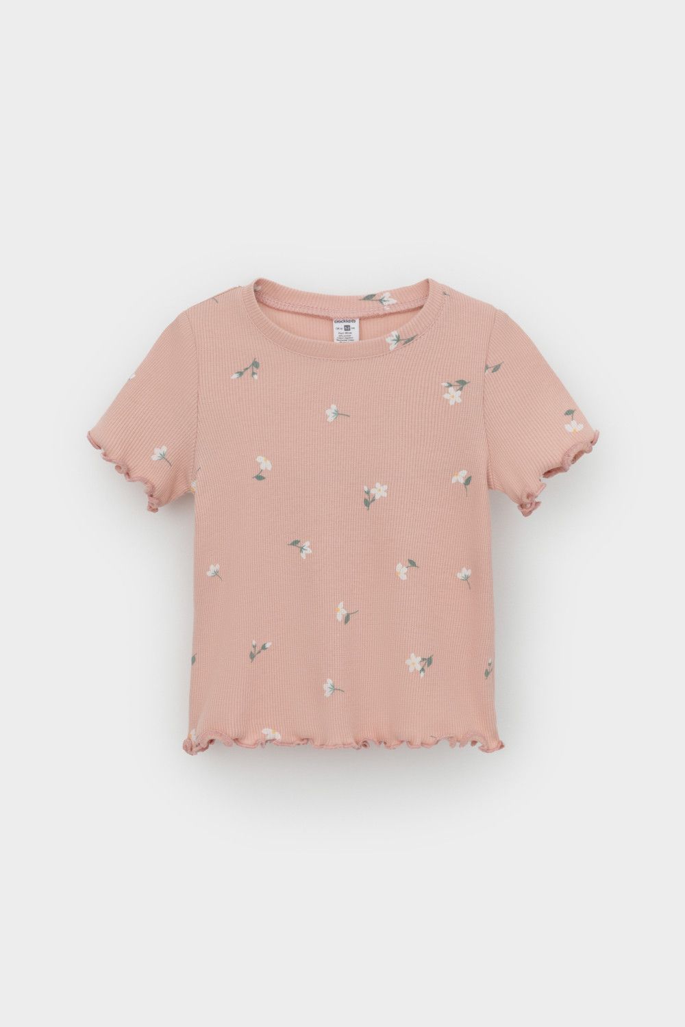 Футболка для девочки из эластичного трикотажа в рубчик. Оригинальная набивка выполнена из стойких текстильных гипоаллергенных красителей. Изделие сохраняет цвет и форму после многократных стирок.
