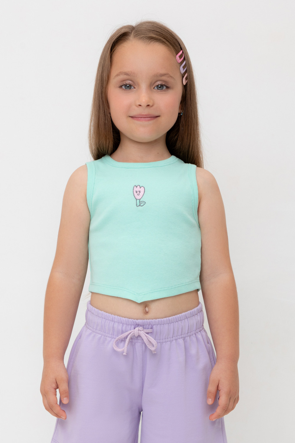 Топ с вышивкой для девочки из эластичного трикотажа в рубчик. Изделие сохраняет цвет и форму после многократных стирок.