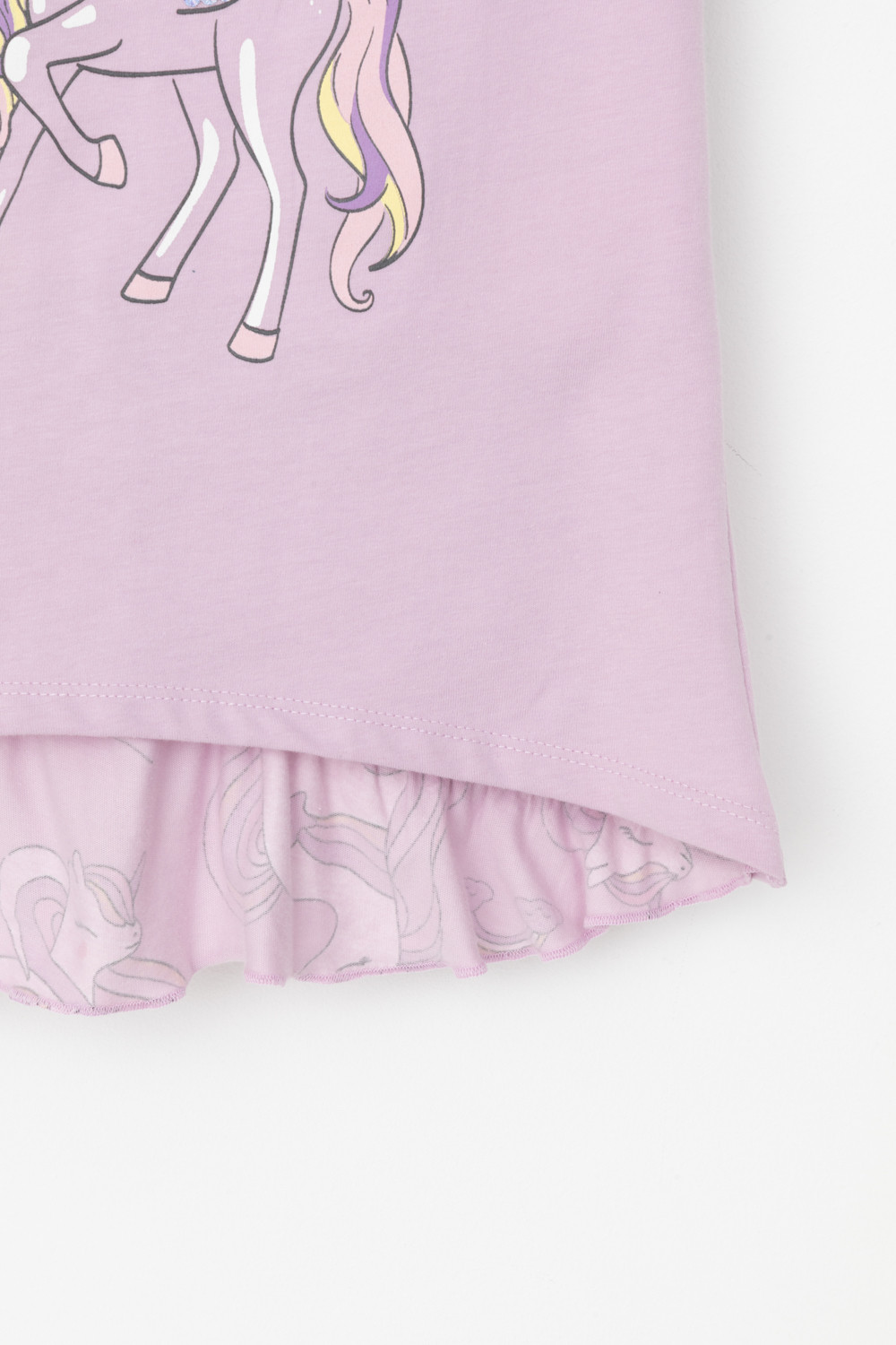 Туника для девочки из высококачественного трикотажного полотна. Оригинальные принт и набивка выполнены из стойких текстильных гипоаллергенных красителей. Для удобства одевания на плече в размерах 92 и 98 есть застежка на кнопки.